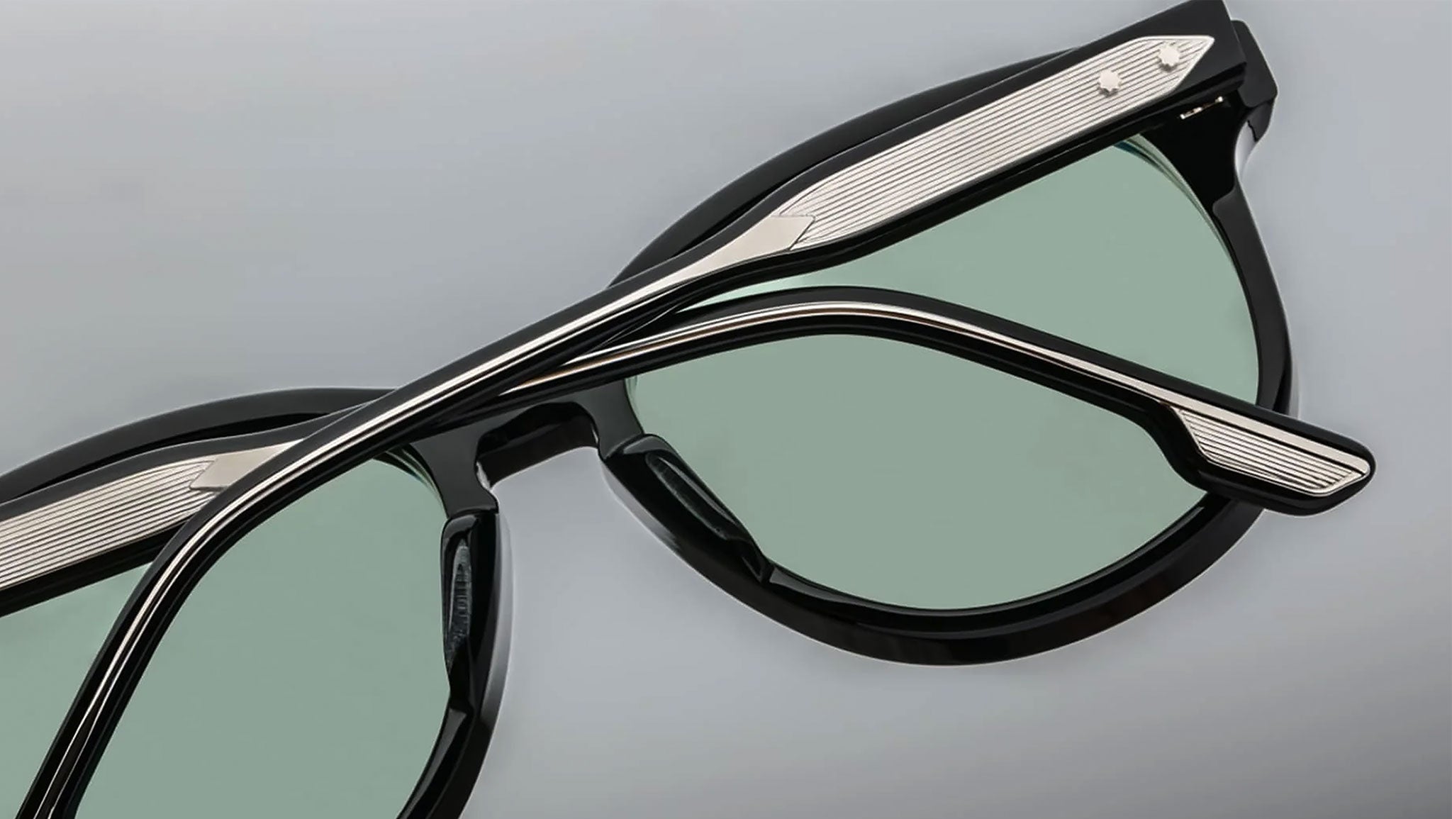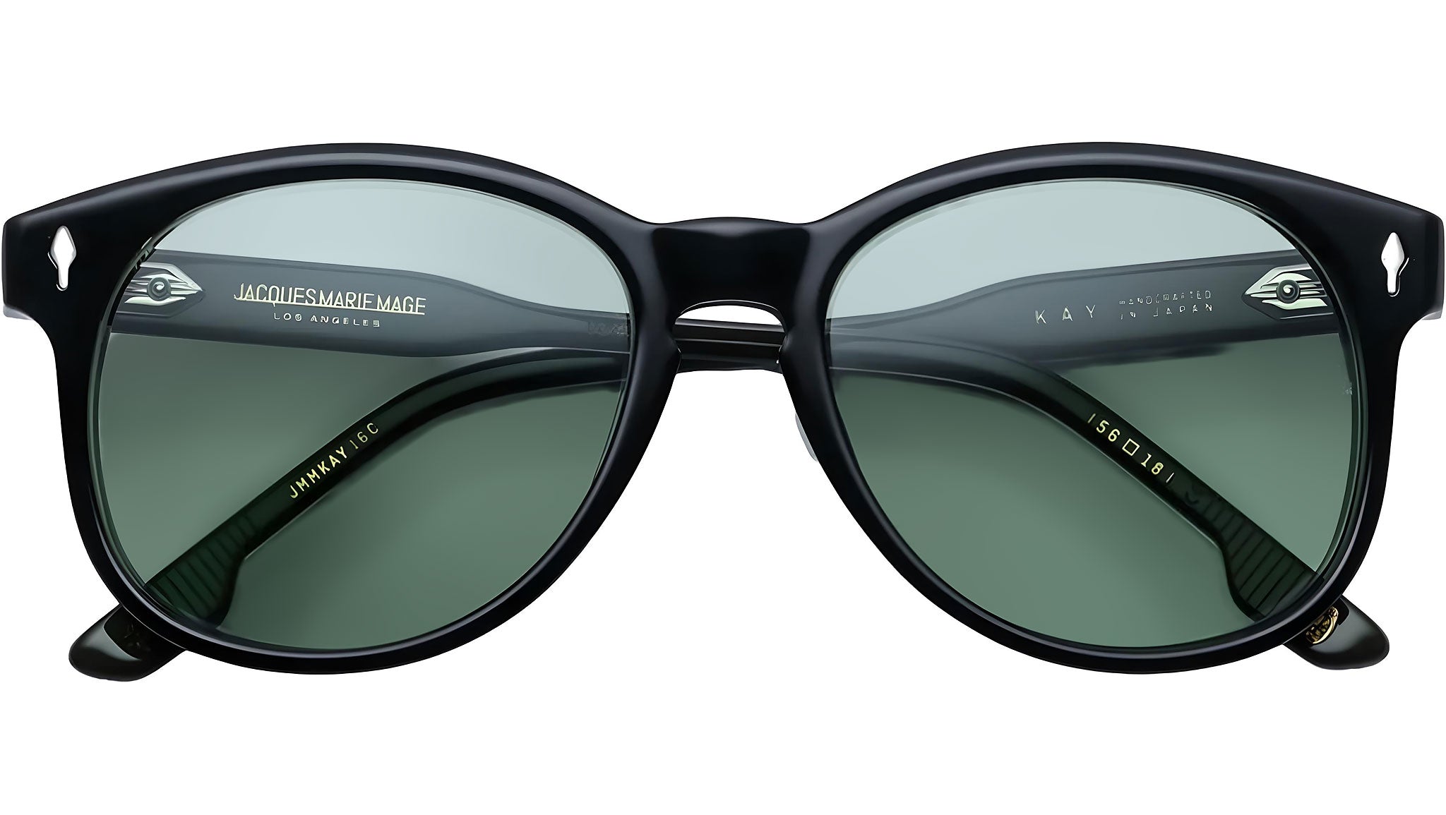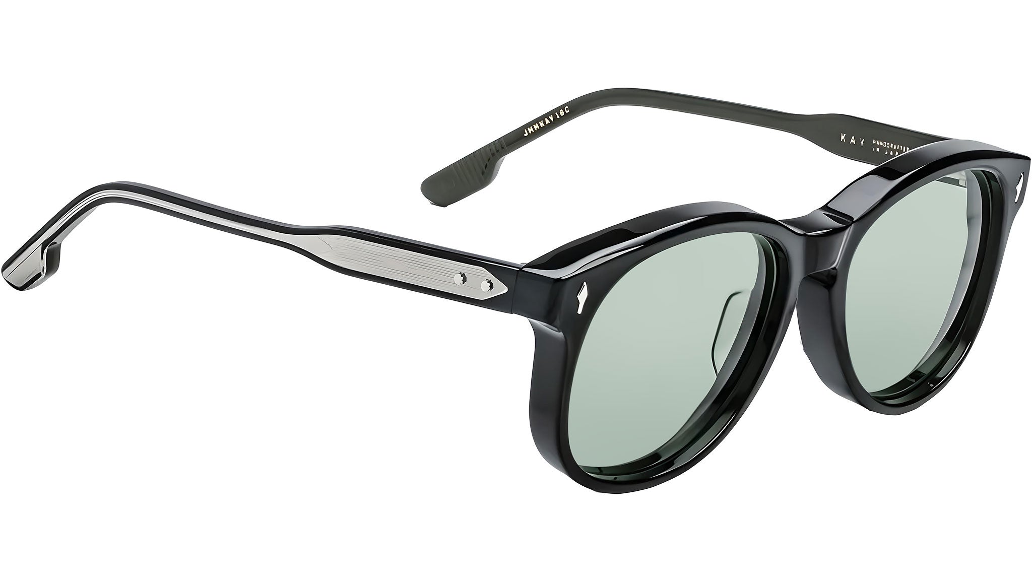 Black 10mm cured cellulose acetate frame with custom double-laminated acetate temples, accented by sterling silver precious metal hardware and fern green glass lenses. Features include a sterling silver signature arrowhead front pin, exposed Vauxhall wirecore, and a silver tension-secured custom 5-barrel hairline hinge. The 4-base lenses offer a backside anti-reflective treatment, delivering 100% UV protection. Frame total width: mm.