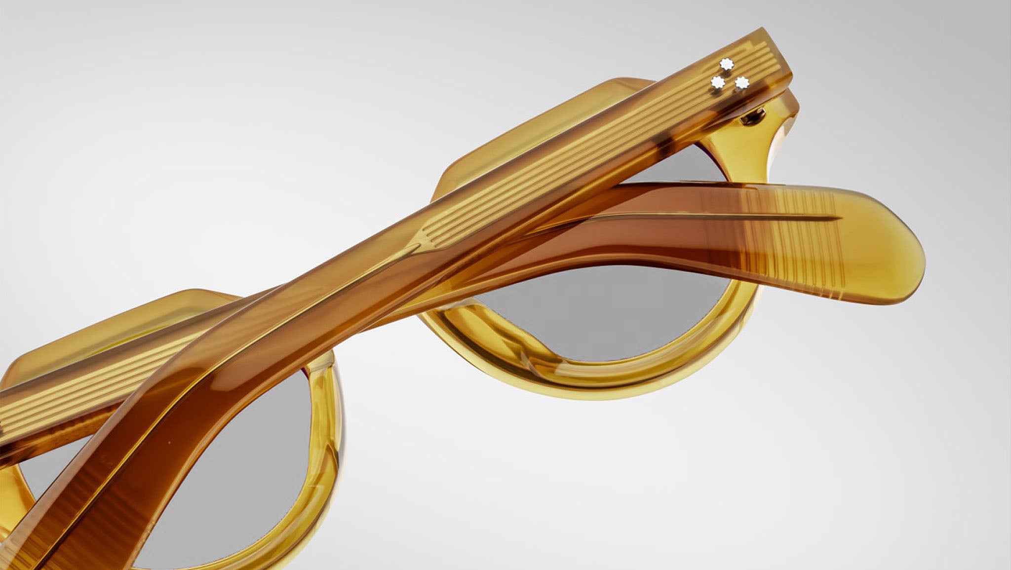 LIMITED PRODUCTION BATCH OF 350 PIECESYellow 10mm cellulose acetate frame with custom acetate temples featuring precious metal hardware and demo lenses. Light gold signature arrowhead front pin, exposed wirecore, and light gold tension-secured custom 7-barrel hinge. Light gold domed 3D metal logo adds a refined detail.