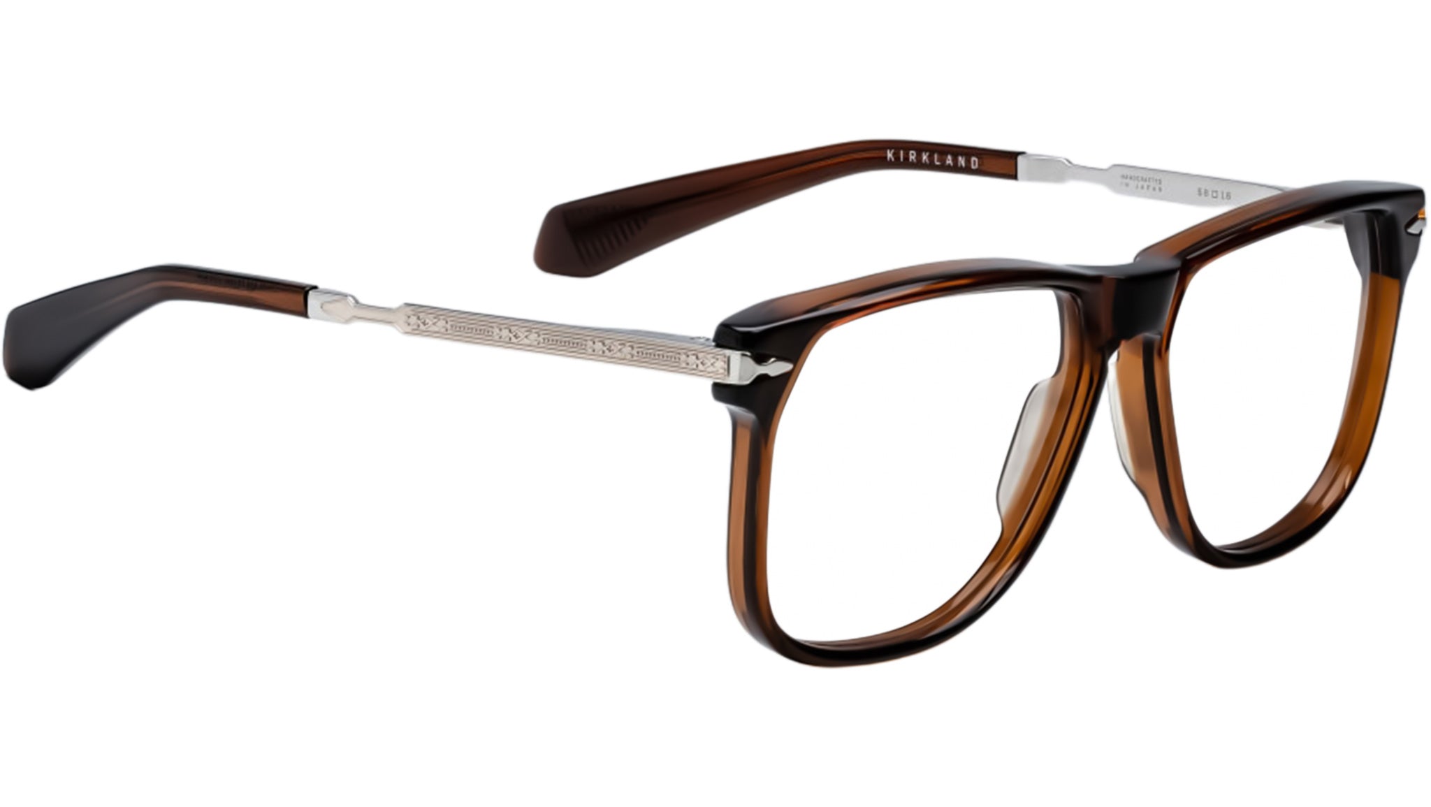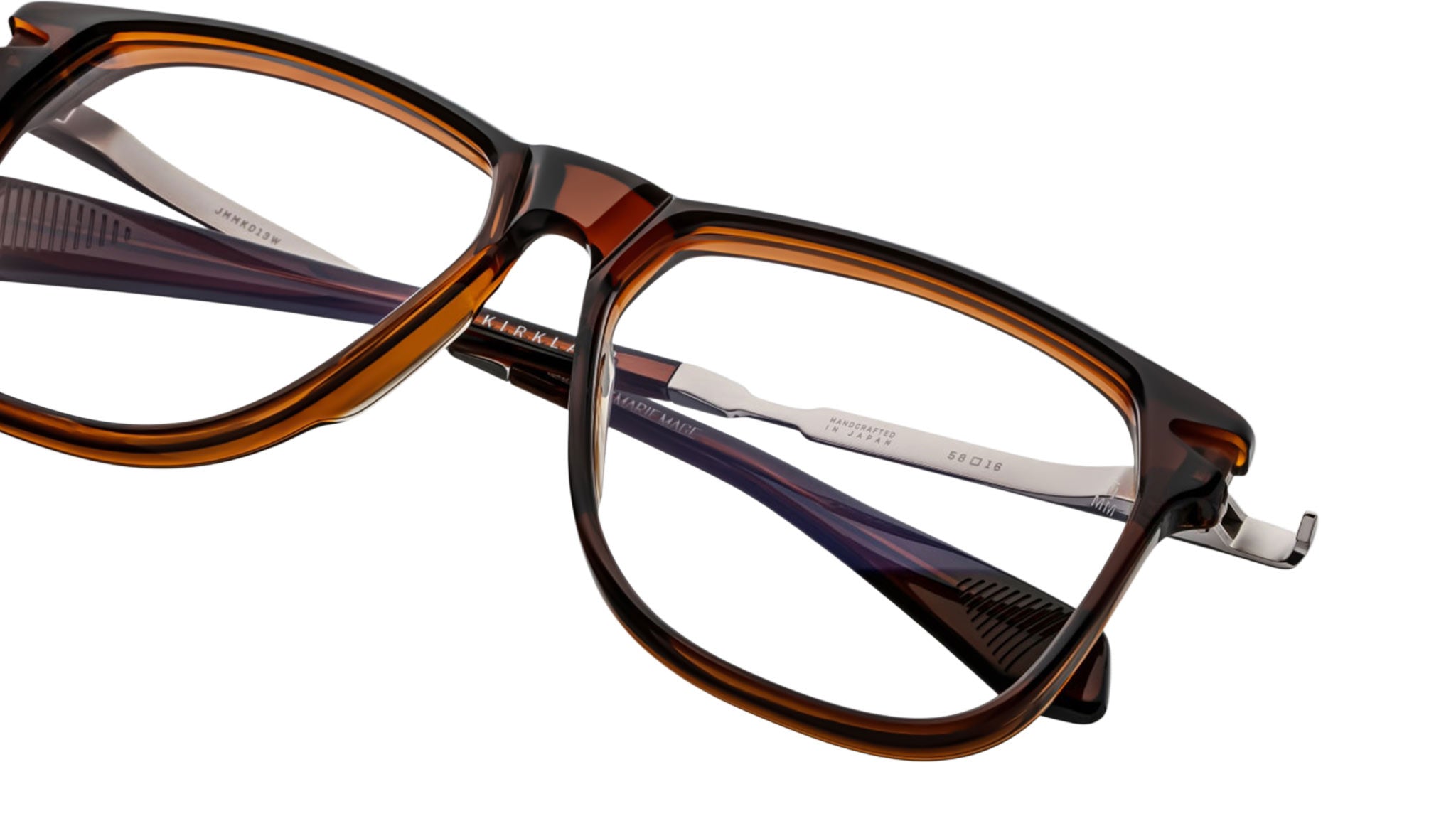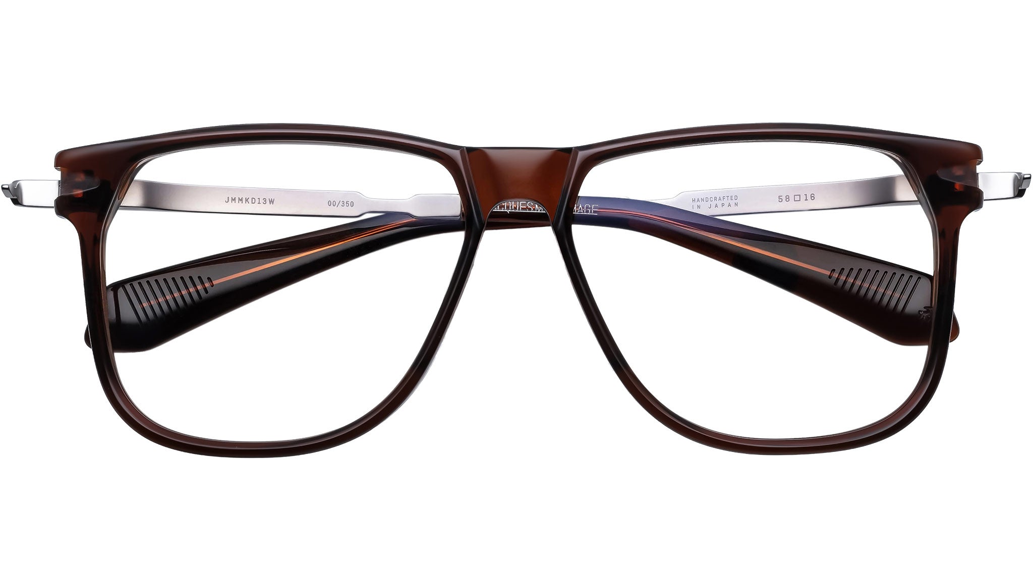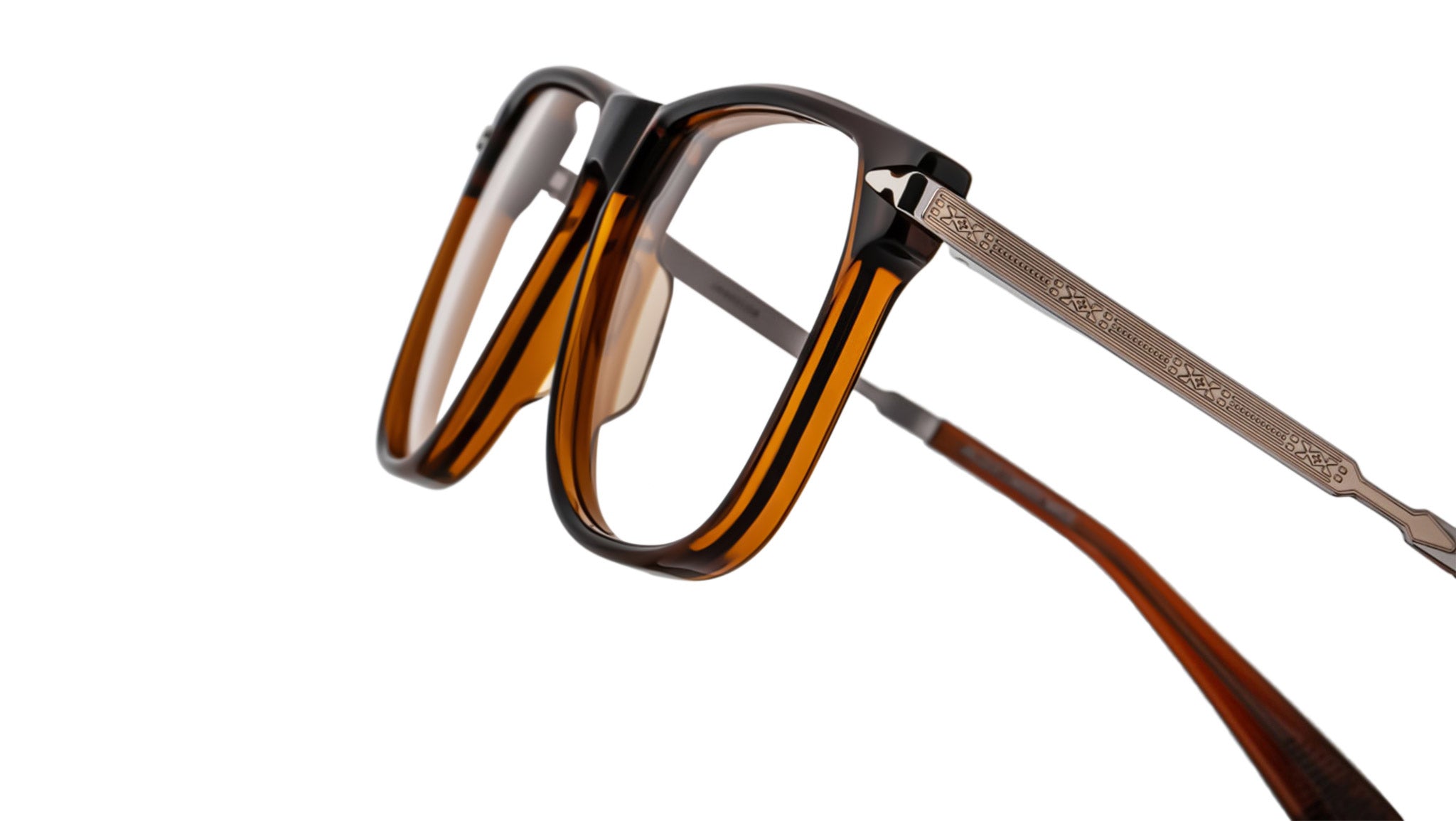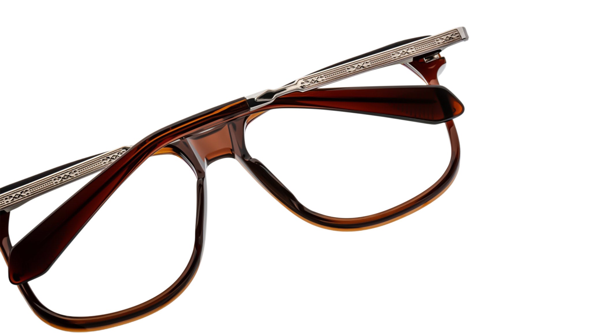 100% beta titanium frame in silver with light gold accents, brown cured cellulose acetate and light brown lenses. Silver engraved titanium temples with acetate tips. Silver tension-secured custom arrowhead monoblock hinge. Brown cellulose acetate details. Superlight brown CR-39 4 base lenses with backside anti-reflective treatment and 100% UV protection.