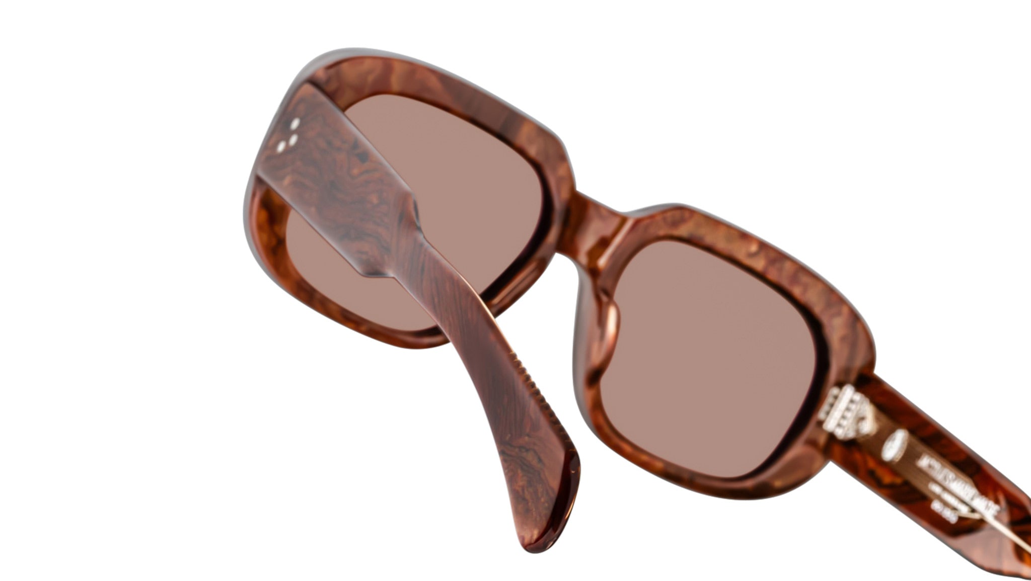 Brown 10mm cured cellulose acetate frame with custom double-laminated acetate temples and brown lenses. Exposed inner temple wirecore. Tension-secured custom 9-barrel hinges. Sweet brown CR-39 4-base lenses with backside anti-reflective treatment.