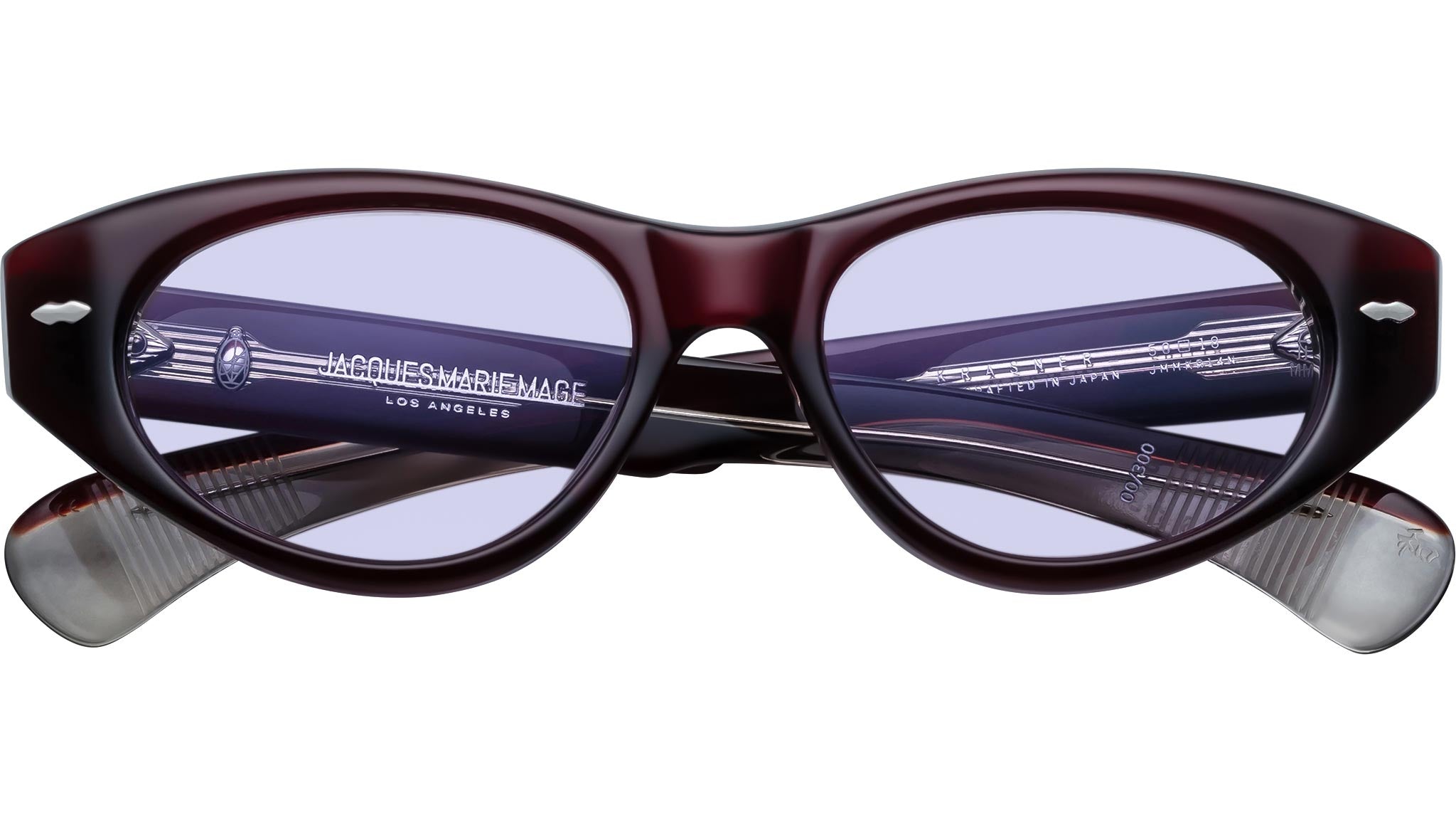 Jacques Marie Mage Krasner sunglasses are soft, mid-size cat-eye frames with an elegant oval lens shape, distinguished by precious metal double-arrowhead front pins and gently rounded paddle temples. Inspired by the expressive strength and rhythm of America’s great modernist painters, this limited-edition design reflects a balance of timeless style and refined artistic sensibility, offering a confident and sophisticated silhouette.
