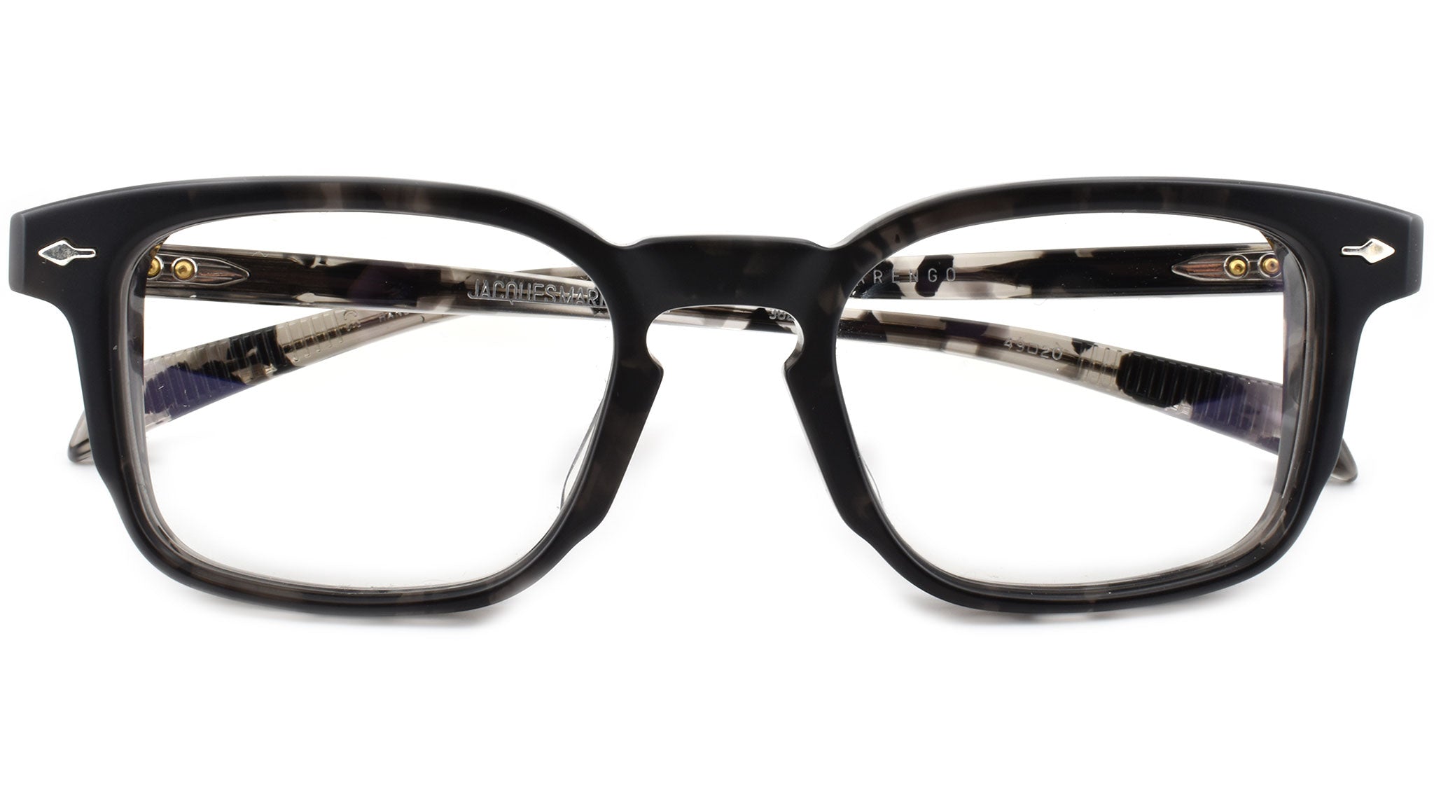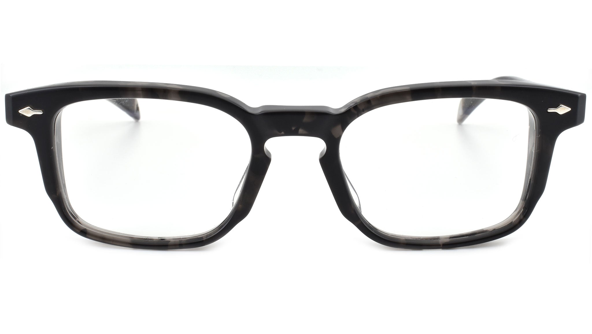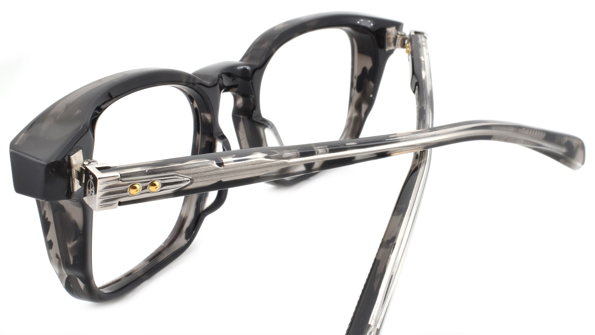 10mm block, black tortoise with clear matte acetate frame, custom double laminated acetate temples featuring precious metal hardware. Hardware: matte dark gunmetal. Sterling silver signature arrowhead front pin. Silver custom hairline engraved wire core design. Silver tension-secured custom hinge with spur-shaped rivets. Burgundy domed 3d metal cameo logo. 6 base CR39 lens with backside anti-reflective treatment.