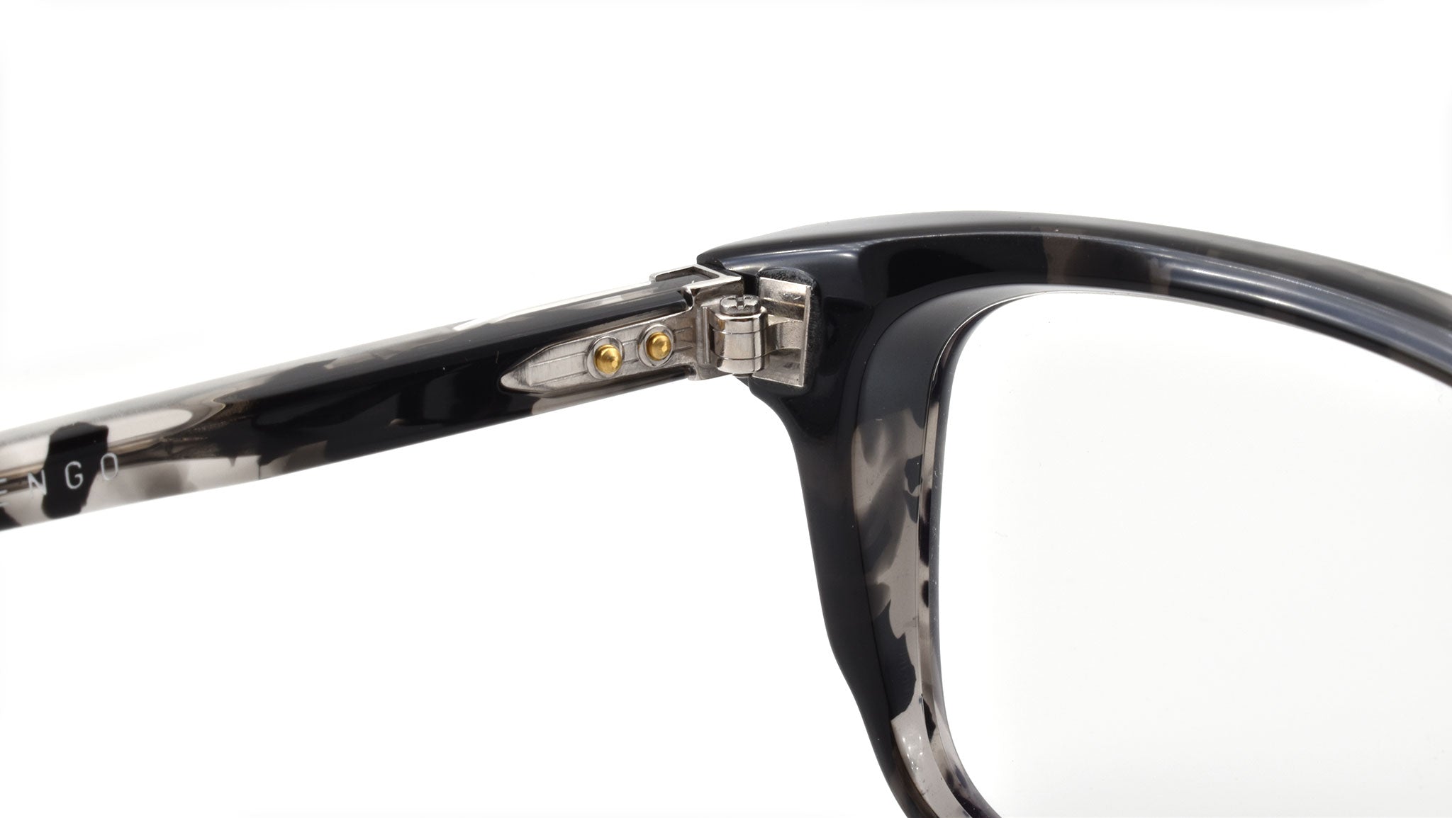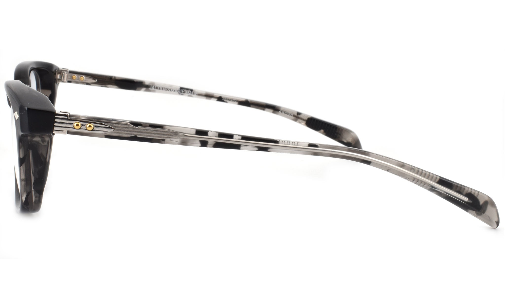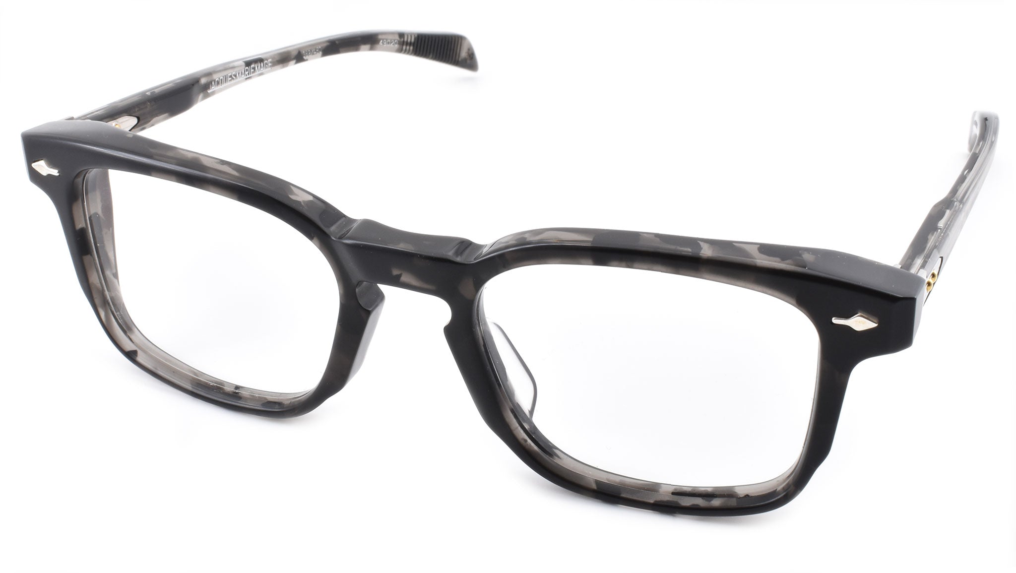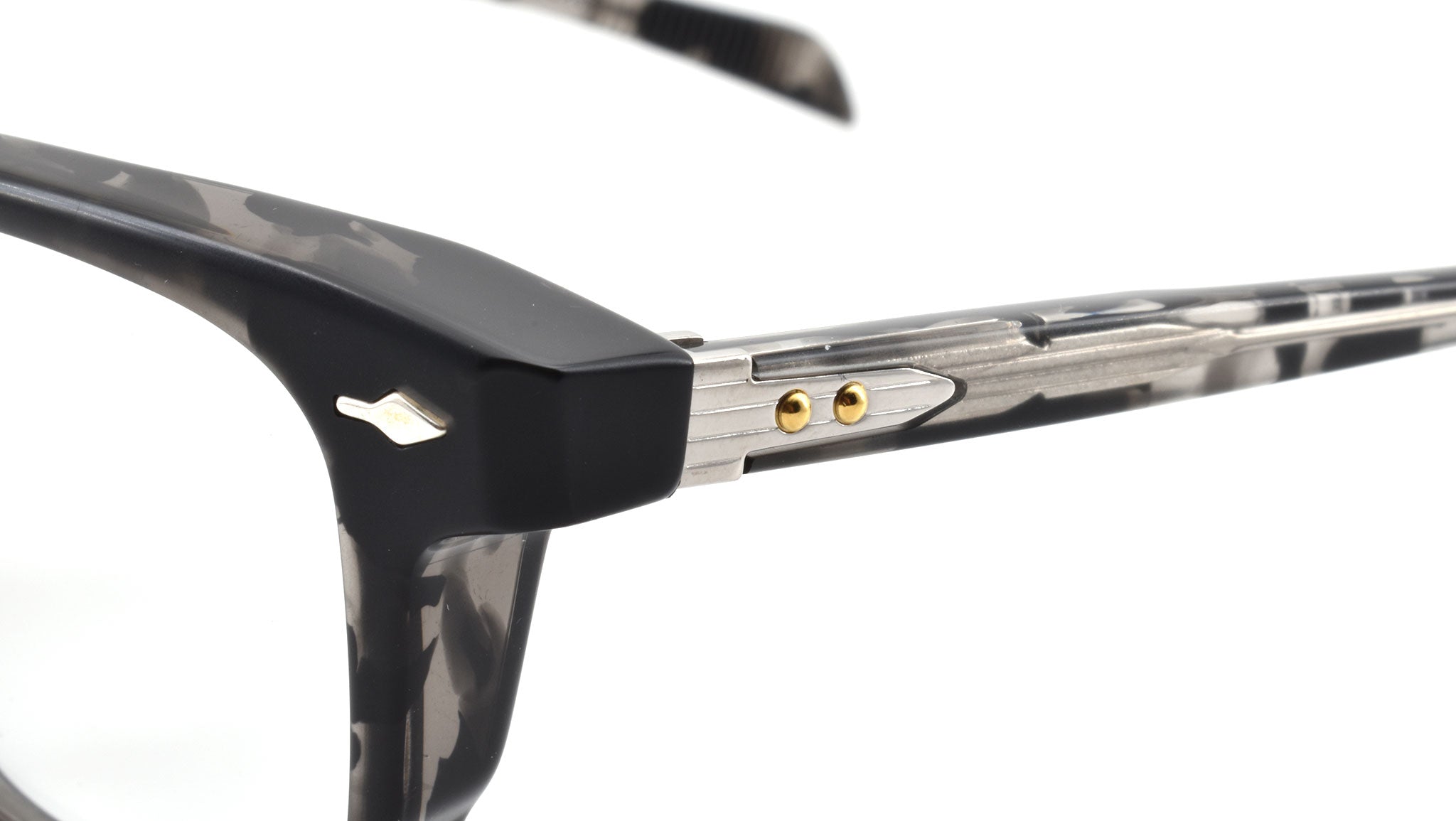 10mm block, black tortoise with clear matte acetate frame, custom double laminated acetate temples featuring precious metal hardware. Hardware: matte dark gunmetal. Sterling silver signature arrowhead front pin. Silver custom hairline engraved wire core design. Silver tension-secured custom hinge with spur-shaped rivets. Burgundy domed 3d metal cameo logo. 6 base CR39 lens with backside anti-reflective treatment.