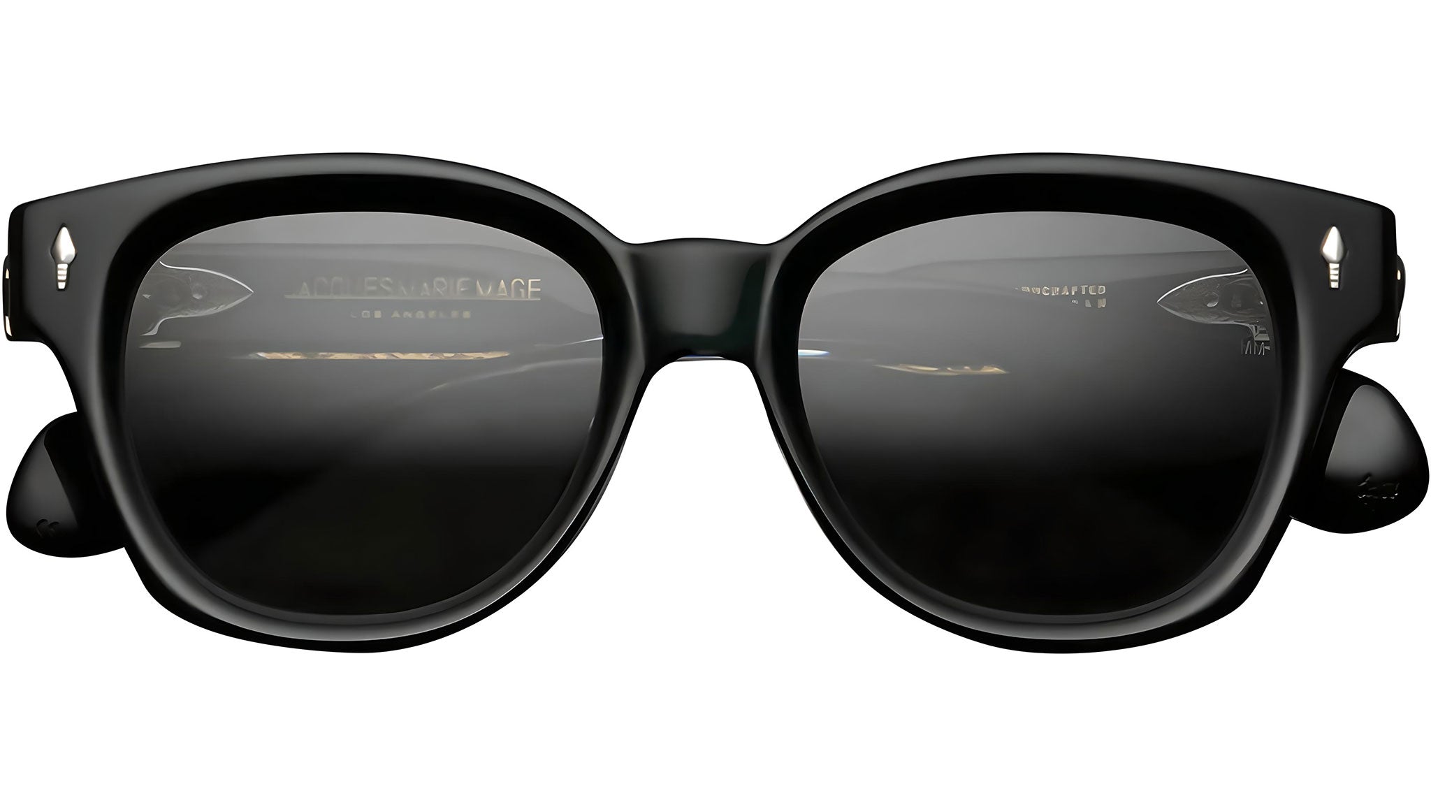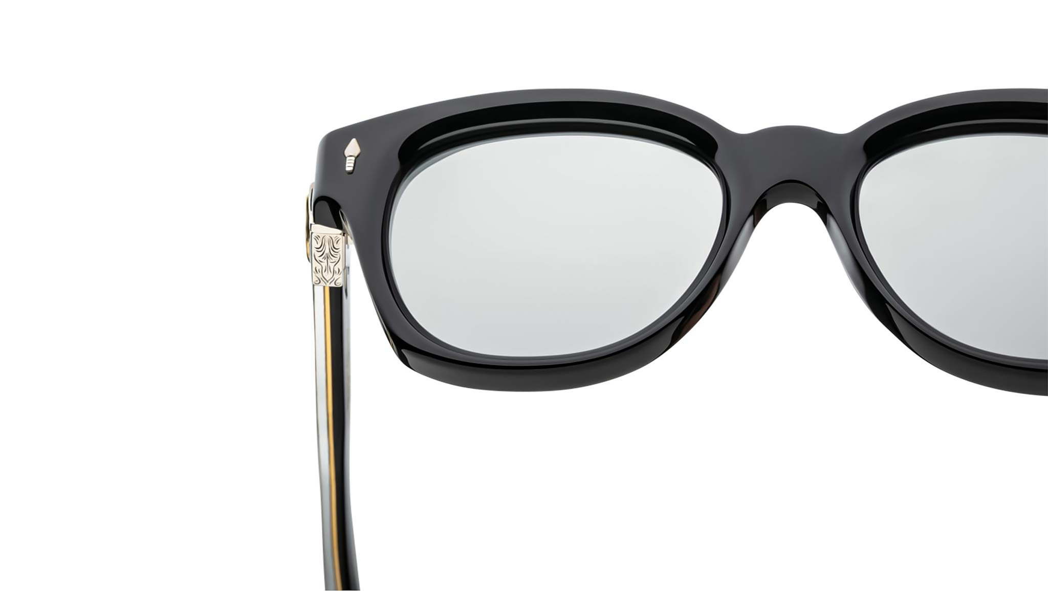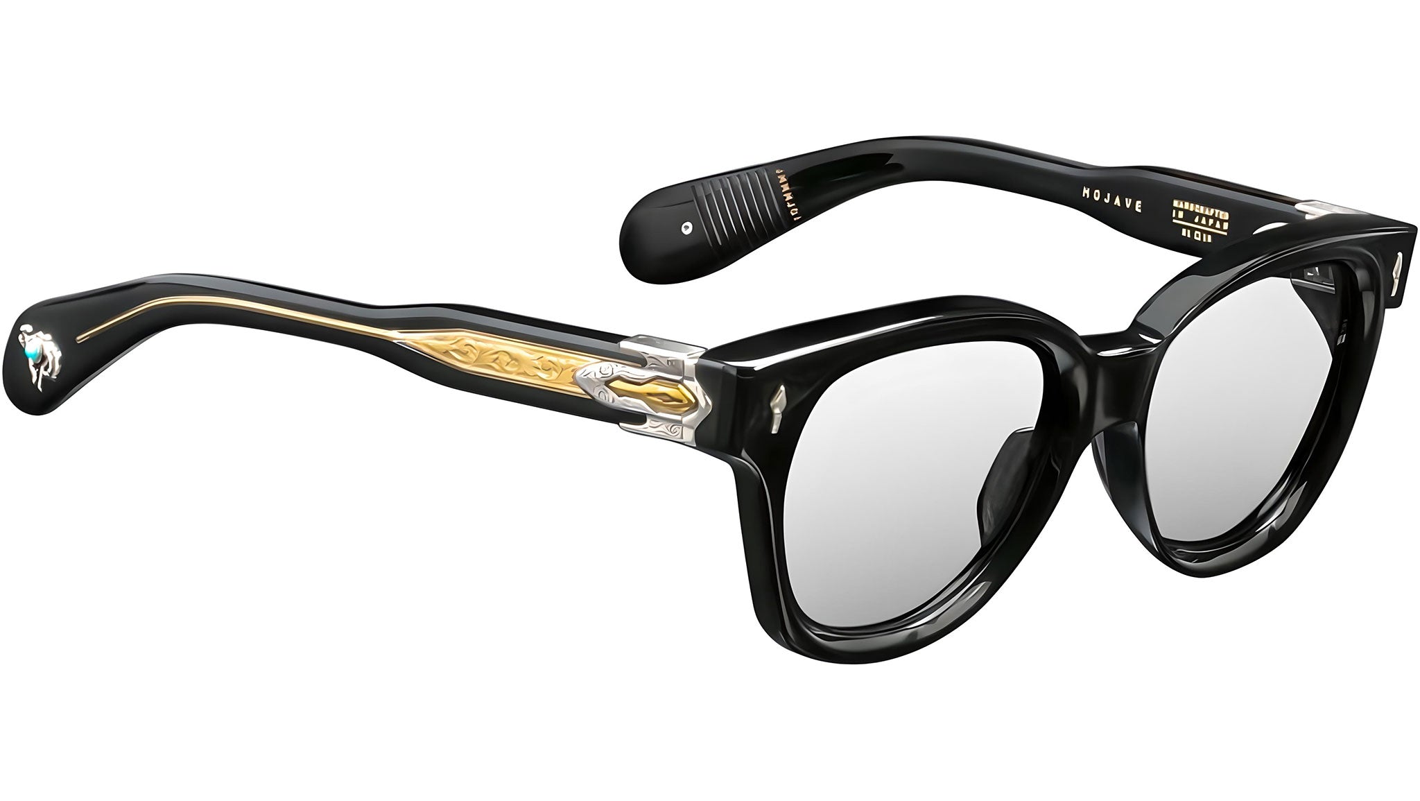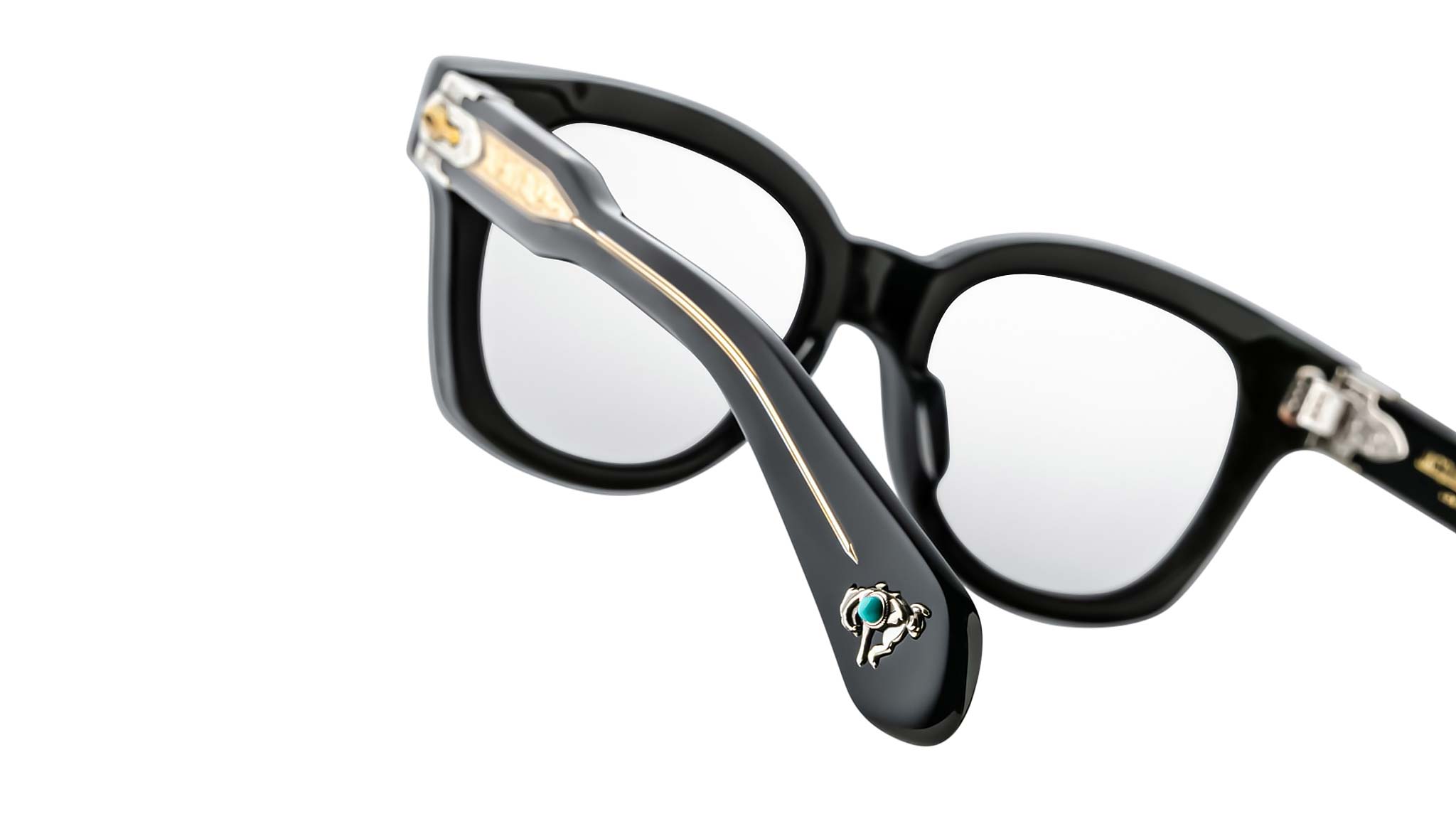 Jacques Marie Mage Mojave Noir RX. Oversized, Wellington-shaped glasses featuring expressively engraved, precious metal temple embellishments, and bronco cameo with turquoise inlay at the temple tip. Limited production batch of 200 pieces.