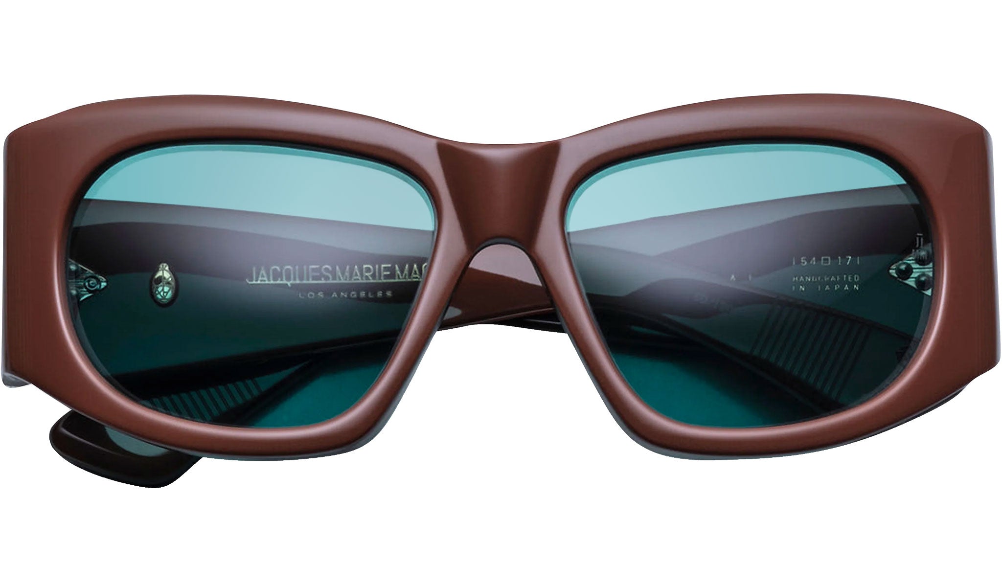 Featuring a brown 8mm cured cellulose acetate wrap frame with double laminated acetate temples, this eyewear is fitted with green lenses. A light gold wirecore, visible and engraved, connects to a light gold tension-secured custom seven-barrel hinge for secure wear. The deep grass CR-39 lenses are crafted with a 6 base curvature and treated with an anti-reflective coating on the back to enhance the visual experience.
