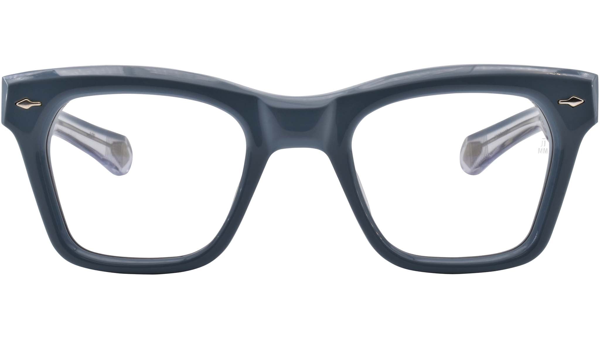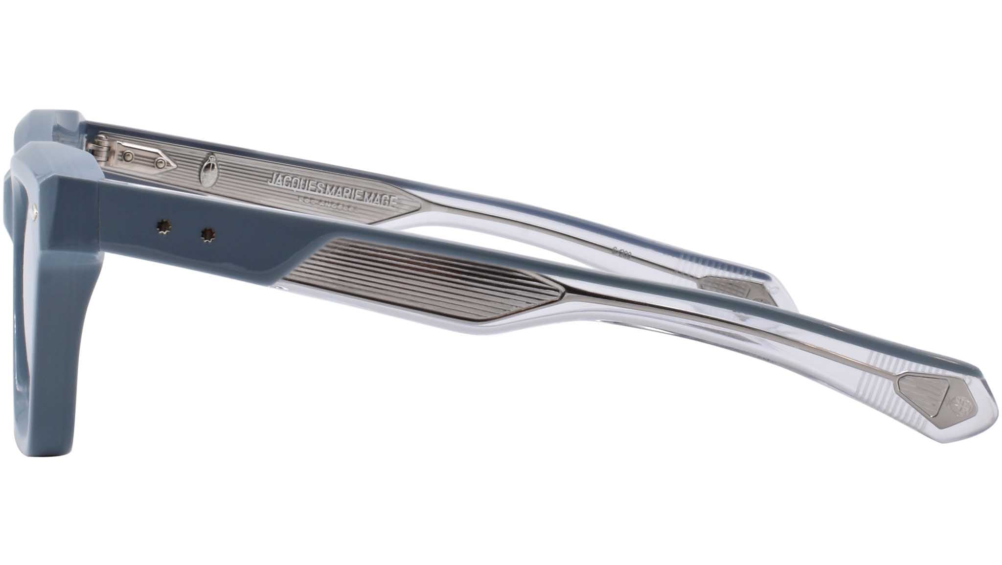 The glasses feature a blue 10mm cured cellulose acetate frame with custom double laminated acetate temples and superlight blue lenses, complemented by an exposed silver wirecore with hairline engraving. They're equipped with a silver tension-secured custom 5 barrel hinge, superlight blue CR-39 lenses, a 6 base lens with backside anti-reflective treatment, and a rectangular frame shape.