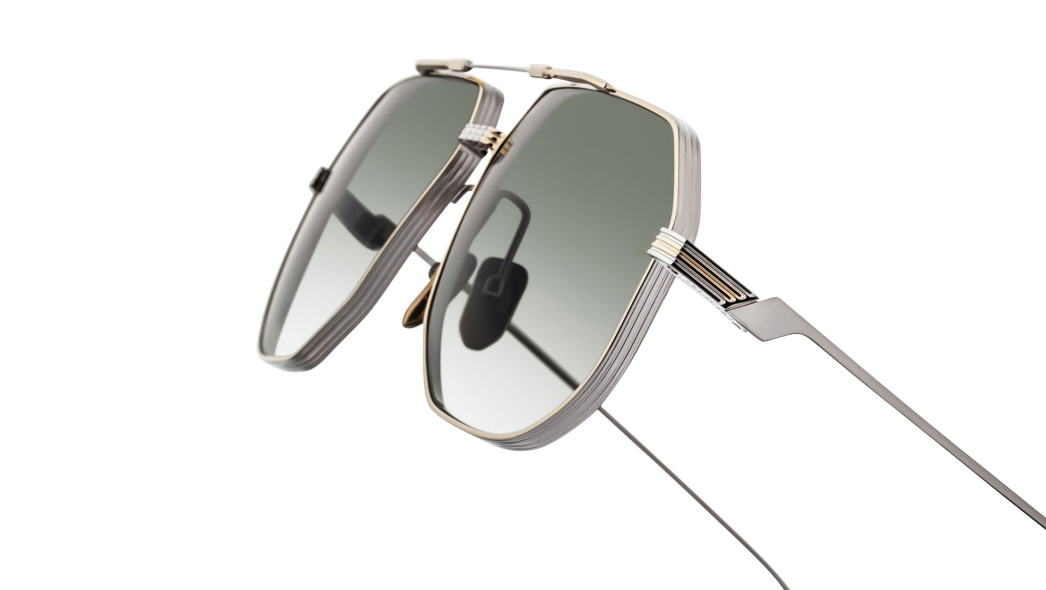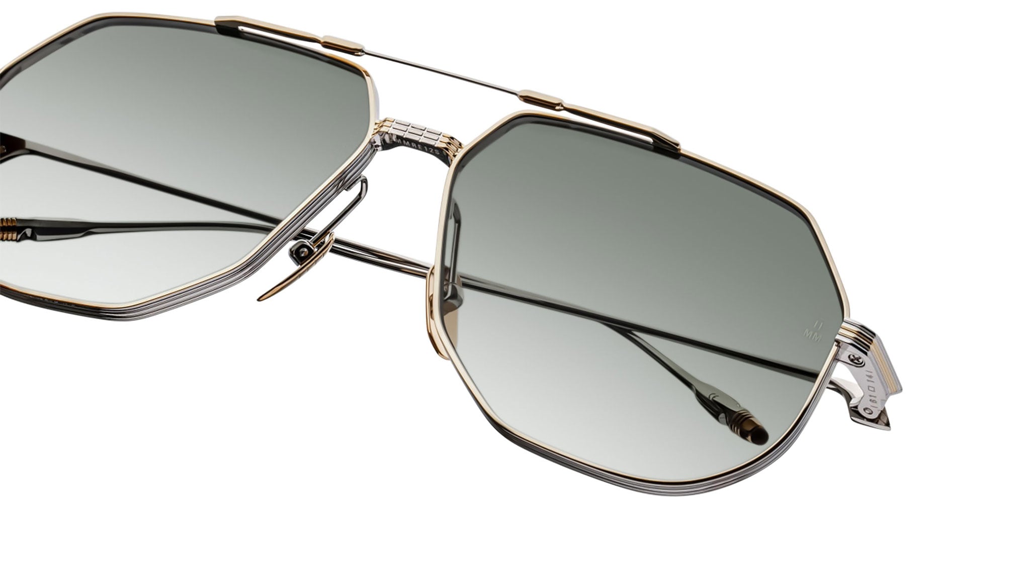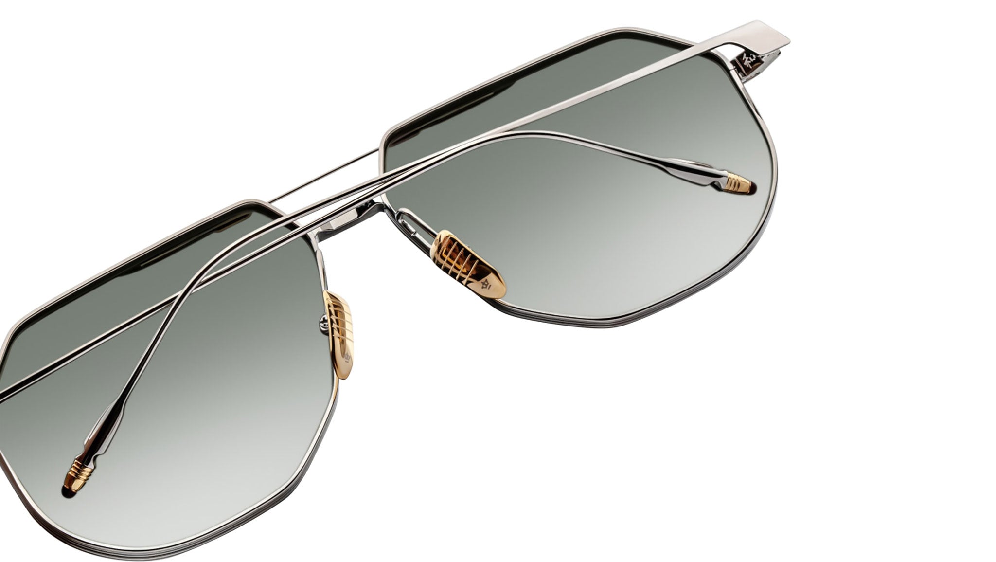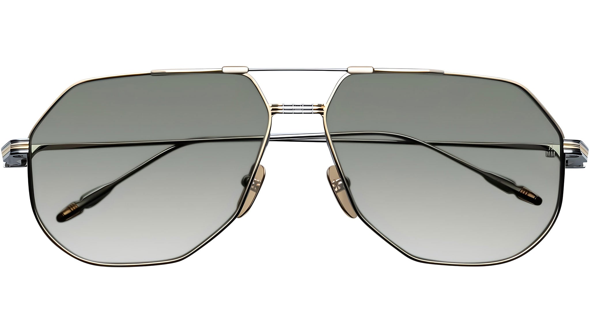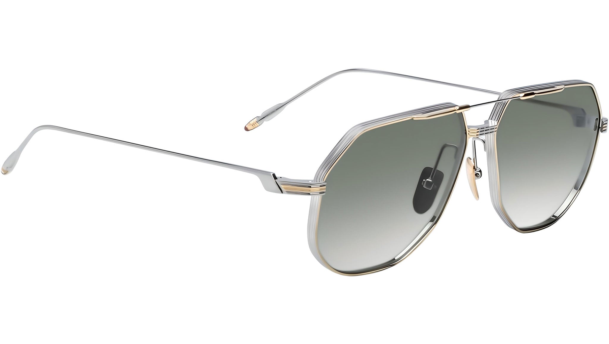 LIMITED PRODUCTION BATCH OF 500 PIECESSilver and moon gold 100% beta titanium frame with green lenses. Features silver and moon gold titanium wire temples with burgundy tailfin tips, a silver and moon gold tension-secured custom deco monoblock hinge, and custom nose pads with logo and hairline engraving. Light bottle green CR-39 4 base lenses with backside anti-reflective treatment ensure clarity and comfort. Frame shape: aviator. Provides 100% UV protection.