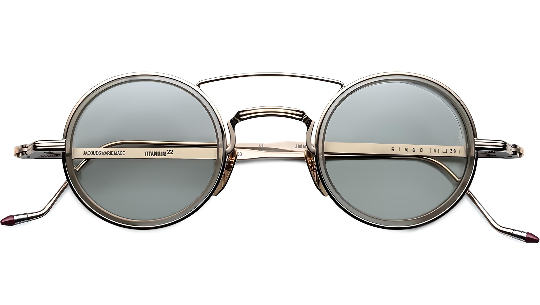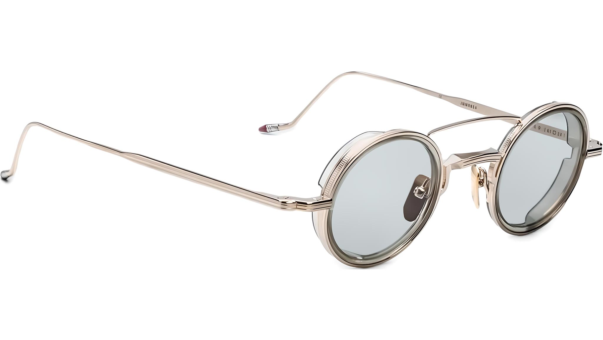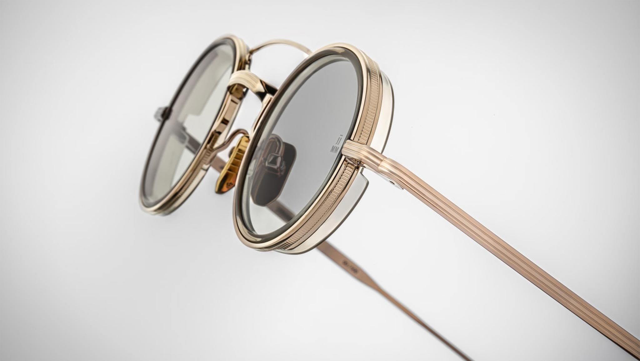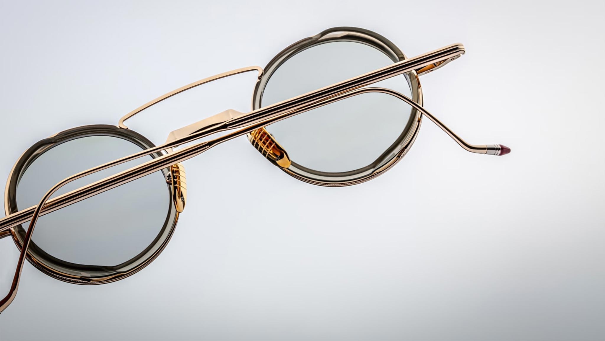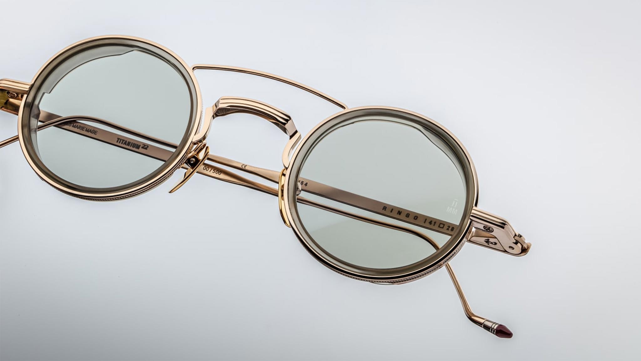 A refined light gold 100% beta titanium frame paired with green mist CR-39 2-base lenses featuring backside anti-reflective treatment. Highlighted by translucent creme acetate eyerim inserts, custom light gold hairline hinges, and burgundy epoxy temple tips. Includes custom nose pads with logo and hairline engraving. Circular frame design offering 100% UV protection, blending elegance and functionality seamlessly.