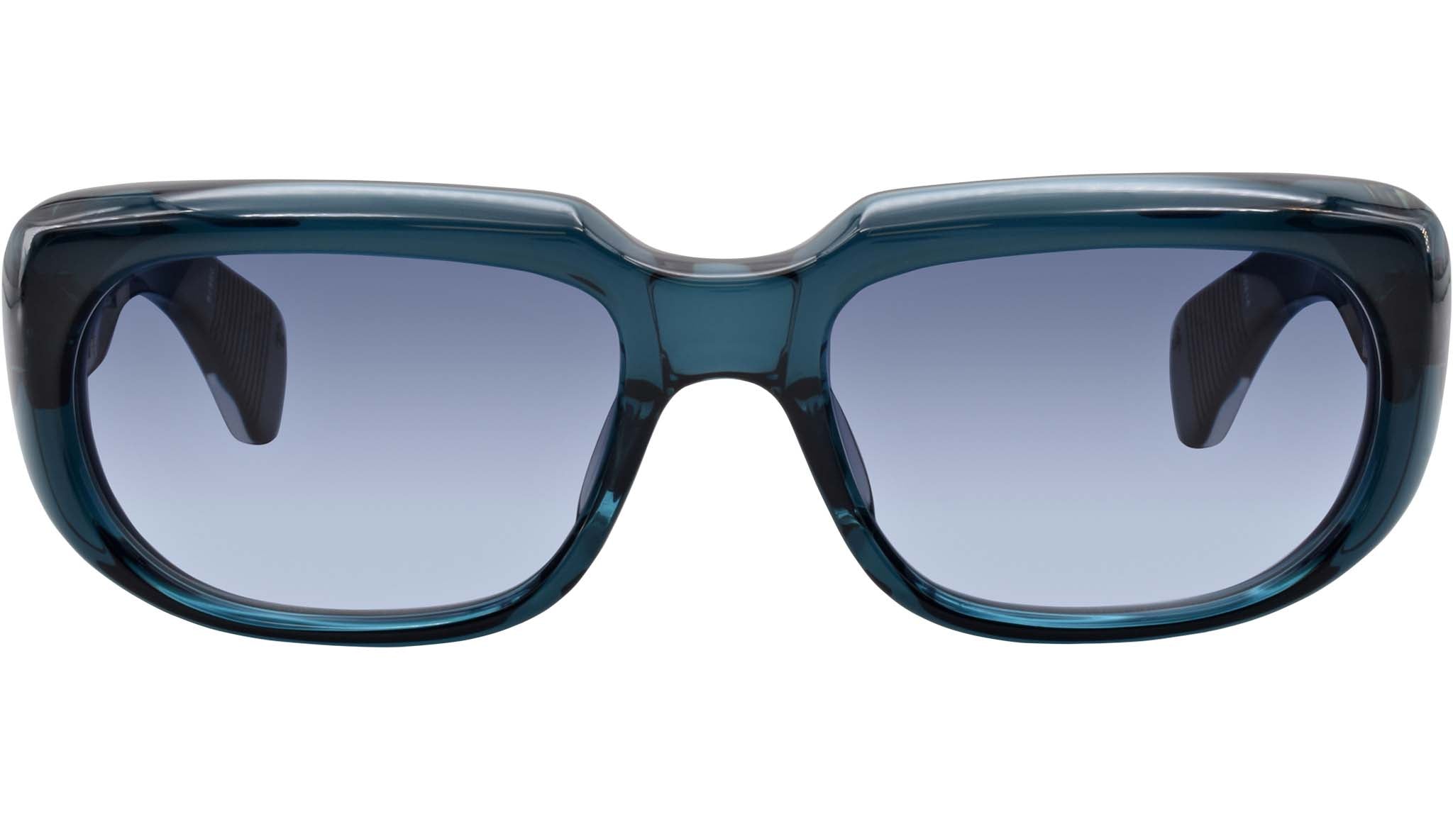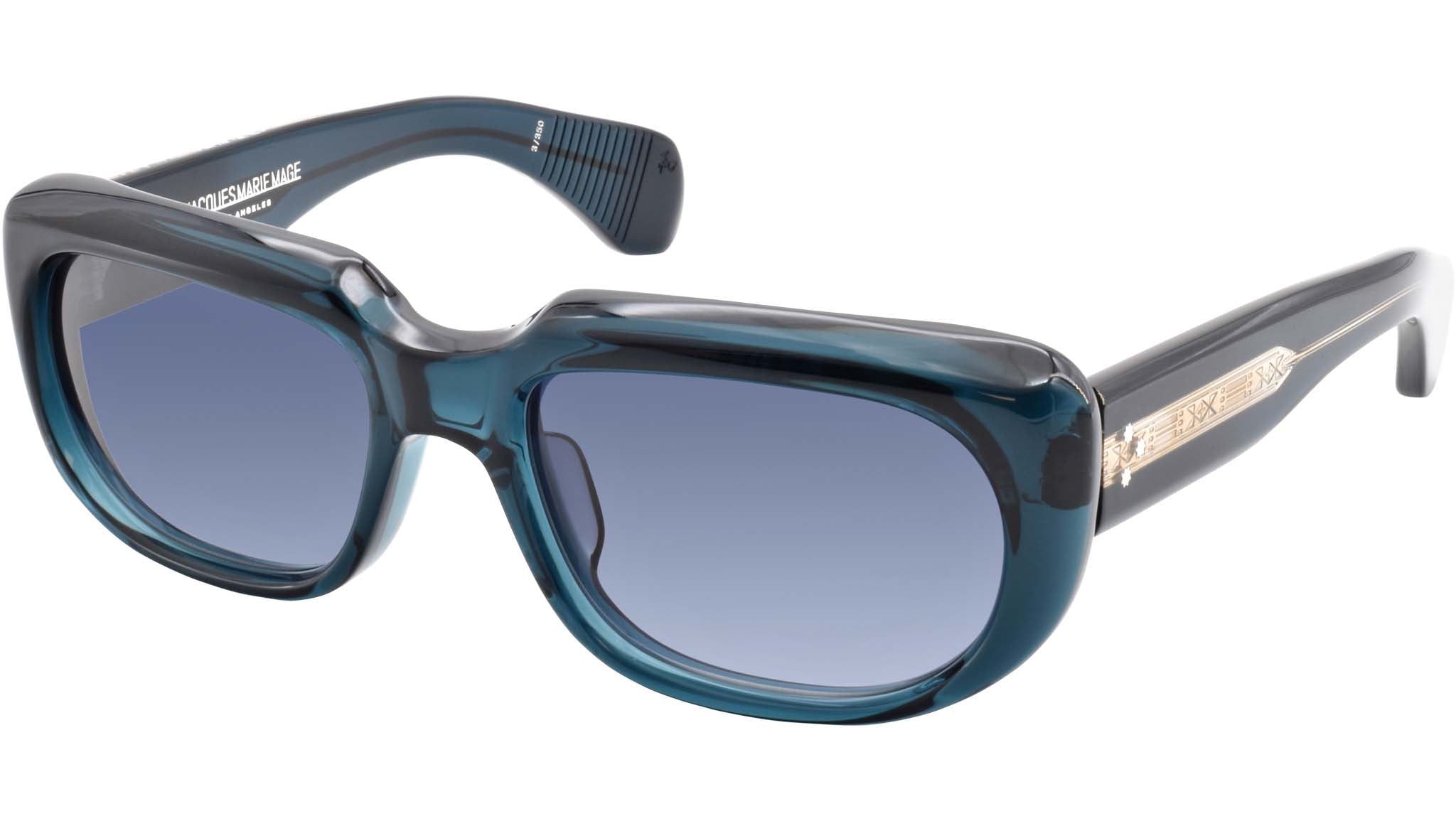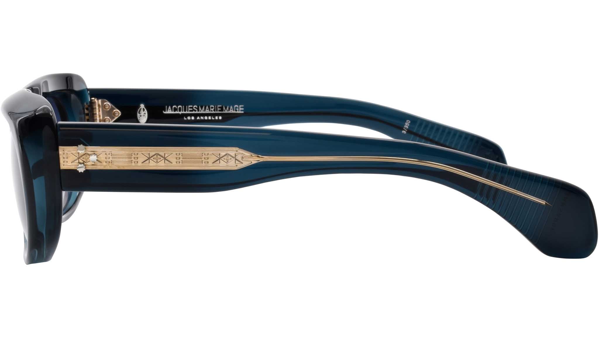 Indigo 10mm cured cellulose acetate frame with custom double laminated acetate temples, accentuated by precious metal hardware and blu gradient lenses. The inner light gold wire core exhibits custom native-inspired filigree engraving, while a light gold tension-secured custom 9-barrel hinge ensures durability. Adorned with blue 6 base CR-39 lenses featuring a backside anti-reflective treatment - a masterpiece of craftsmanship and style.