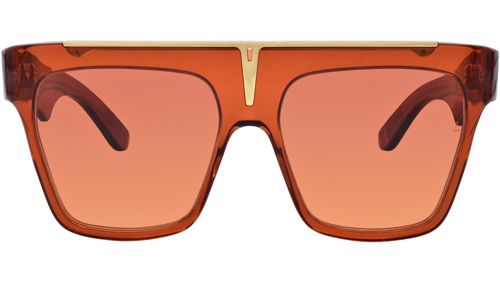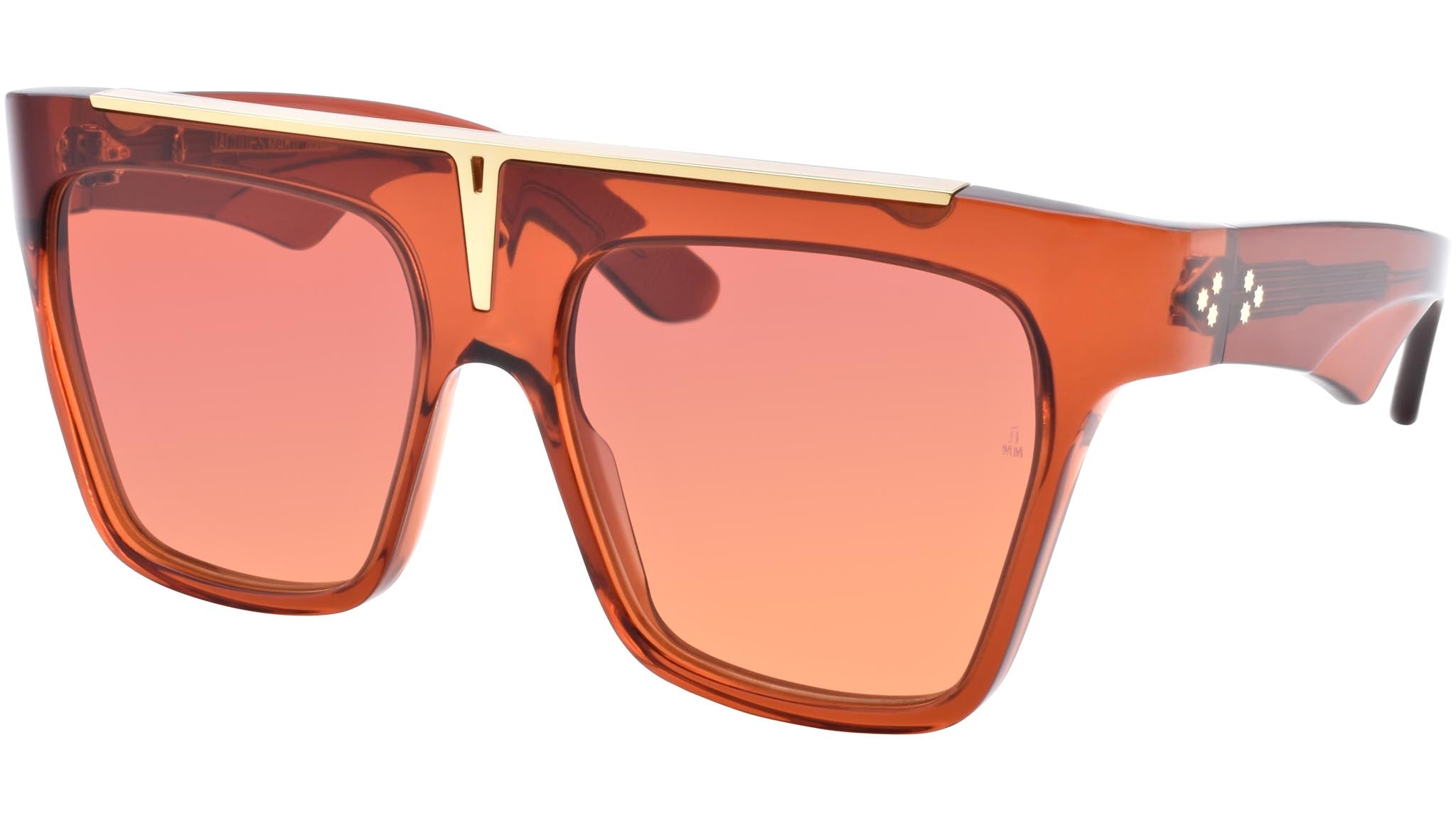 Orange 7mm cured cellulose acetate frame with custom acetate temples featuring precious metal hardware and orange gradient lenses. Gold hidden wire core with custom hairline filigree engraving. Gold tension-secured custom 7-barrel hinge. Gold top bar insert. Orange triple gradient CR-39 2 base lens with backside anti-reflective treatment. 100% UV protection.