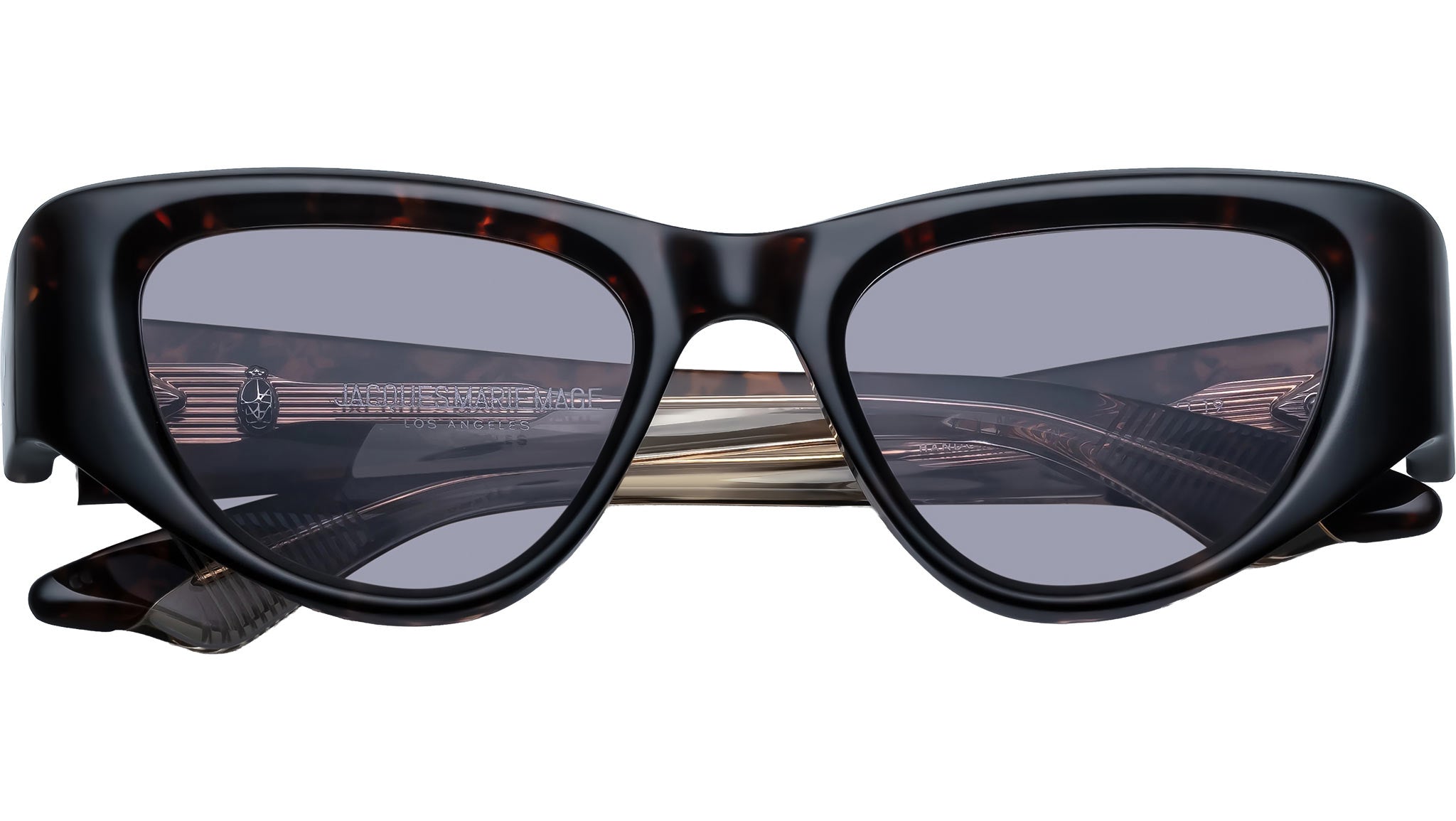 The Jacques Marie Mage Seymour sunglasses are a sultry, medium-sized cat-eye silhouette featuring a soft wrap-around design, a slyly arched brow, and an alluring V-shaped bridge, all accented by signature polished metal embellishments. Handcrafted in Italy, these mid-'90s-inspired spectacles evoke supermodel sophistication and the bold spirit of an era when fashion icons commanded global attention. Combining refined curves with luxurious detailing, the Seymour embodies a timeless celebration of extravagance and aspiration.