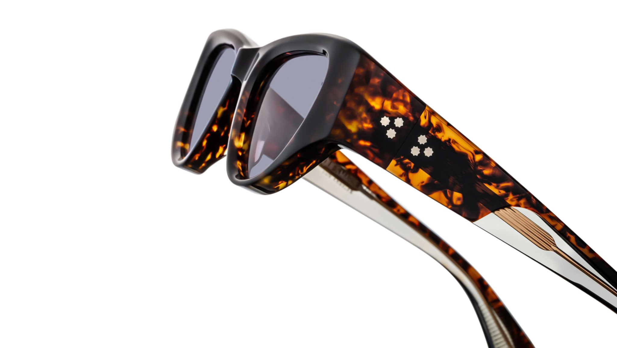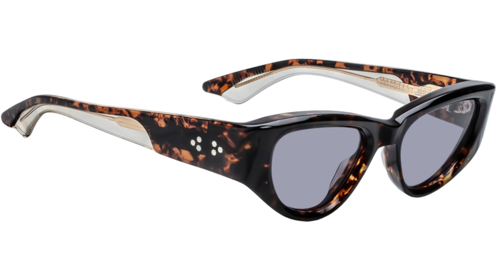 Crafted from Havana 10mm cured cellulose acetate, this cat-eye frame features custom double-laminated acetate temples with precious metal hardware and Nimbus CR-39 2-base lenses providing 100% UV protection. The design is refined with a hidden light gold cantilever wirecore and light gold tension-secured custom 7-barrel hairline hinges, ensuring durability and precision. Completed with a backside anti-reflective treatment, the rich purple lenses enhance the sculptural silhouette, showcasing elegant craftsmanship and bold, sophisticated style.
