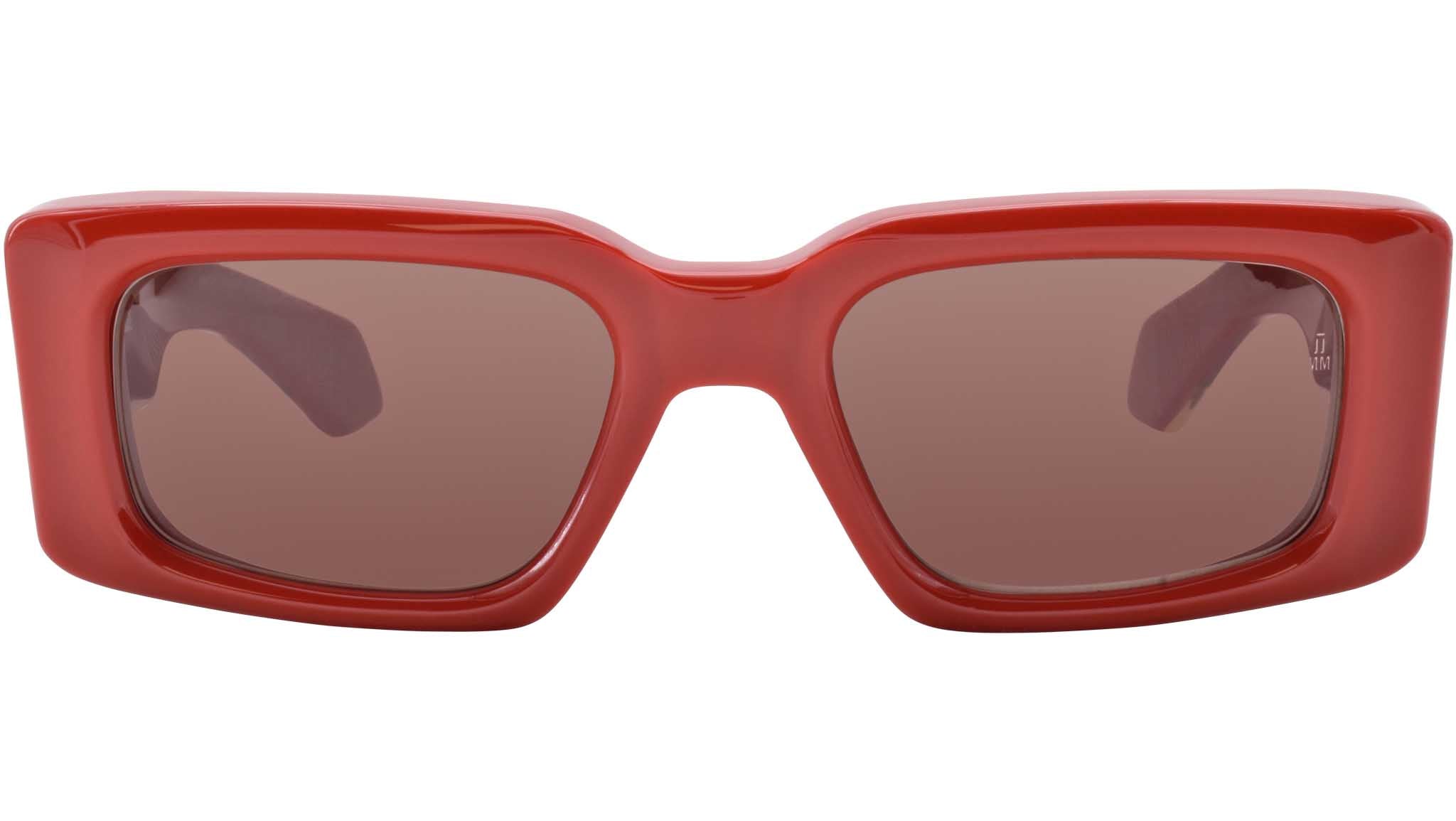 Vermillion red 9mm cured cellulose acetate frame custom acetate temples and brown lenses. Exposed wirecore. Silver tension secured custom 9 barrel hinge. Deep brown CR-39 8 base lens with backside anti-reflective treatment. 100% UV protection.