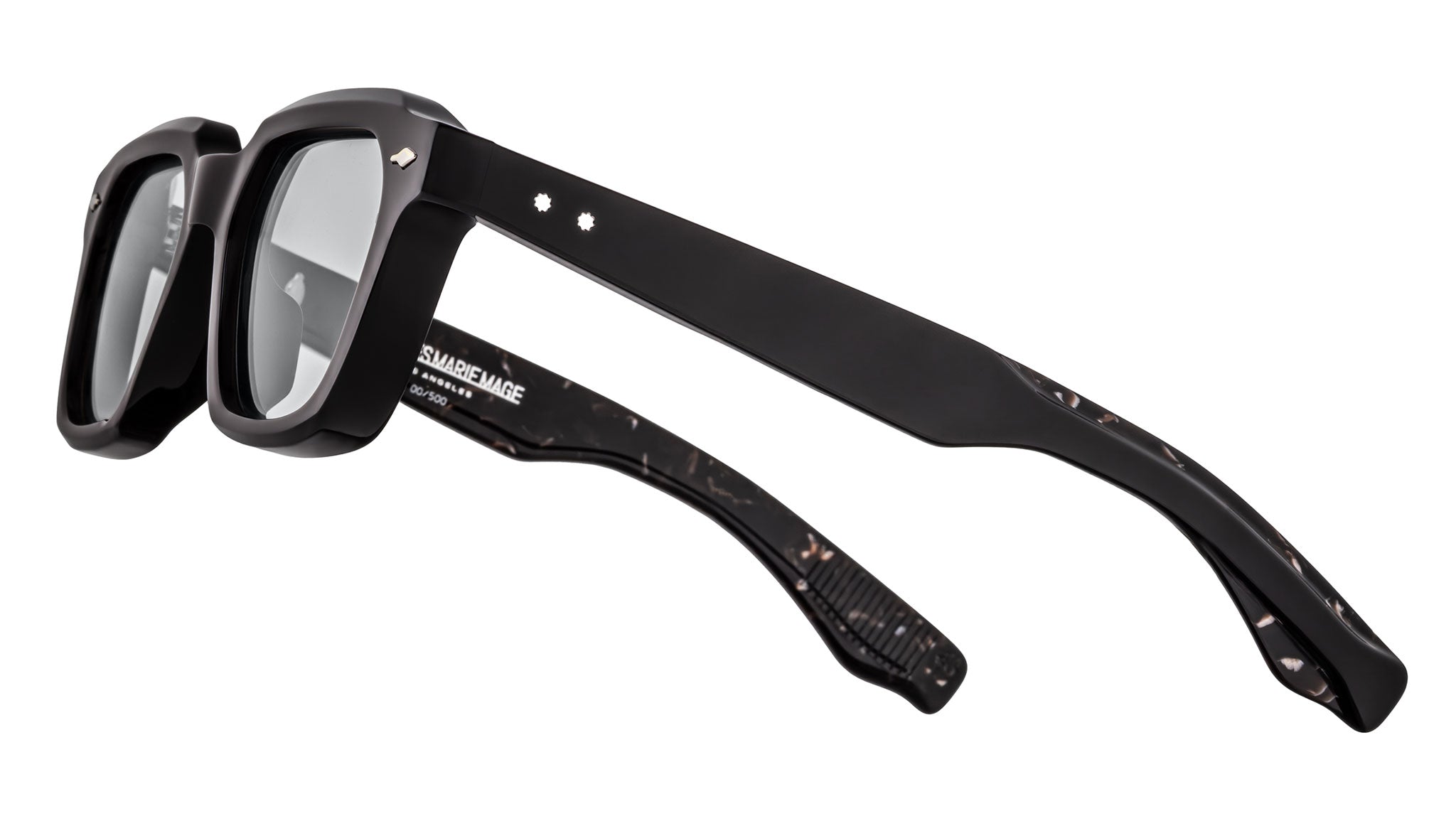 The Jacques Marie Mage Tomlin optical frame is a classic, square silhouette inspired by 1950s design, offering a medium fit and refined mid-century appeal. It features signature arrowhead front pins, spur-shaped rivets, and 'Classic' wirecores with subtle Art Deco-inspired detailing, reflecting a quiet pursuit of perfection through balanced form and enduring elegance.