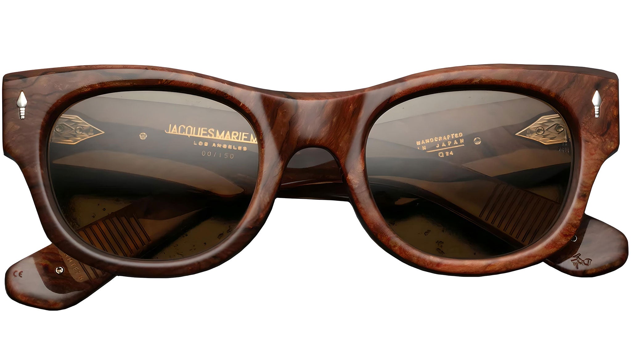 Jacques Marie Mage Truckee Burlwood. Late-‘50s-inspired glasses with subtle cat-eye and soft lens shape, featuring ornate double-arrowhead temple motif and “blue flower” cameo with turquoise inlay at the temple tip.. Limited production batch of 150 pieces.