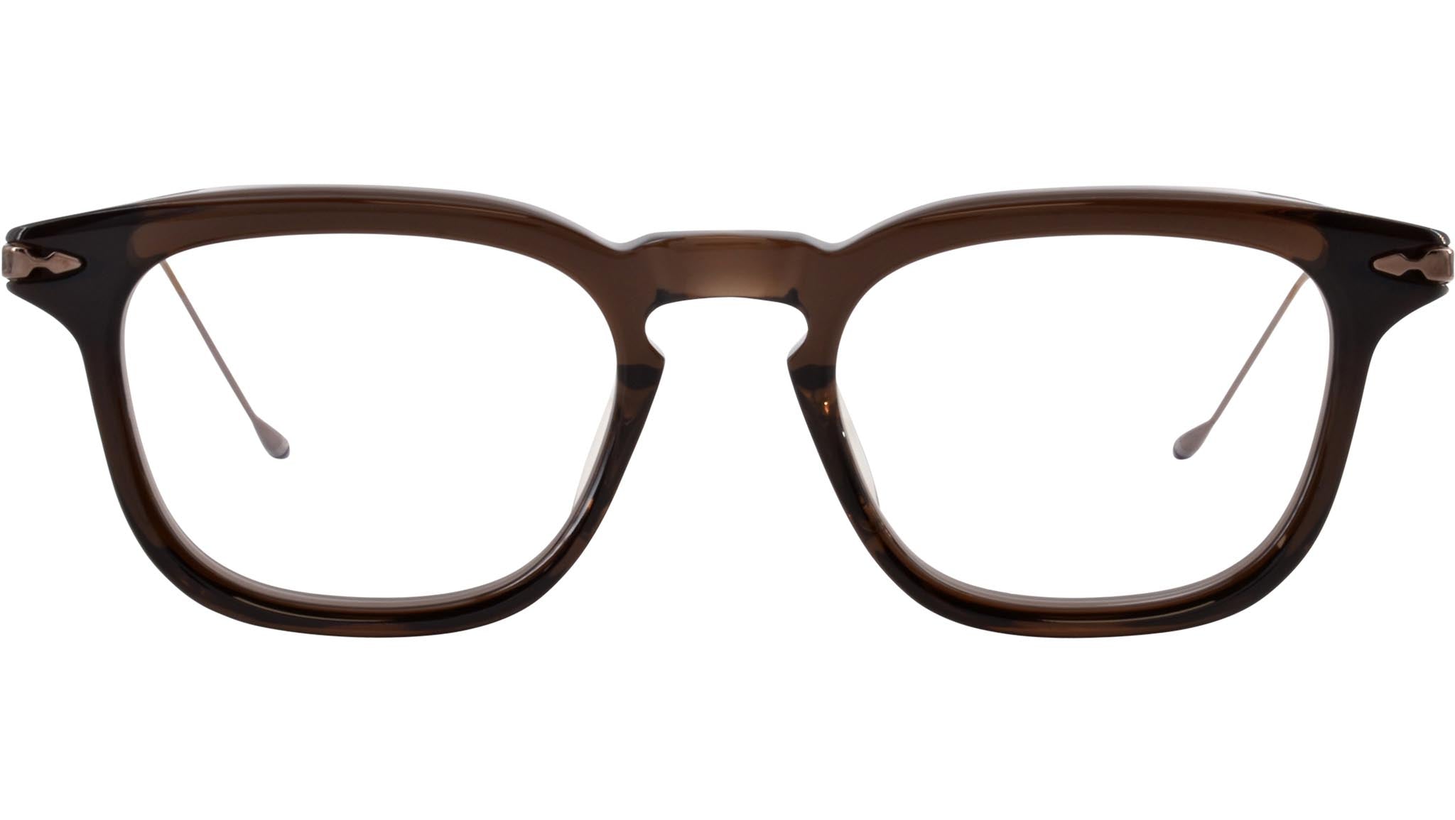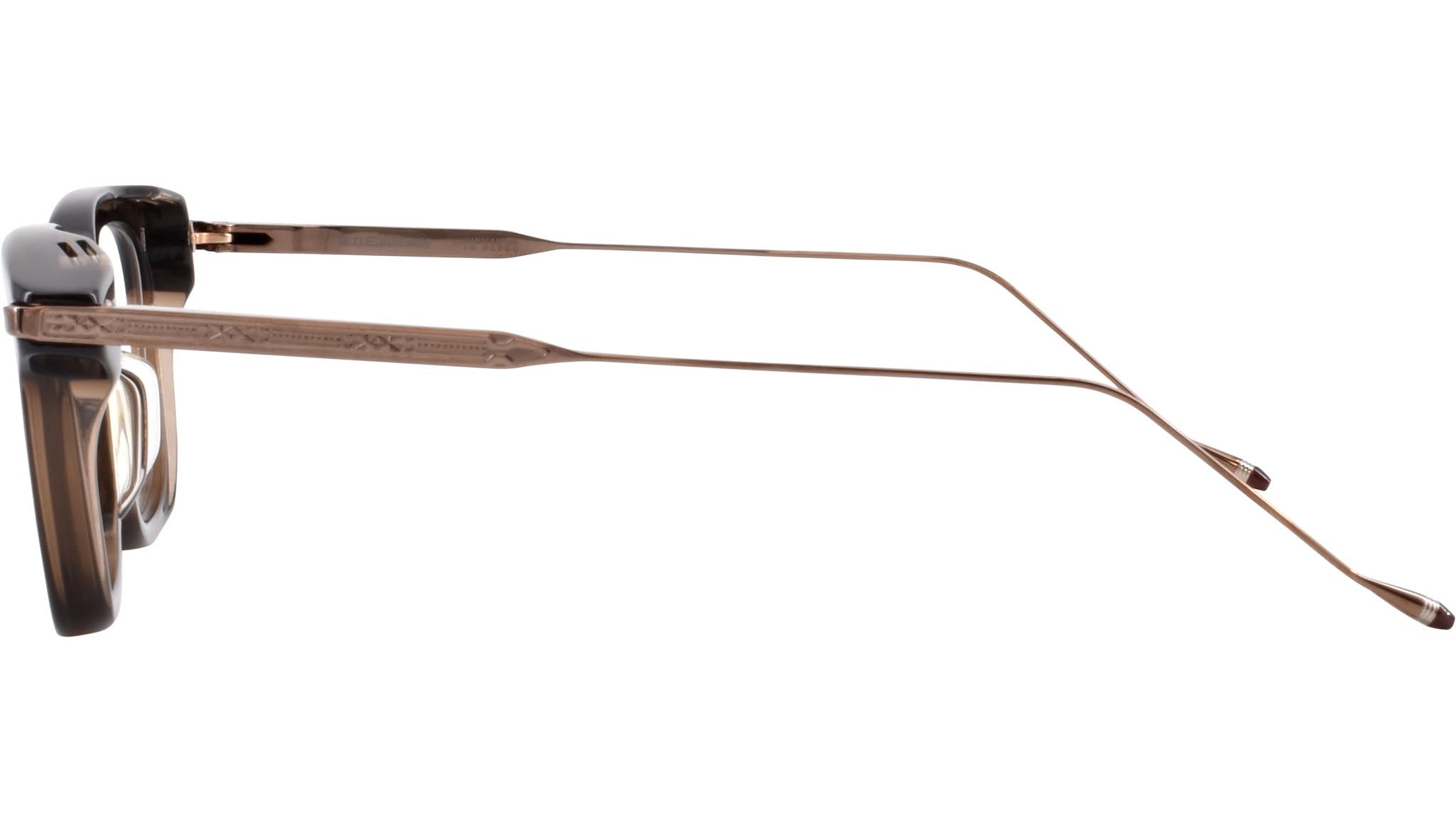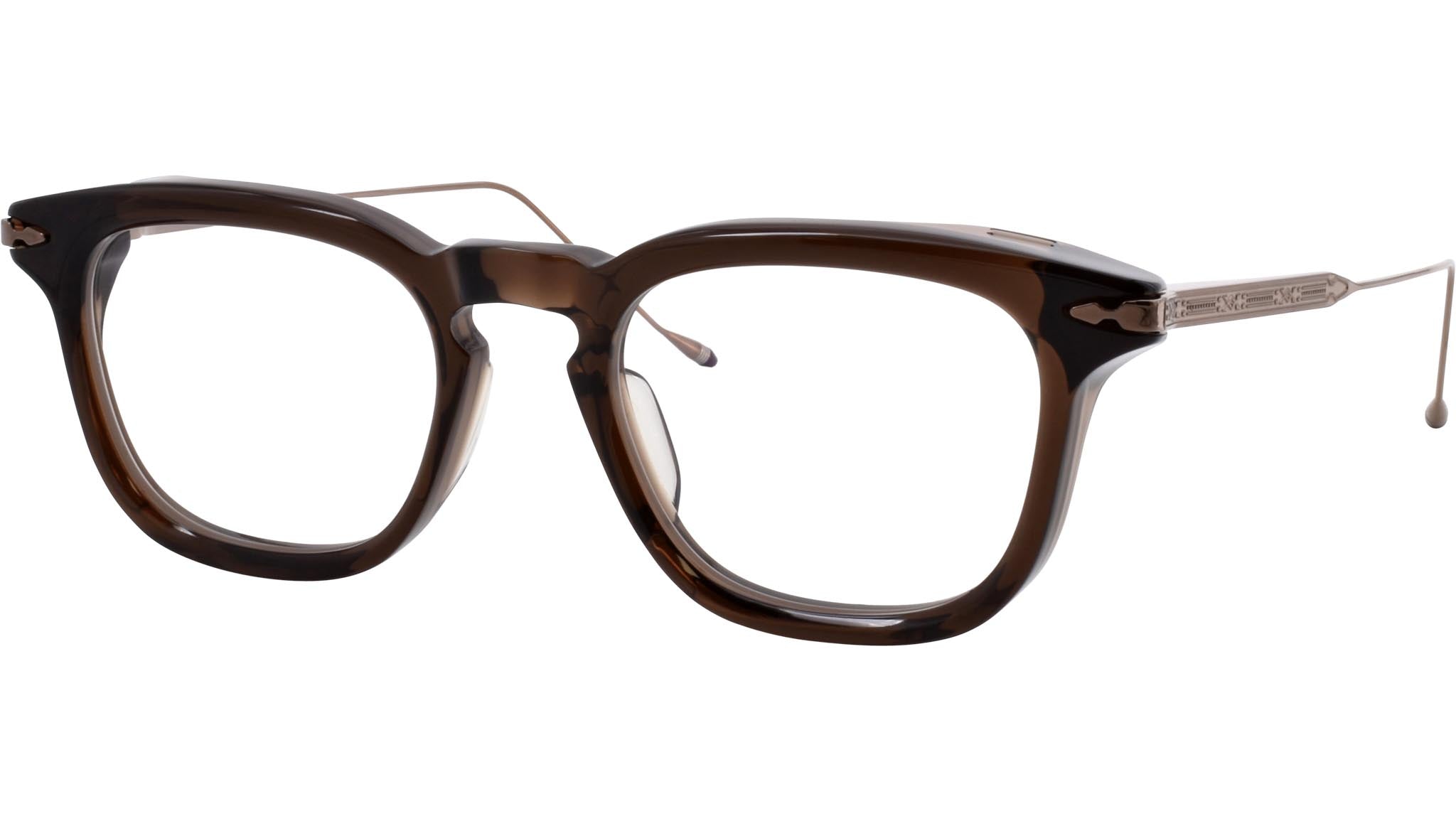 Classic soft angle shape. Features the new JMM hinge construction, with decorative front pins that are seamlessly attached to - and move with - the hinge. Titanium temple feature Native American - inspired filigree designs and an updated temple tip shape with signature burgundy epoxy detail. Silver 100% beta titanium temples and 4mm acetate front with clear lenses. Monoblock titanium hinge construction. Silver hardware. Brown acetate front. Demo lens CR-39.