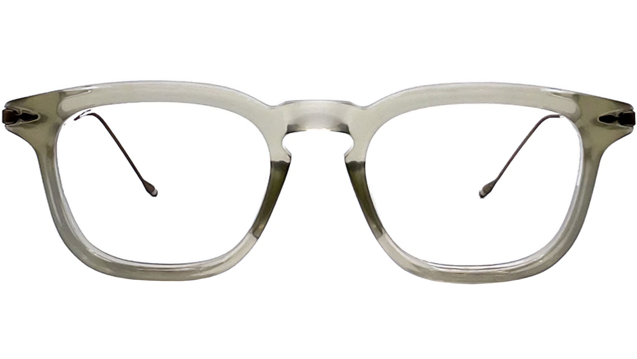 Classic soft angle shape. Features the new JMM hinge construction, with decorative front pins that are seamlessly attached to - and move with - the hinge. Titanium temple feature Native American - inspired filigree designs and an updated temple tip shape with signature burgundy epoxy detail. Silver 100% beta titanium temples and 4mm acetate front with clear lenses. Monoblock titanium hinge construction. Silver hardware. Clear grey acetate front. Demo lens CR-39.