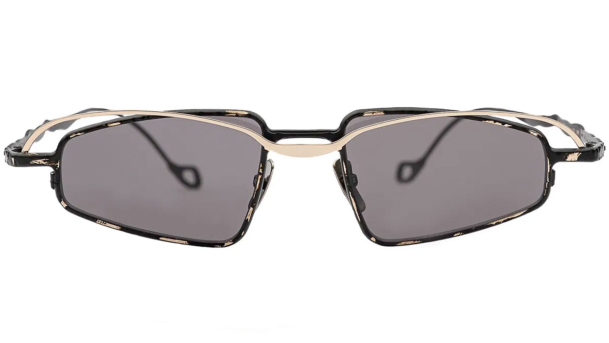 H73 is a titanium geometricl frame shape. Gold and black frame with solid grey lens. Kuboraum are masks that are designed on the face of its wearers to highlight their personality and character. Mask is synonymous with mockery and game. Kuboraum masks are synonymous with protection and shelter; they are cubical rooms where we shelter ourselves, free to live our intimacy and look at the world through two lenses. All masks are entirely dreamed in Berlin and handmade in Italy.