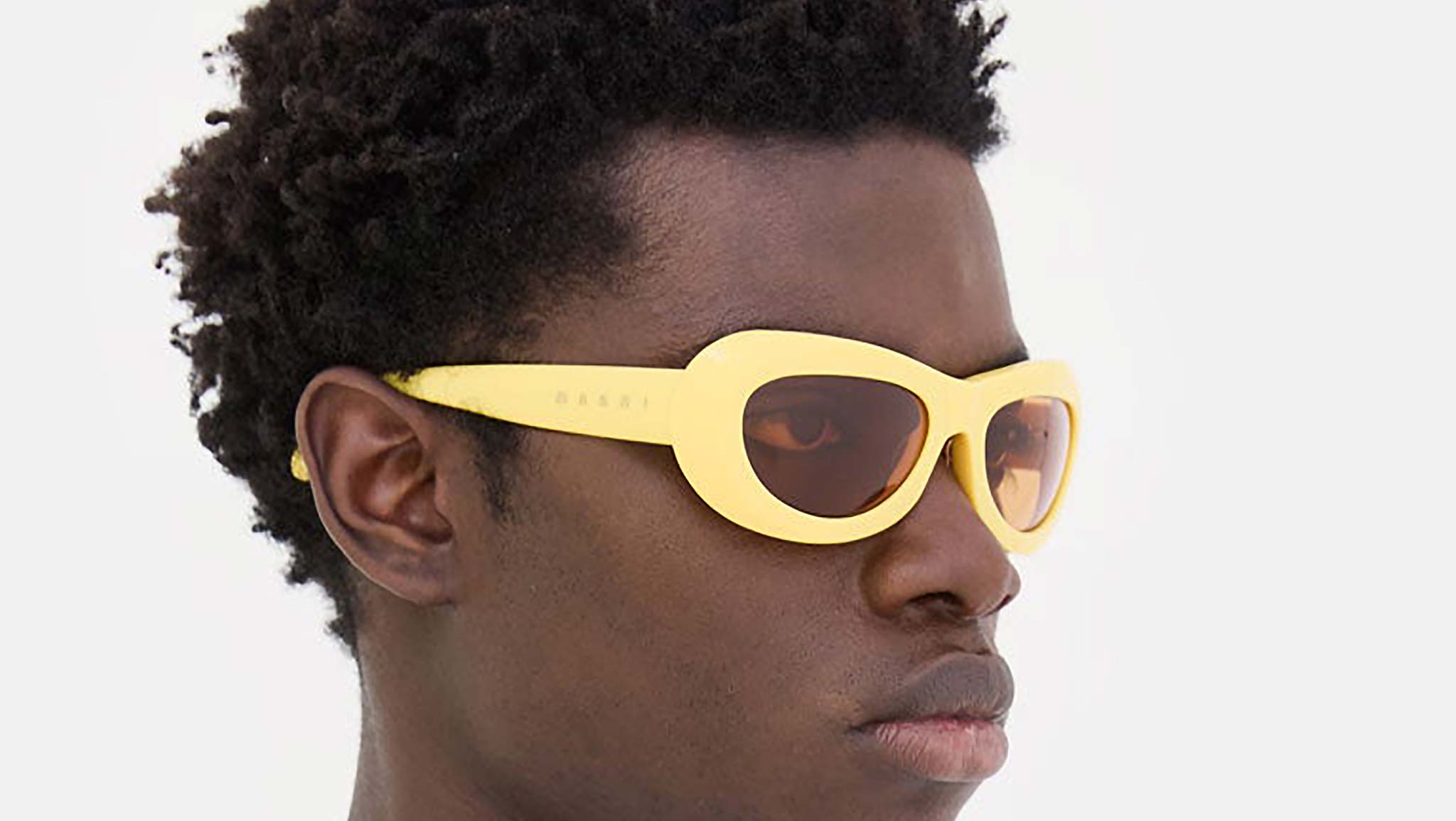Designed exclusively for Marni, Field of Rushes is a rounded yet compact silhouette characterised by a low nose-bridge and oval lenses. The model’s key feature are its extra-thick acetate rims, milled around the edges to form a rounded, sleek shape. Sturdy temples with an engraved Marni logo complete the piece. This version comes in bright yellow acetate with brown lenses and gold decors. Sizes: R Lens Width: 59 mm. Frame Front: Frame Side: 140 mm. Product Code Size R: 7IE
