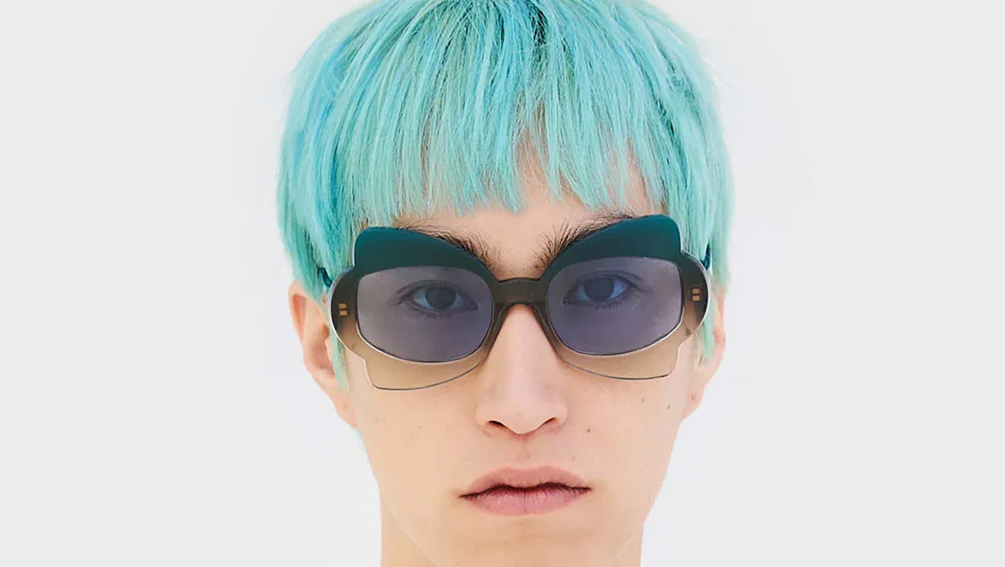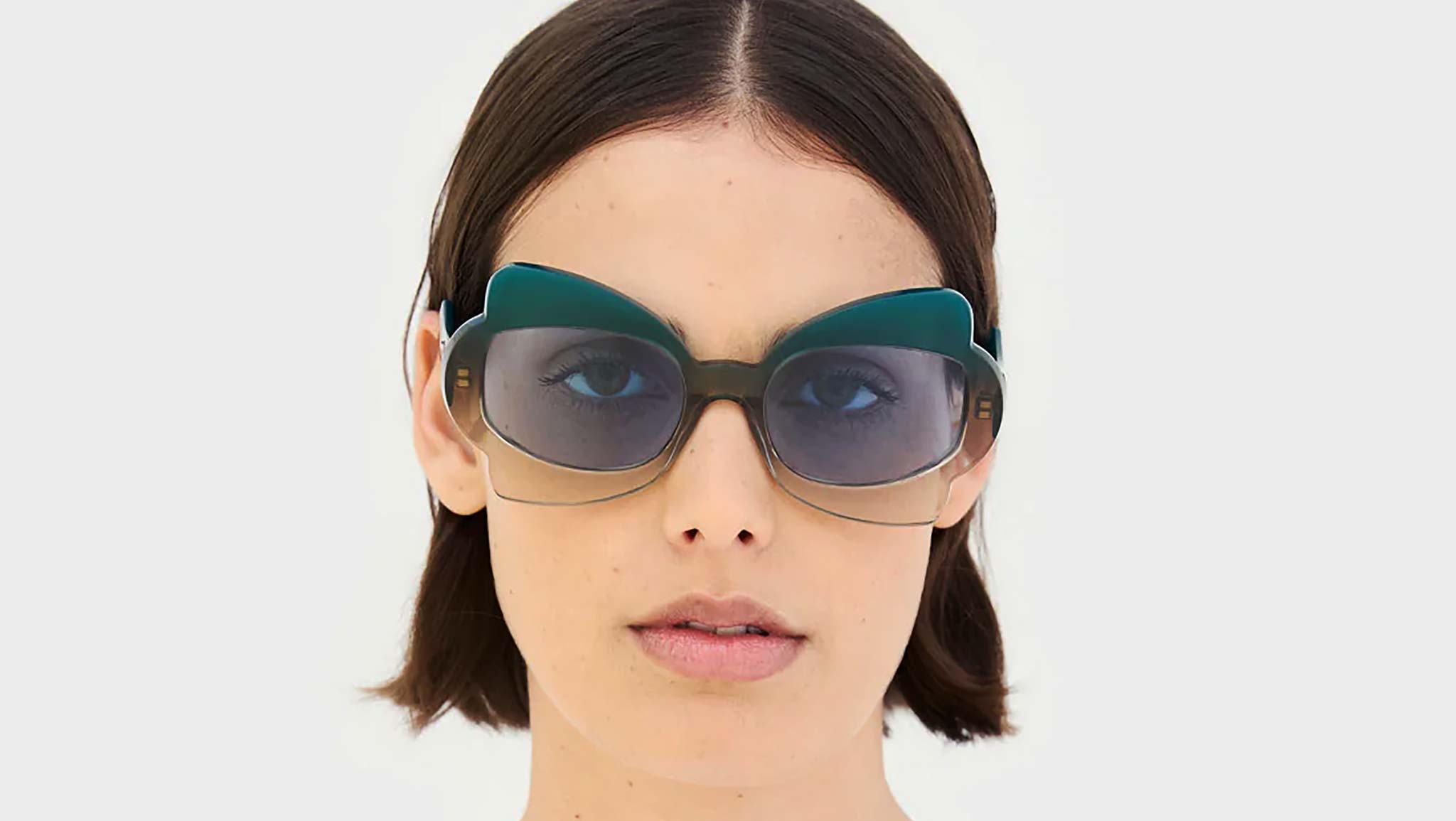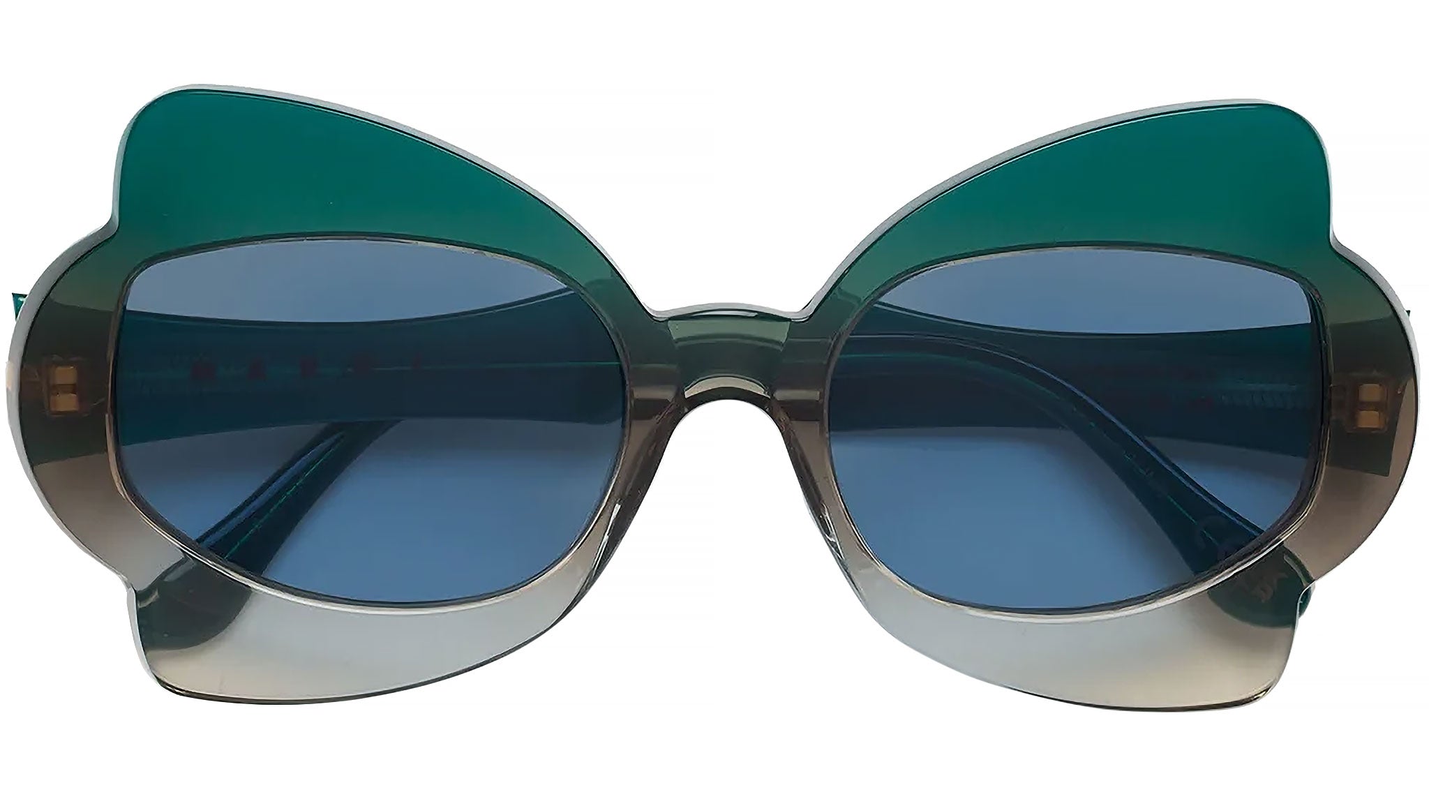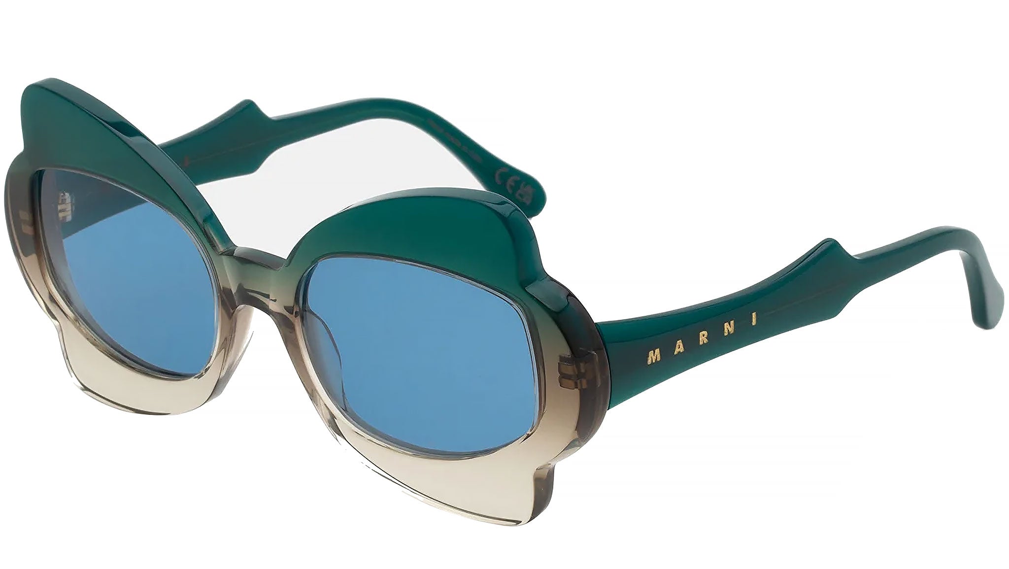 Designed exclusively for Marni, Monumental Gate is a playful silhouette inspired by floral references. Its bold acetate construction features thick, curved rims that have been milled to form a rounded, bulky design. Unique temples complement the frontal piece with a sculptural pointed element carrying a laser engraved Marni logo. This version features a sophisticated green fading acetate and blue lenses with gold decors. Sizes: R Lens Width: 56 mm. Frame Front: Frame Side: 145 mm. Product Code Size R: R3P