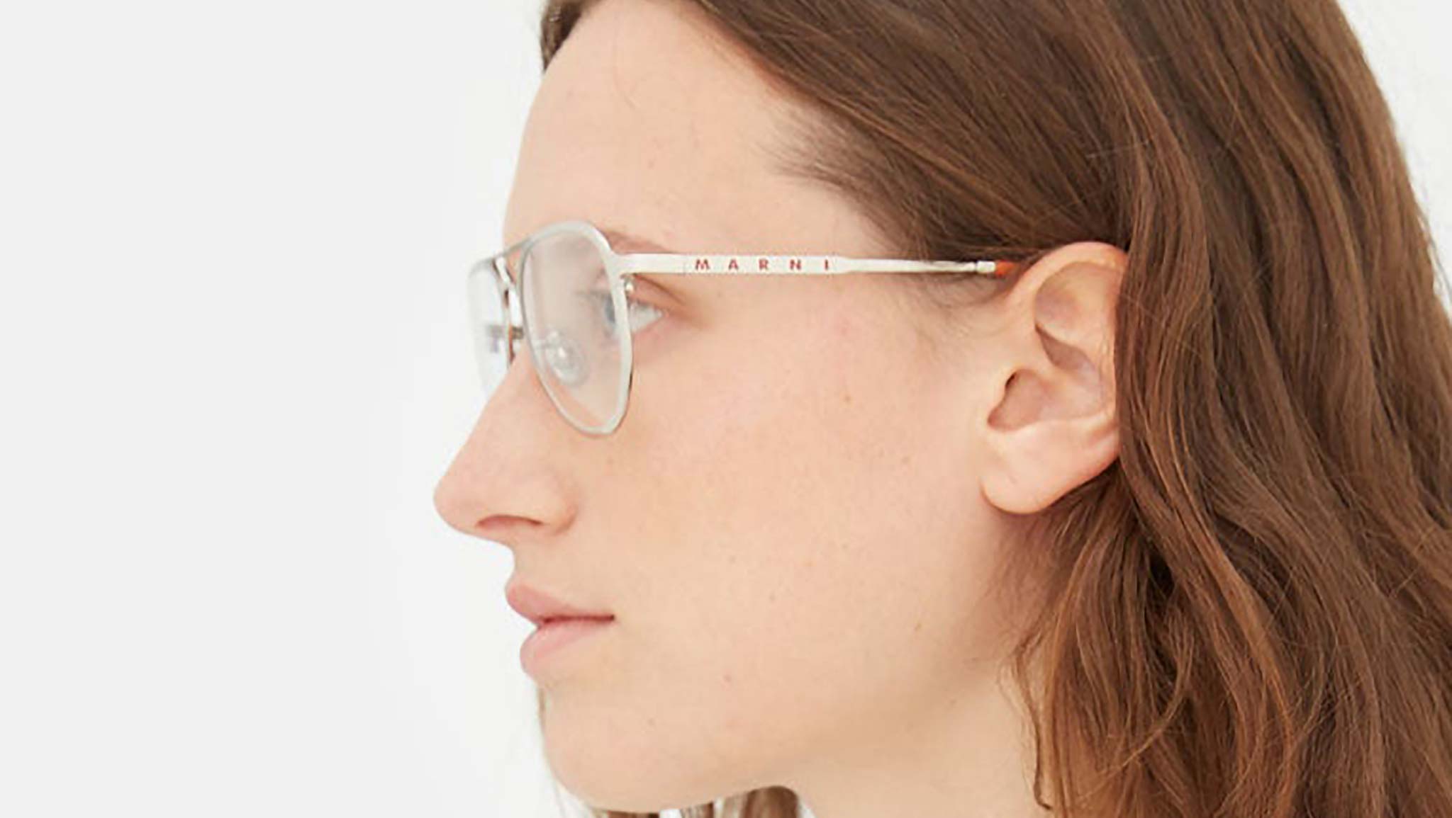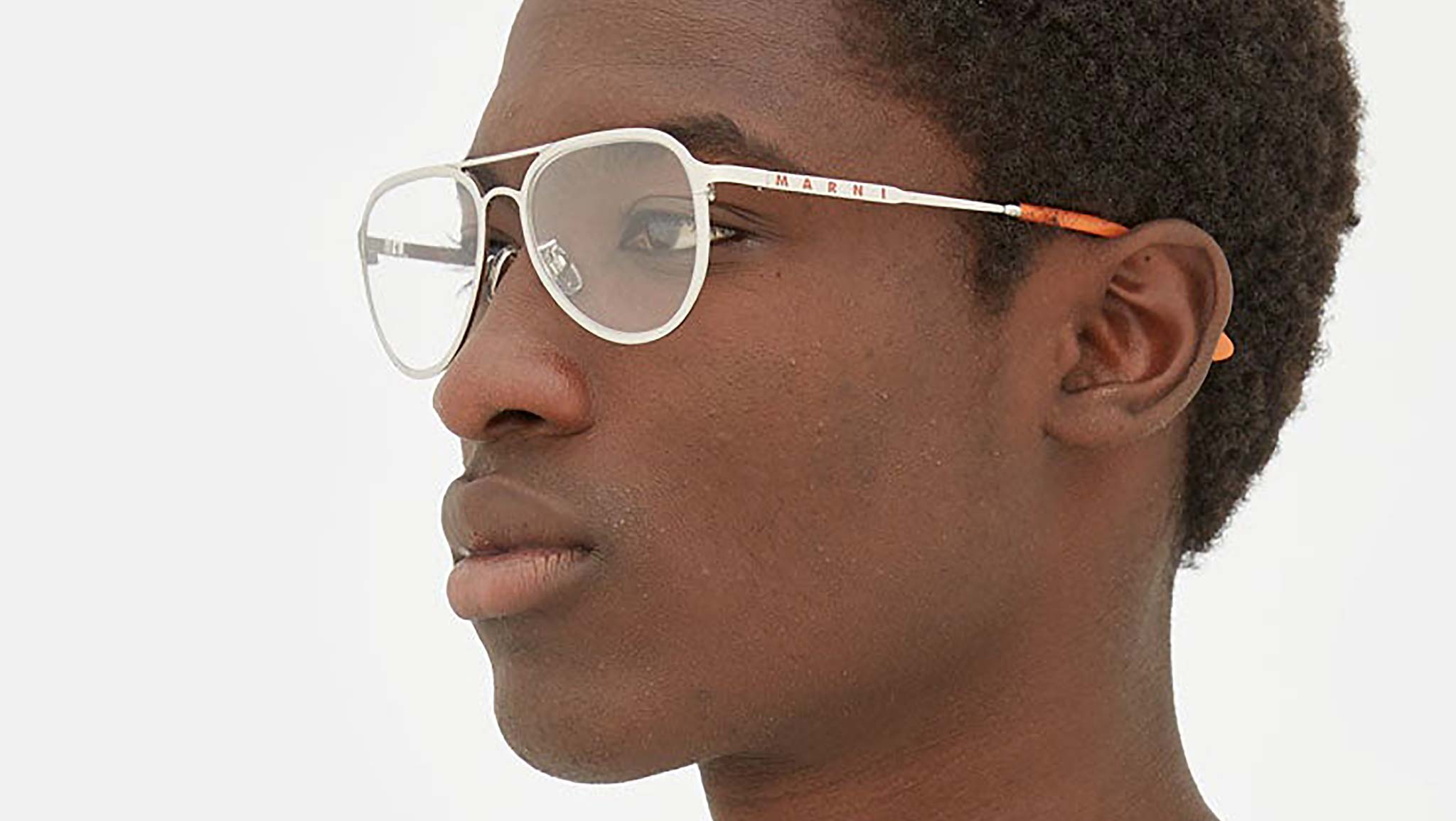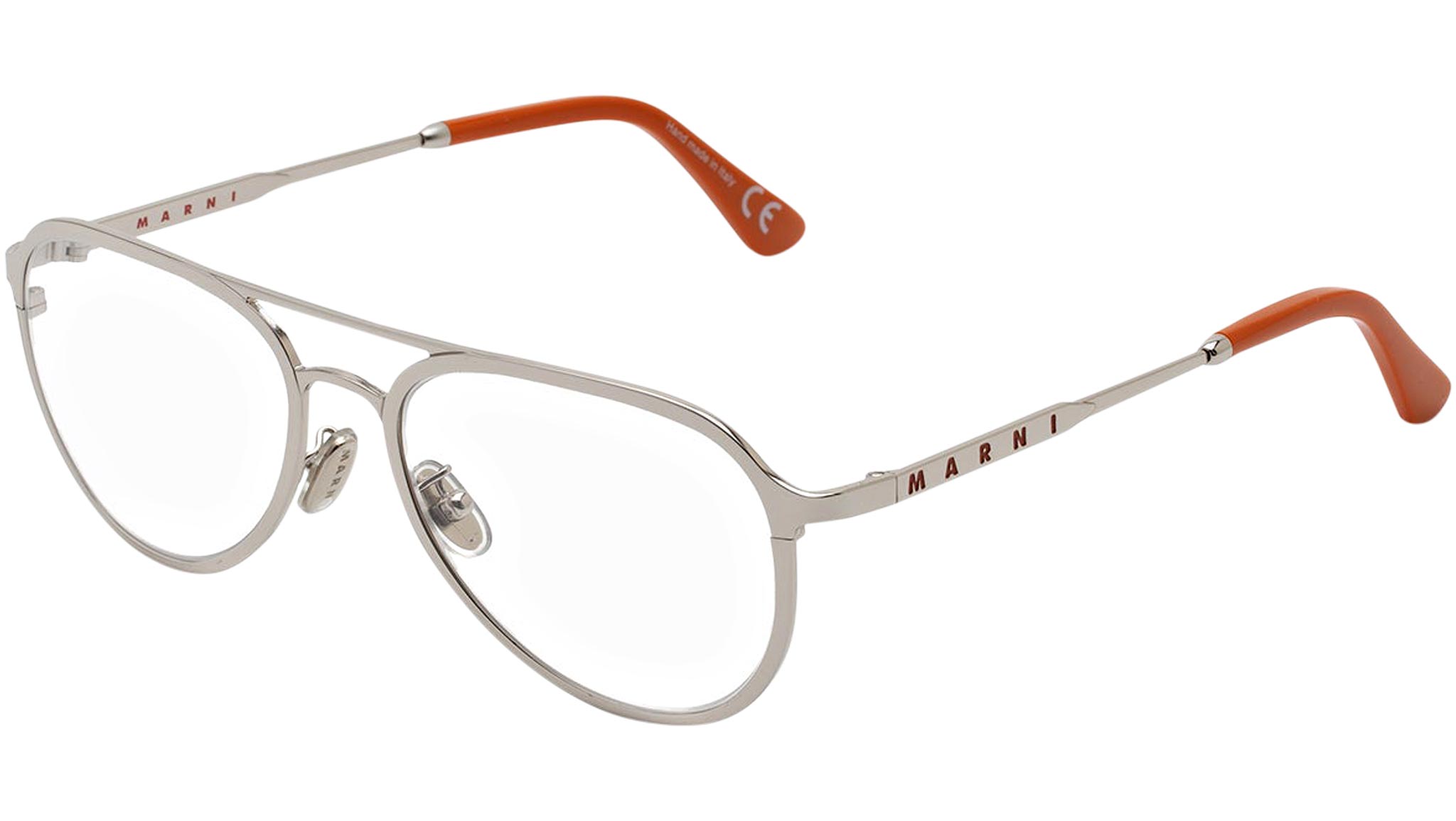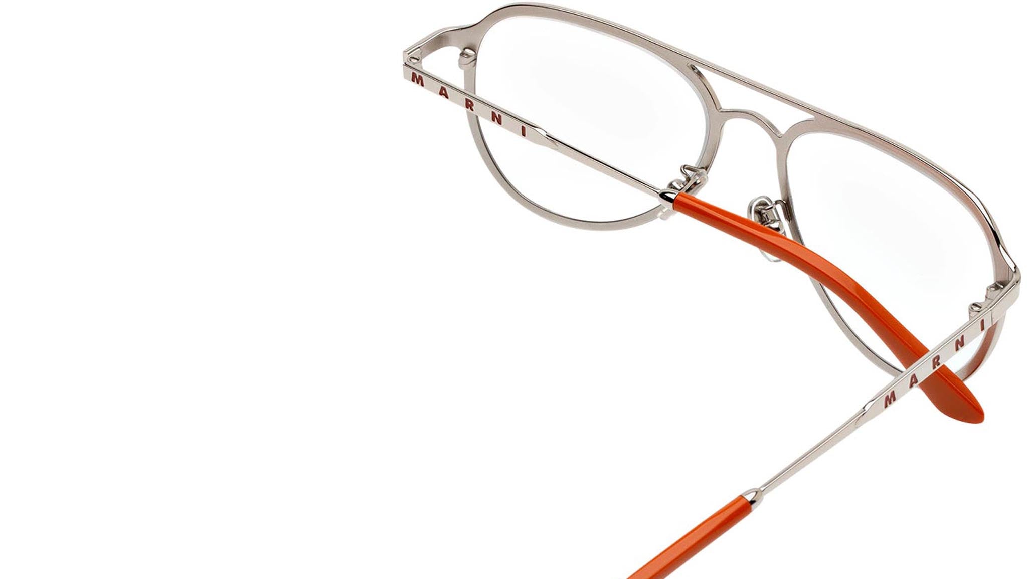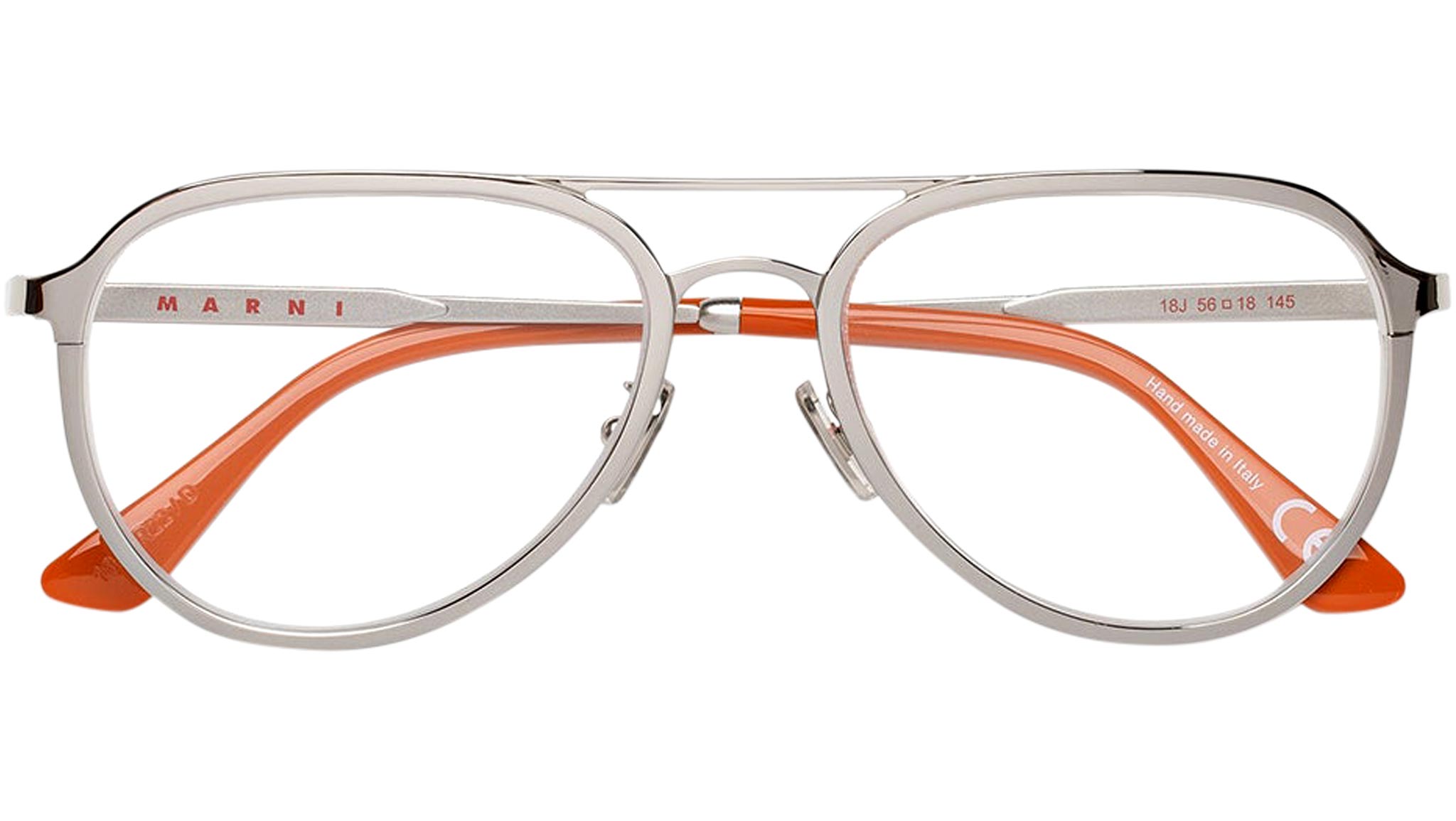 Designed exclusively for Marni, Palawan Island is an edgy optical frame conceived as an eclectic interpretation of pear-shaped aviator silhouettes. The model features thick metal rims that give it a unique bold character, capturing the distinctive flair of 1970s aesthetics. This model comes in a sleek silver finish with orange temples. Sizes: R Lens Width: 55 mm. Frame Front: Frame Side: 145 mm. Product Code Size R: 18J