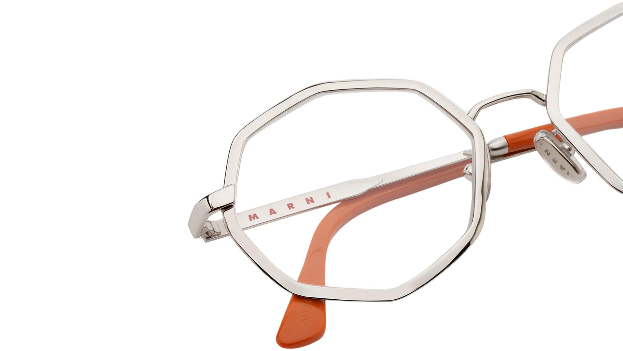 Designed exclusively for Marni, Pulpit Rock is a playful metal silhouette that reinterprets 1970s eclecticism for the 21st century. This oversized shape features octagonal metal rims, fitted for lightweight everyday use. This model matches edginess with wearability for a high-end result with a silver metal finish with orange acetate temples. Sizes: R Lens Width: 55 mm. Frame Front: Frame Side: 145 mm. Product Code Size R: S1T