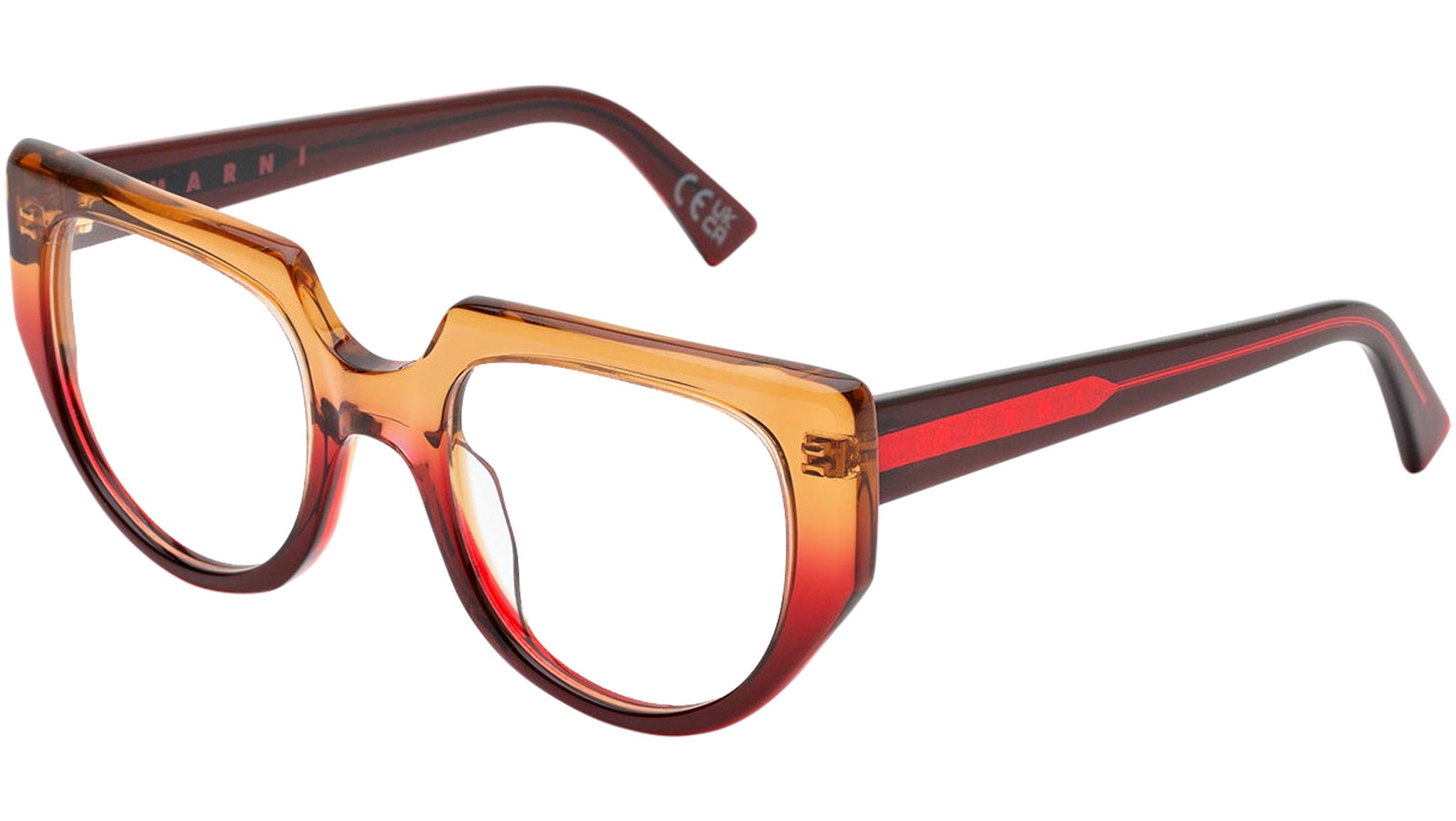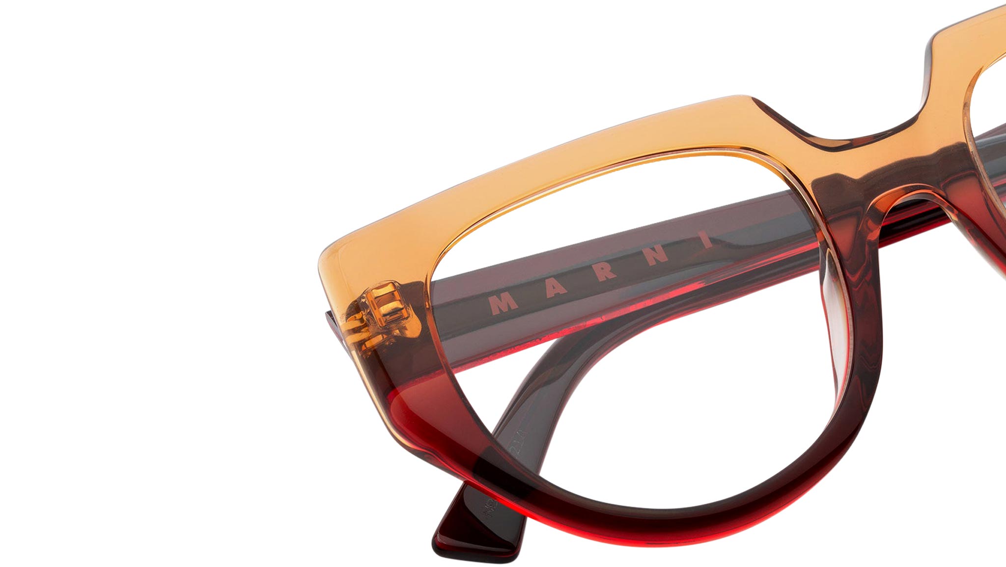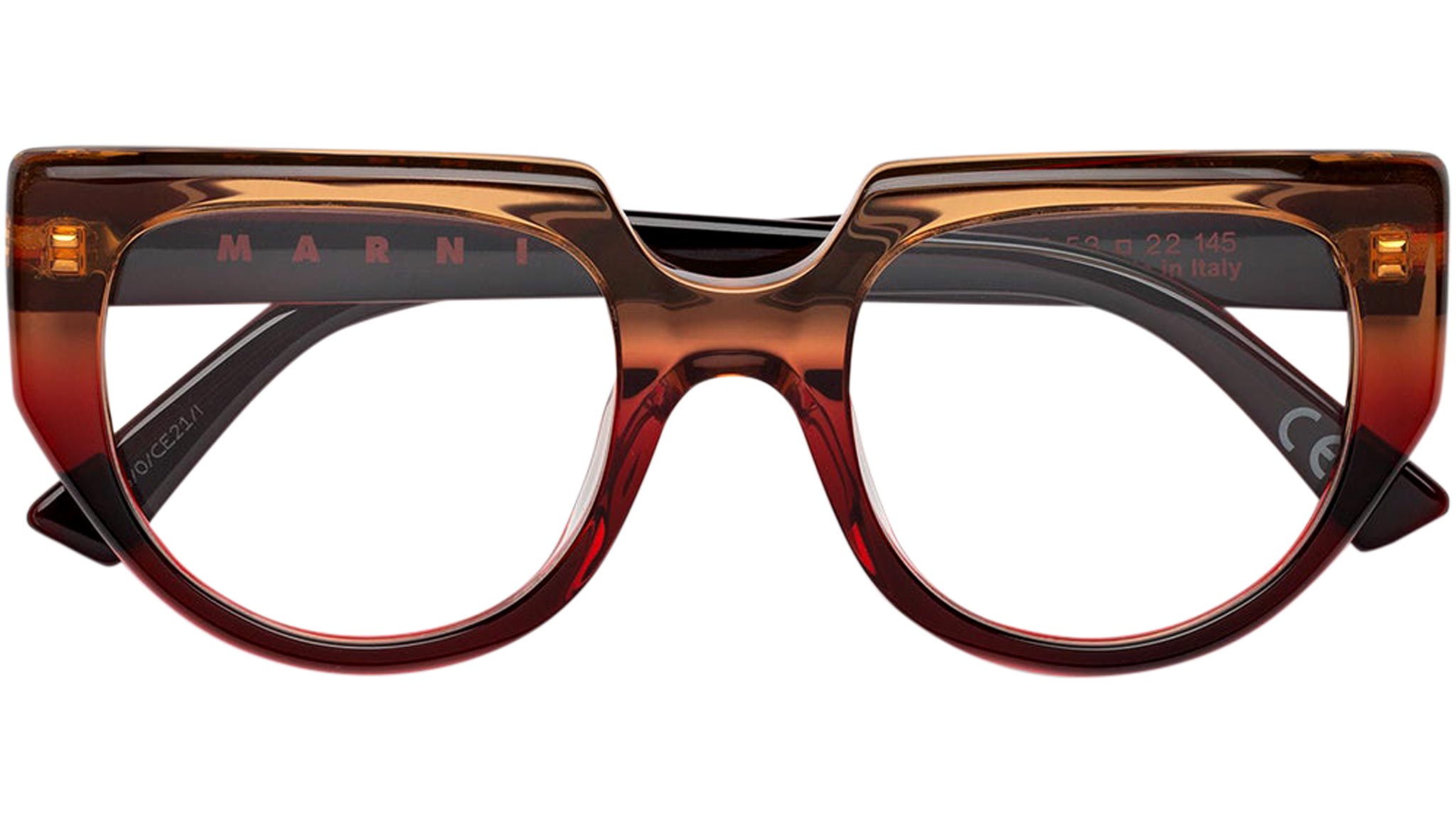 Designed exclusively for Marni, Uluru is a sturdy Optical silhouette characterised by unique geometries and asymmetrical design features. The model blends squared detailing with carefully rounded curves for an innovative aesthetics. Different thicknesses are placed in strategic areas for extra strength, a strong brow-piece is matched by slender rims on the lower part of the frame. This is a sophisticated model that captures Marni’s quirky approach to style. This version is available in a warm fading multicolored acetate. Sizes: R Lens Width: 53 mm. Frame Front: Frame Side: 145 mm. Product Code Size R: NB5