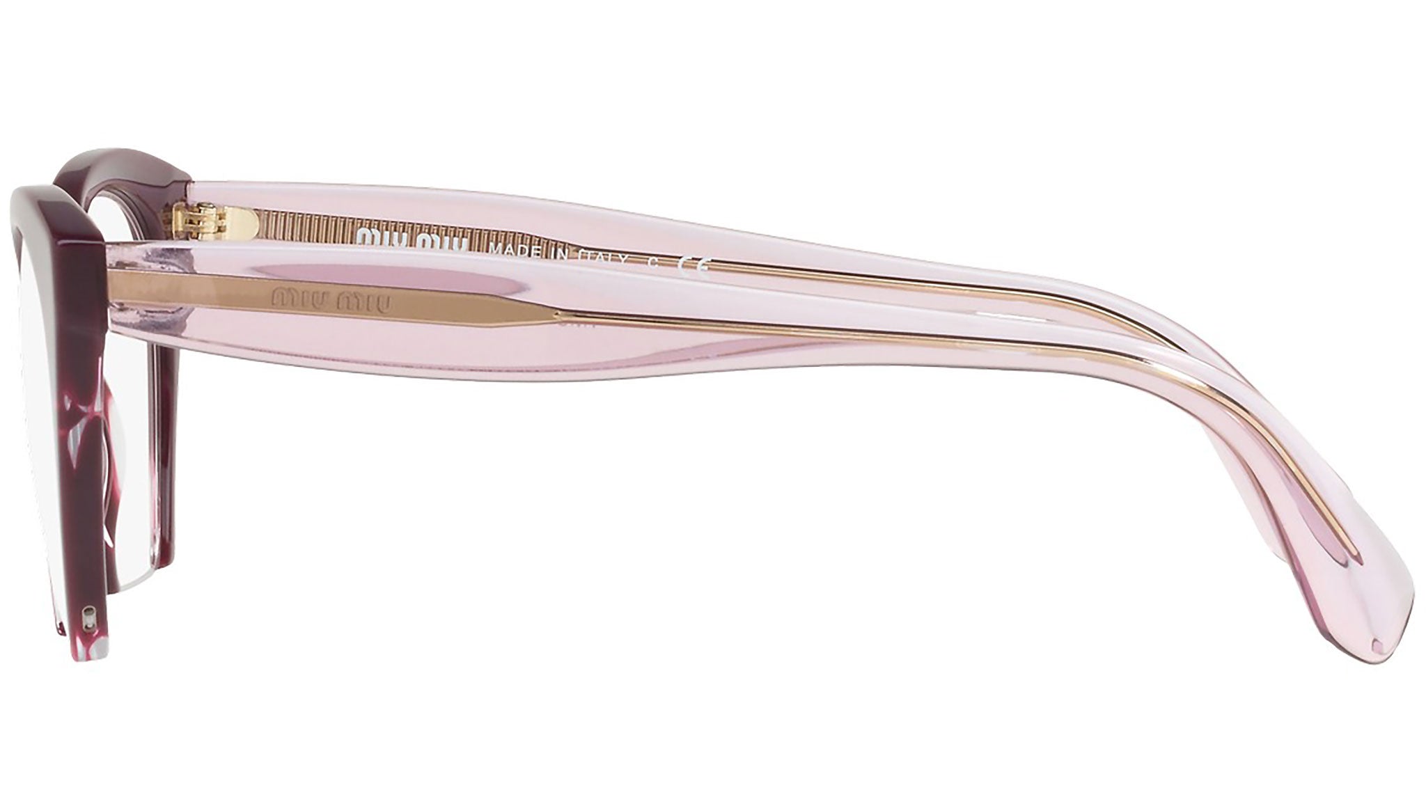 Montatura da vista Miu Miu modello MU 03QV codice colore Q041O1 con montatura color uva e rosa in acetato e lenti demo. Miu Miu offre creazioni uniche, in cui la costante ricerca stilistica si combina perfettamente con la maestria artigianale della lavorazione. Le silhouette femminili e sinuose delle montature sono espressione di una ricchezza dei dettagli che rispecchia pienamente i codici stilistici e l’indiscusso talento del brand nell’unire il design non convenzionale ad un romanticismo dai rimandi retrò.