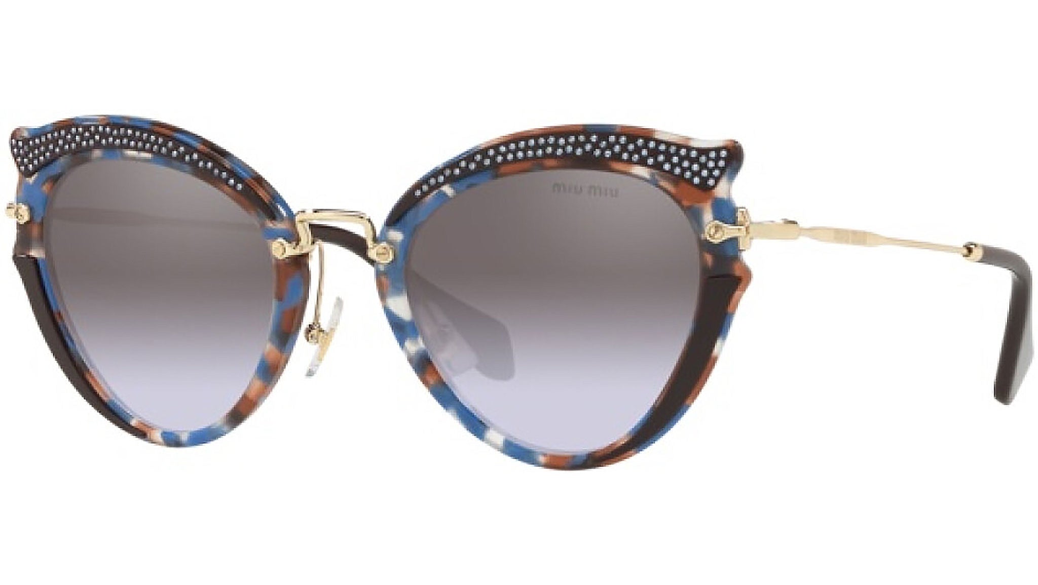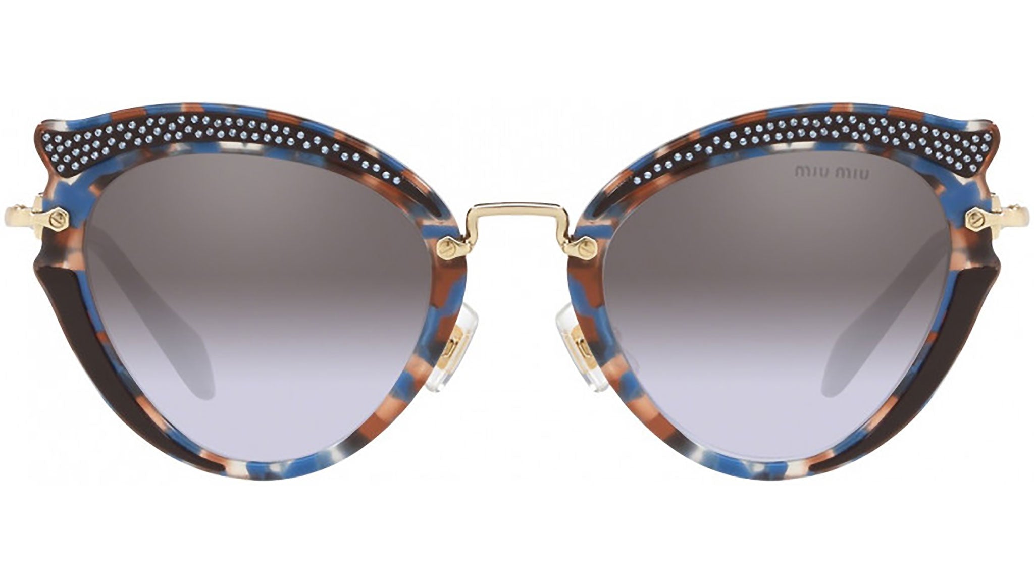Occhiali da sole Miu Miu modello MU 70US variante colore TZ52H2 avana azzurro / marrone, con lenti color viola sfumato marrone a specchio. Miu Miu offre creazioni uniche, in cui la costante ricerca stilistica si combina perfettamente con la maestria artigianale della lavorazione. Le silhouette femminili e sinuose delle montature sono espressione di una ricchezza dei dettagli che rispecchia pienamente i codici stilistici e l’indiscusso talento del brand nell’unire il design non convenzionale ad un romanticismo dai rimandi retrò.