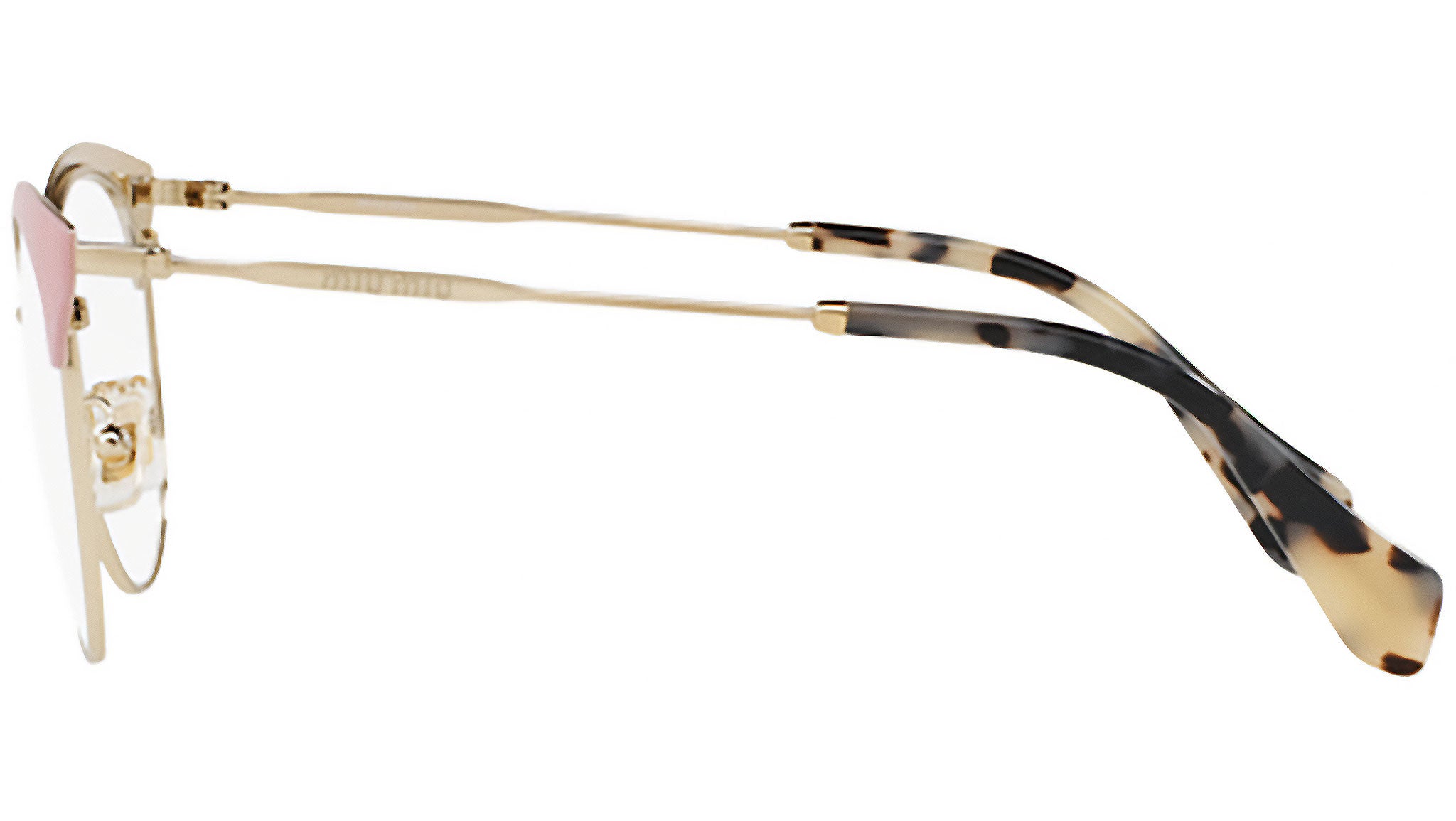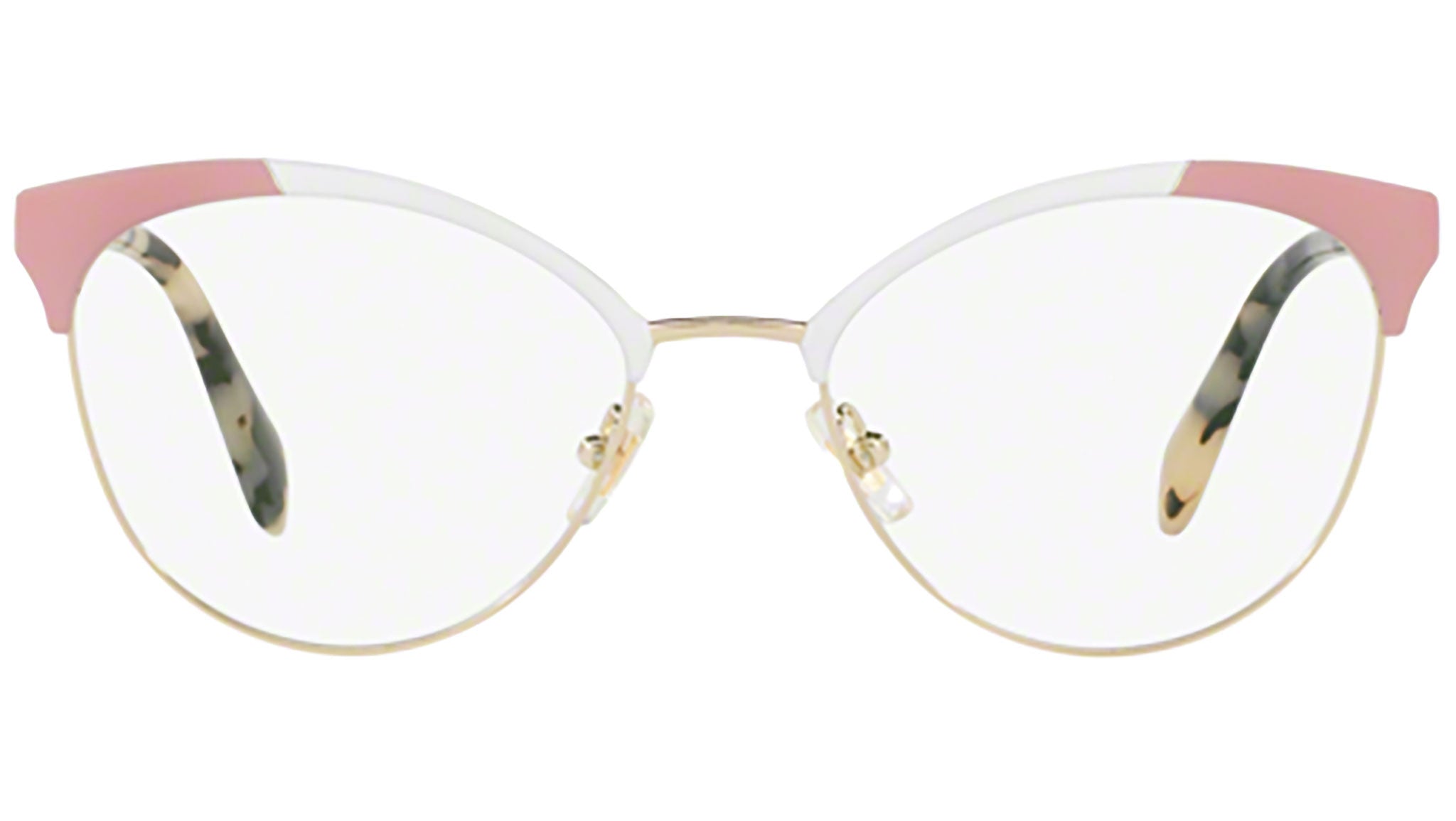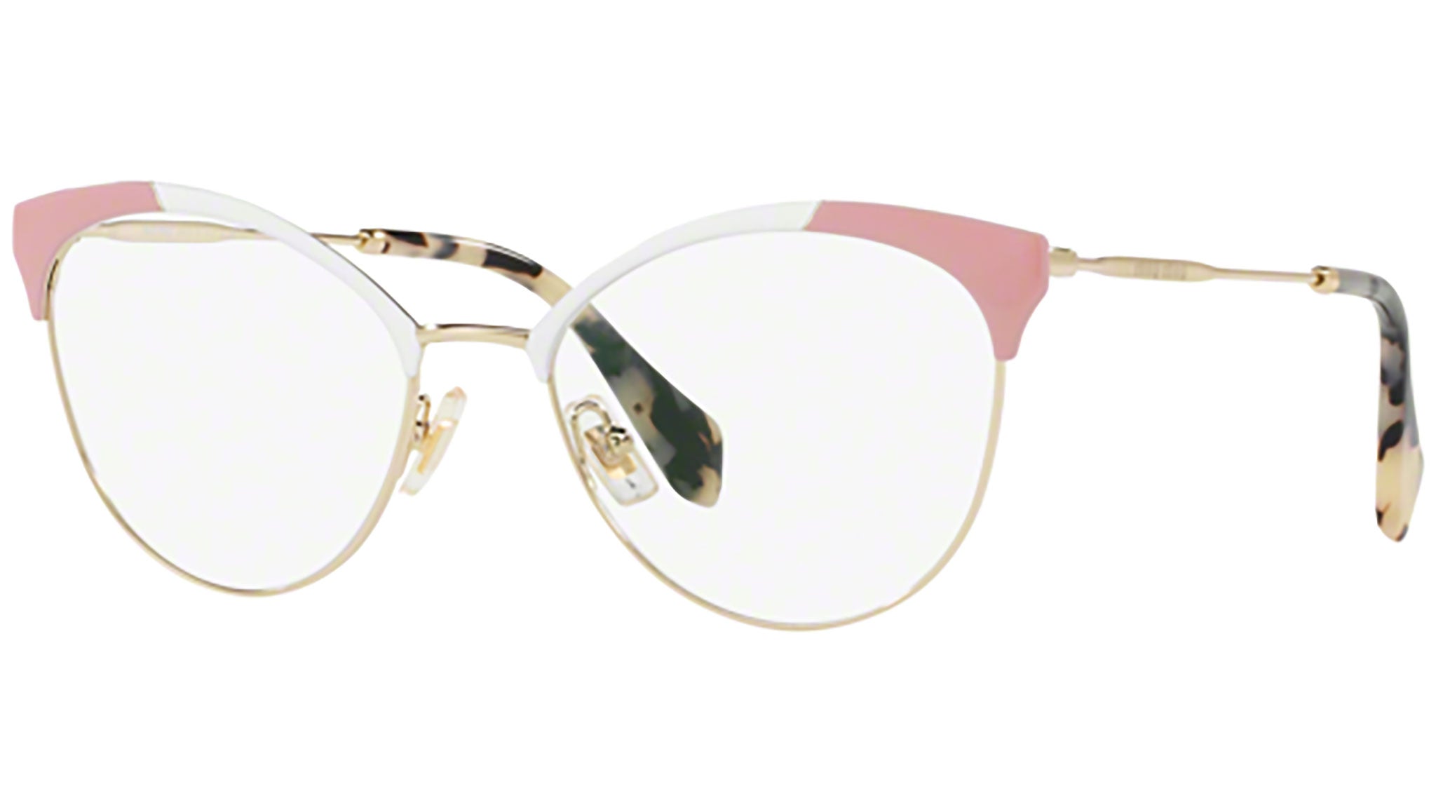 Montatura da vista Miu Miu modello MU 50PV codice colore USQ1O1 con montatura color bianco e oro rosa in acetato-metallo e lenti demo. Miu Miu offre creazioni uniche, in cui la costante ricerca stilistica si combina perfettamente con la maestria artigianale della lavorazione. Le silhouette femminili e sinuose delle montature sono espressione di una ricchezza dei dettagli che rispecchia pienamente i codici stilistici e l’indiscusso talento del brand nell’unire il design non convenzionale ad un romanticismo dai rimandi retrò.