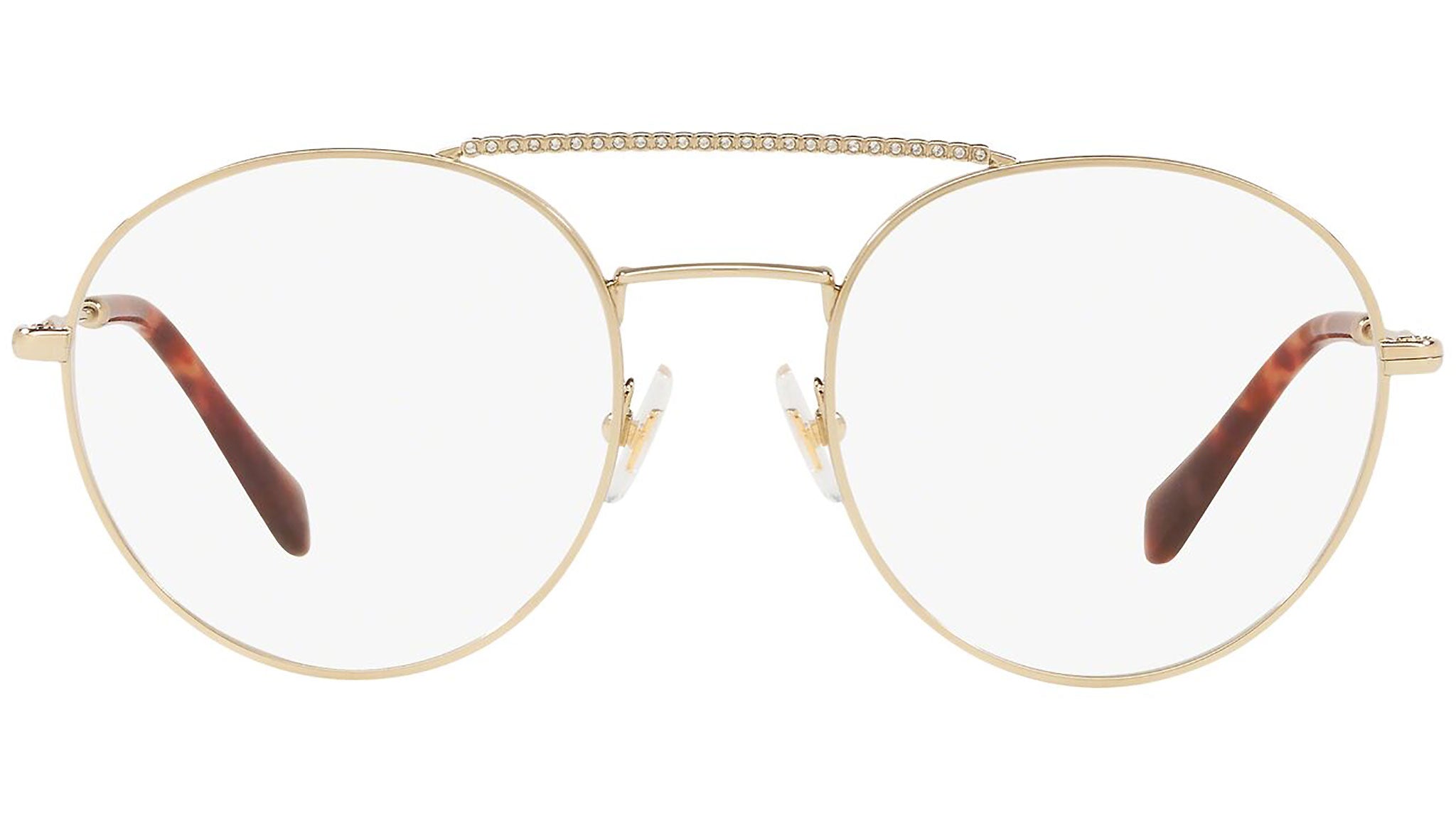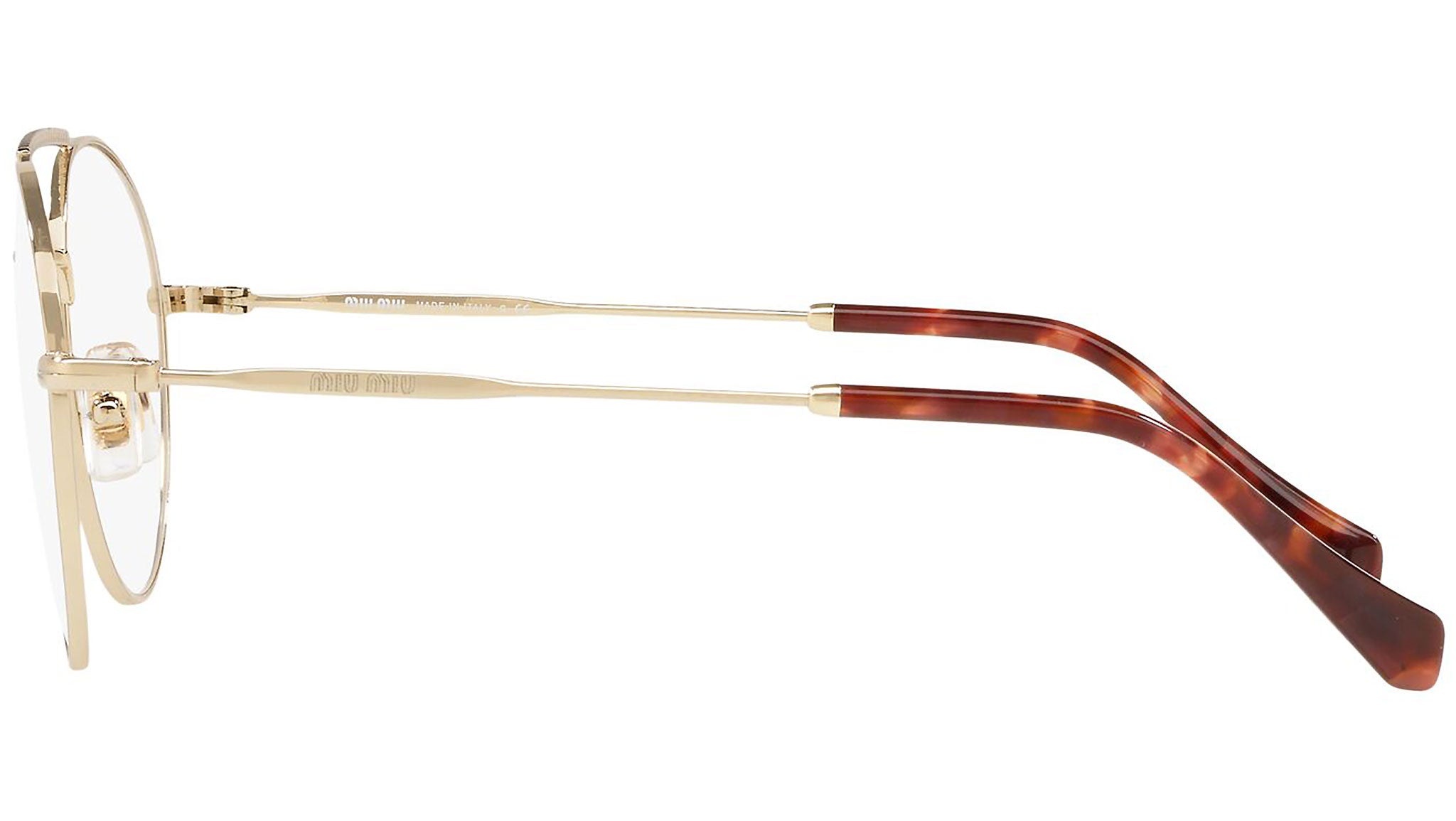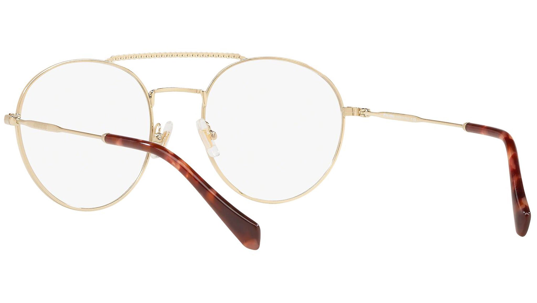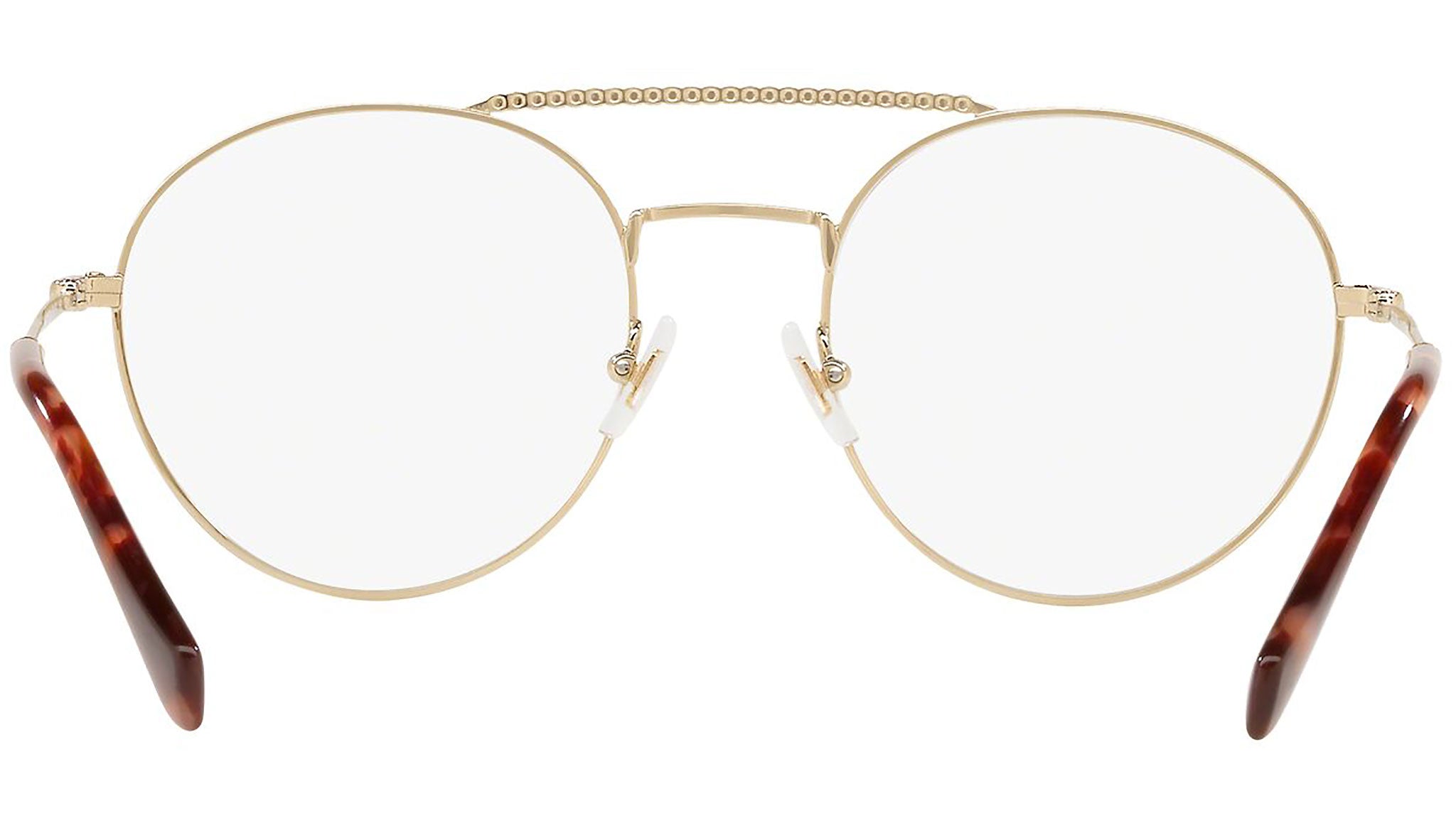 Occhiali da vista Miu Miu modello MU 51RV variante colore ZVN1O1 oro chiaro. Miu Miu offre creazioni uniche, in cui la costante ricerca stilistica si combina perfettamente con la maestria artigianale della lavorazione. Le silhouette femminili e sinuose delle montature sono espressione di una ricchezza dei dettagli che rispecchia pienamente i codici stilistici e l’indiscusso talento del brand nell’unire il design non convenzionale ad un romanticismo dai rimandi retrò.