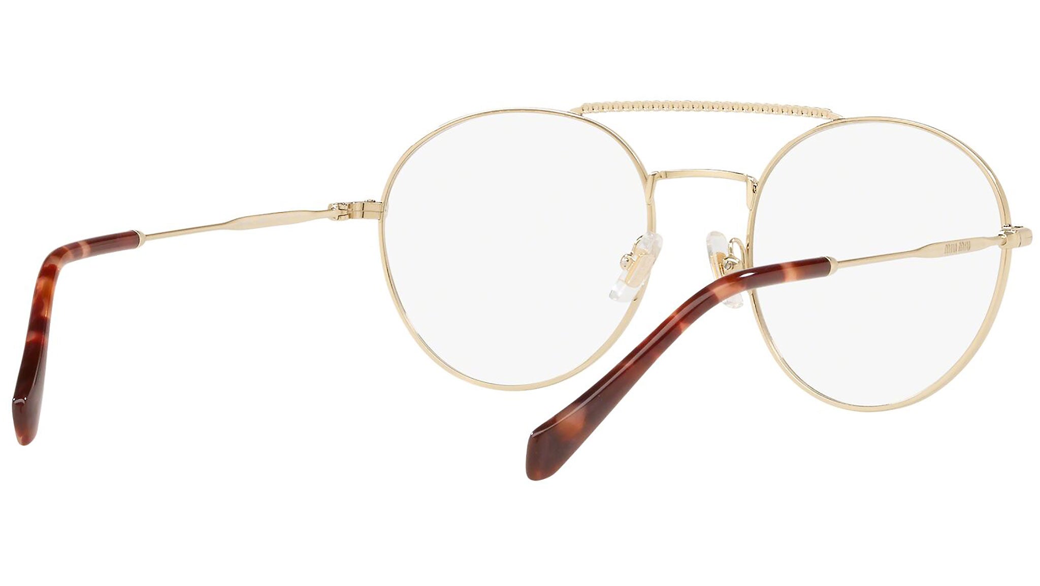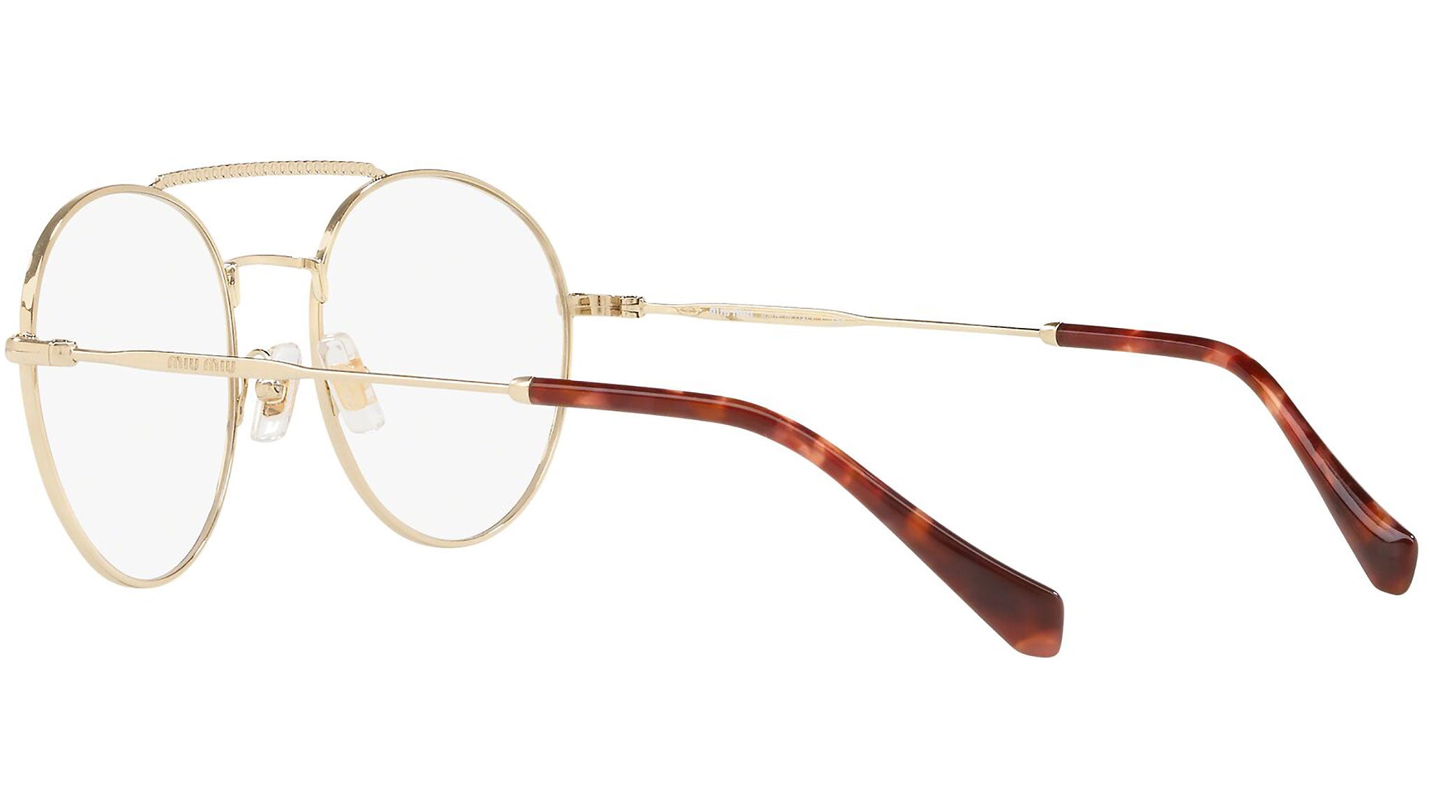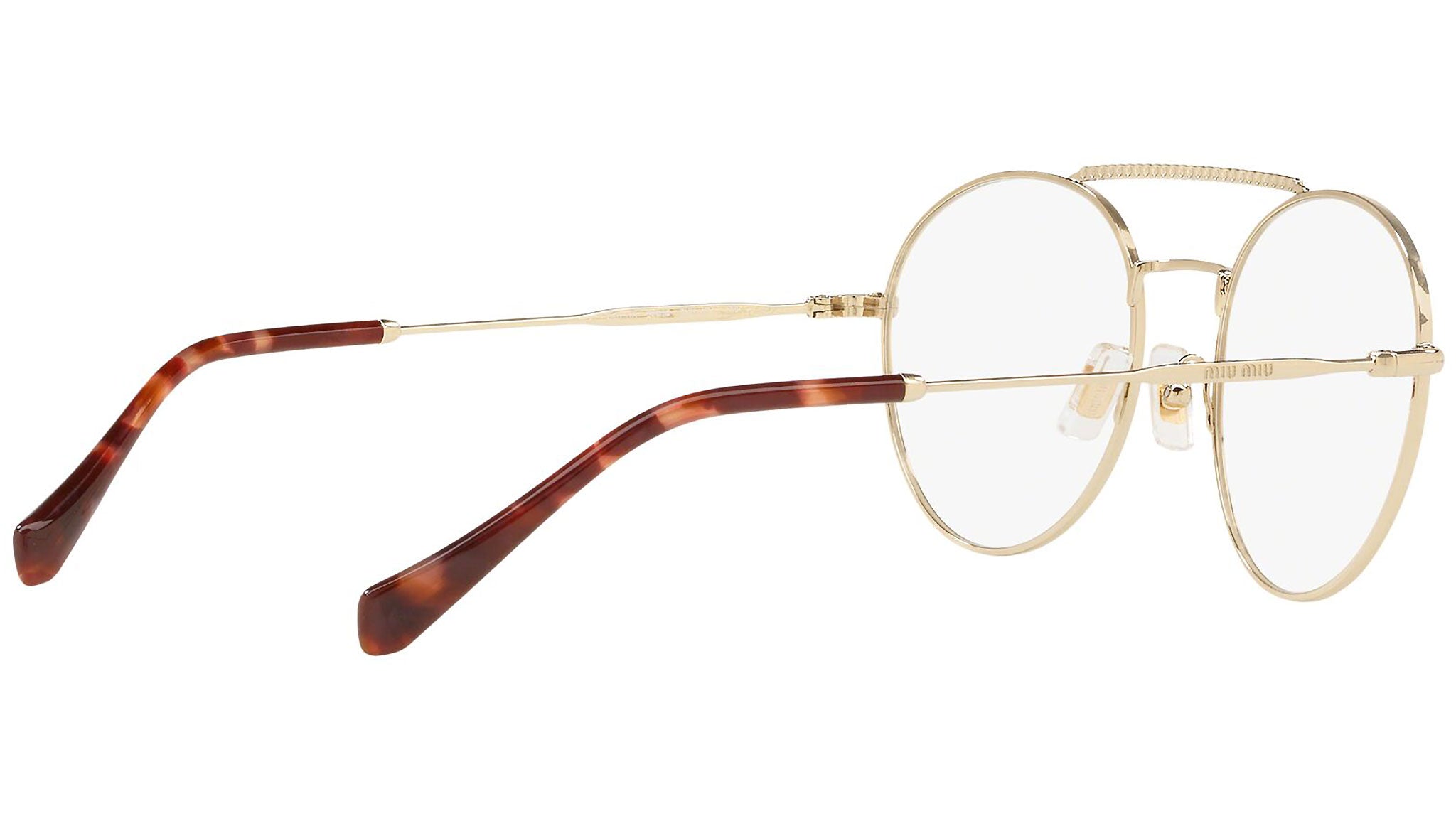 Occhiali da vista Miu Miu modello MU 51RV variante colore ZVN1O1 oro chiaro. Miu Miu offre creazioni uniche, in cui la costante ricerca stilistica si combina perfettamente con la maestria artigianale della lavorazione. Le silhouette femminili e sinuose delle montature sono espressione di una ricchezza dei dettagli che rispecchia pienamente i codici stilistici e l’indiscusso talento del brand nell’unire il design non convenzionale ad un romanticismo dai rimandi retrò.