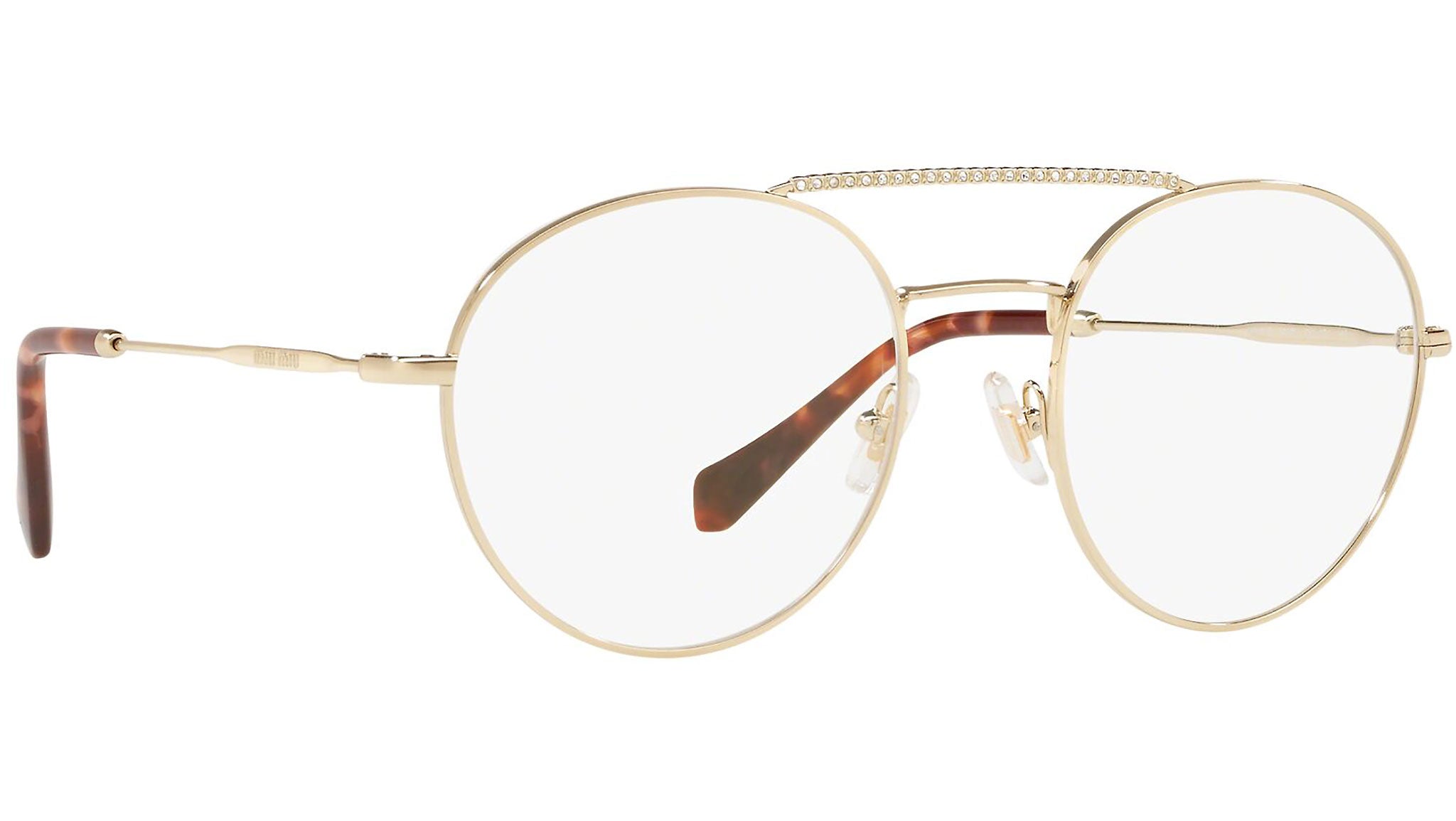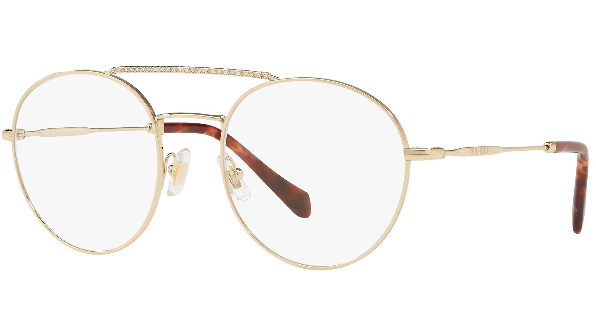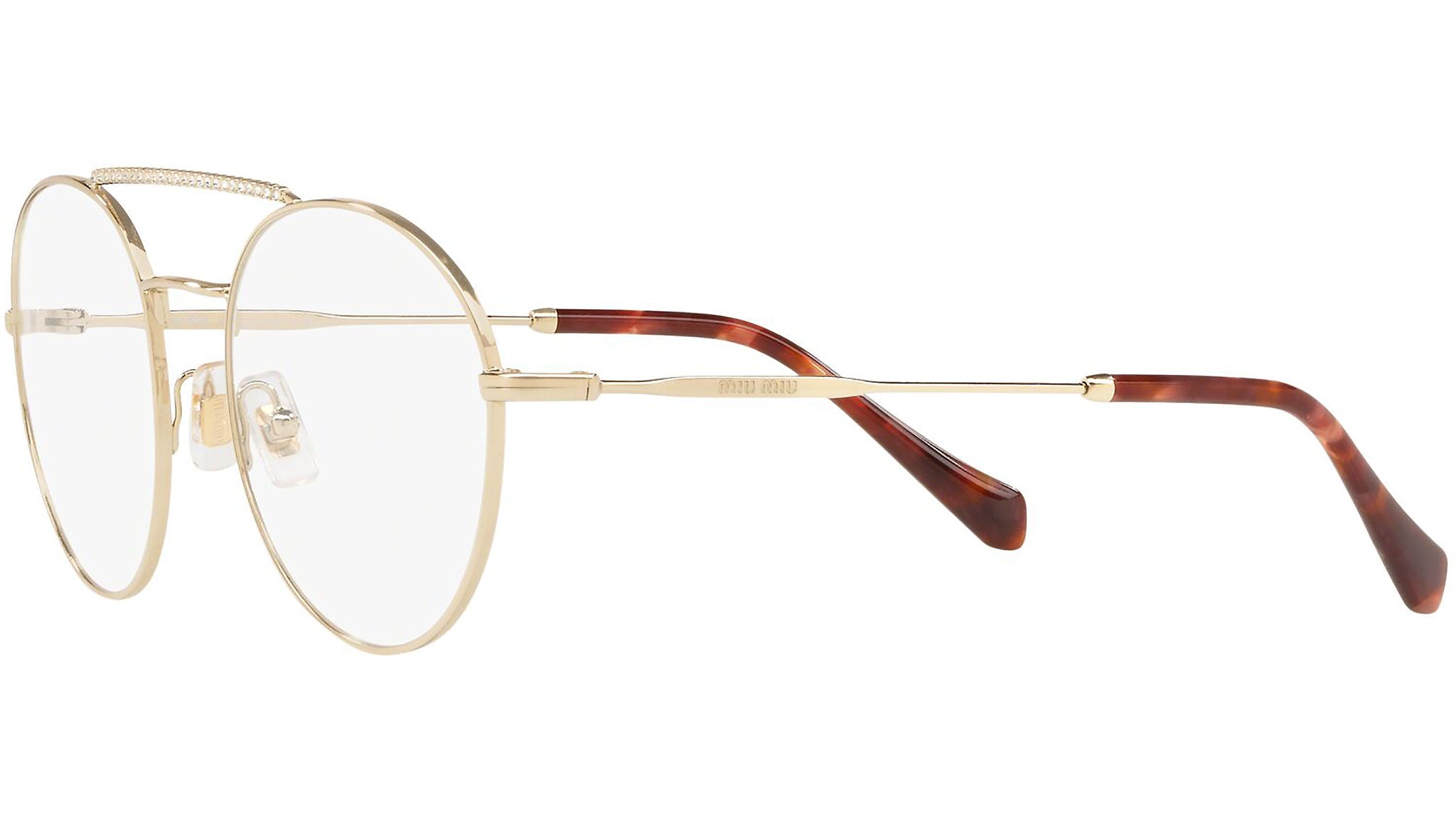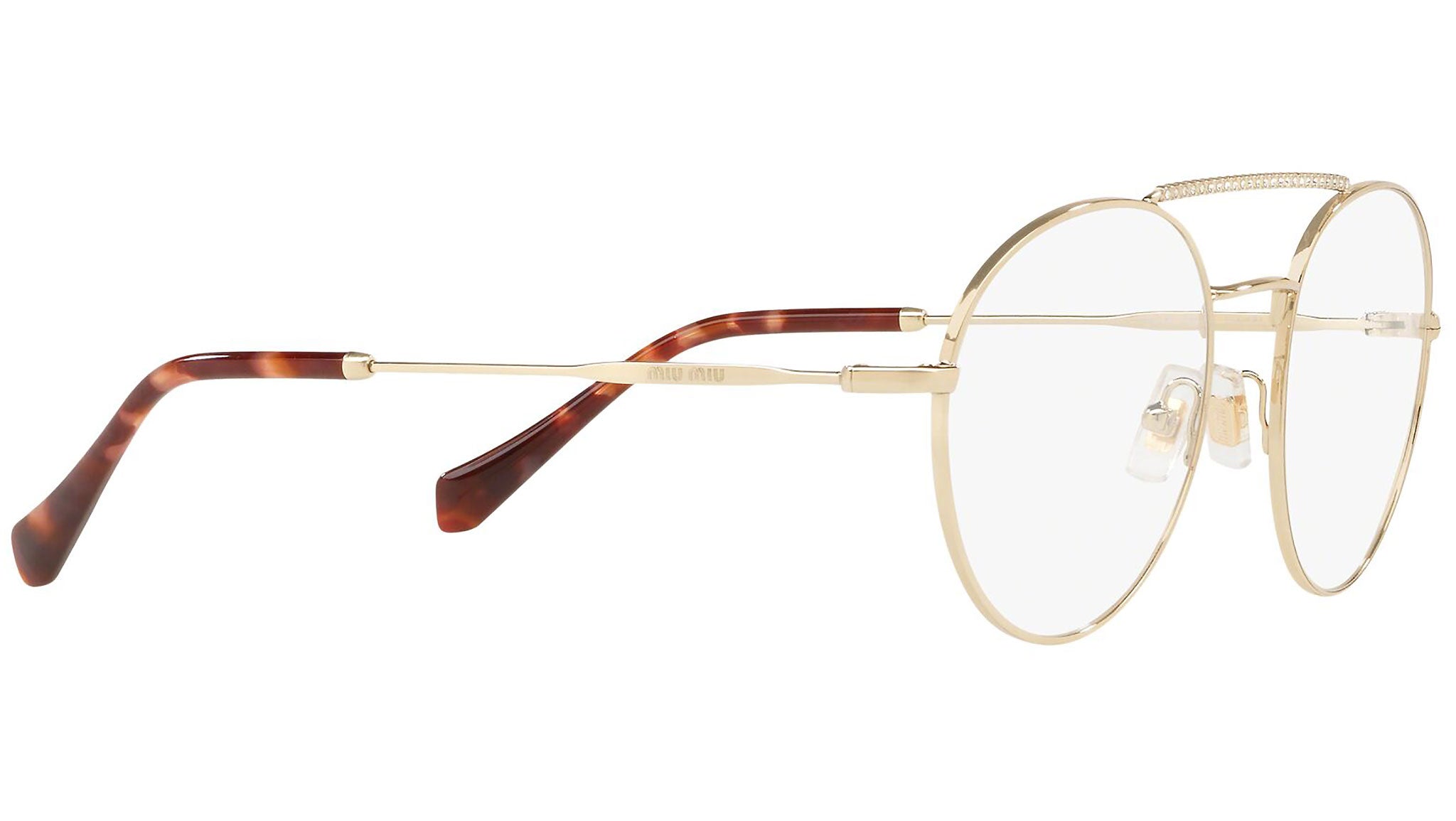 Occhiali da vista Miu Miu modello MU 51RV variante colore ZVN1O1 oro chiaro. Miu Miu offre creazioni uniche, in cui la costante ricerca stilistica si combina perfettamente con la maestria artigianale della lavorazione. Le silhouette femminili e sinuose delle montature sono espressione di una ricchezza dei dettagli che rispecchia pienamente i codici stilistici e l’indiscusso talento del brand nell’unire il design non convenzionale ad un romanticismo dai rimandi retrò.