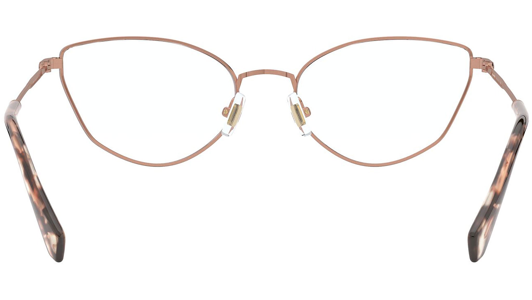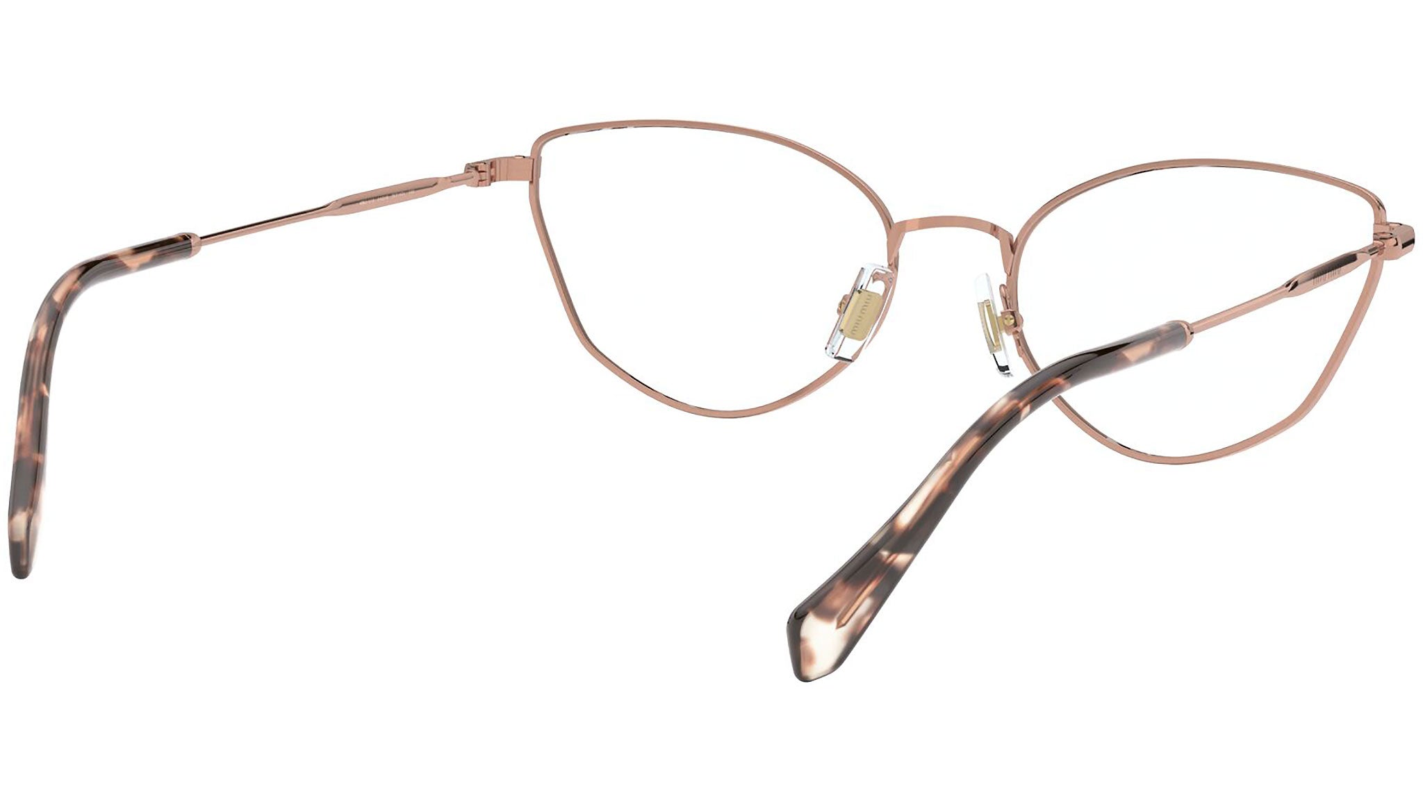 Occhiali da vista Miu Miu modello MU 51SV variante colore YEP1O1 oro rosa e bluastro. Miu Miu offre creazioni uniche, in cui la costante ricerca stilistica si combina perfettamente con la maestria artigianale della lavorazione. Le silhouette femminili e sinuose delle montature sono espressione di una ricchezza dei dettagli che rispecchia pienamente i codici stilistici e l’indiscusso talento del brand nell’unire il design non convenzionale ad un romanticismo dai rimandi retrò.