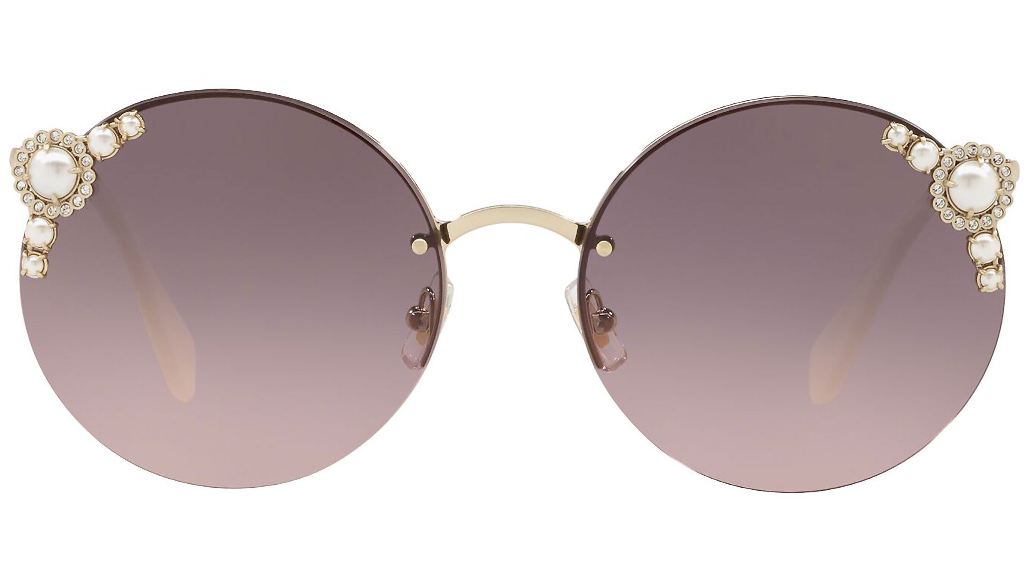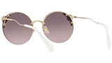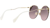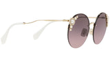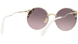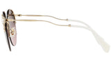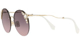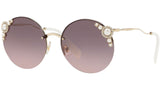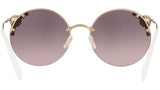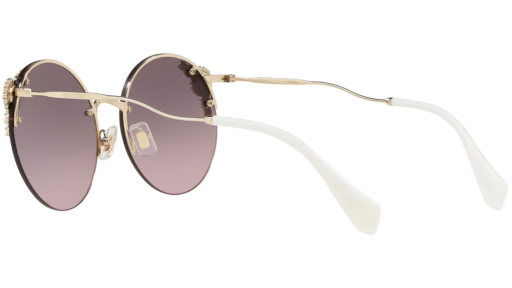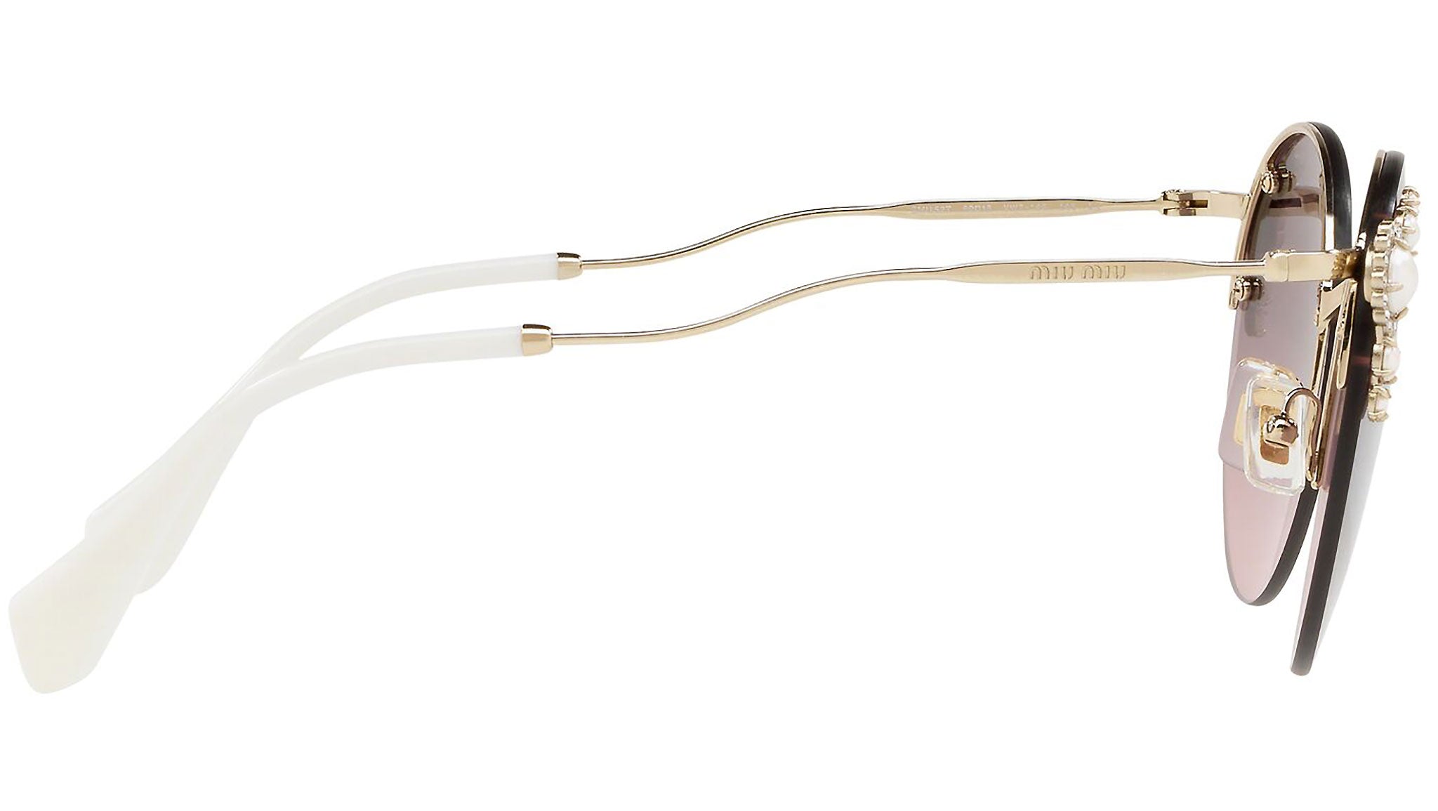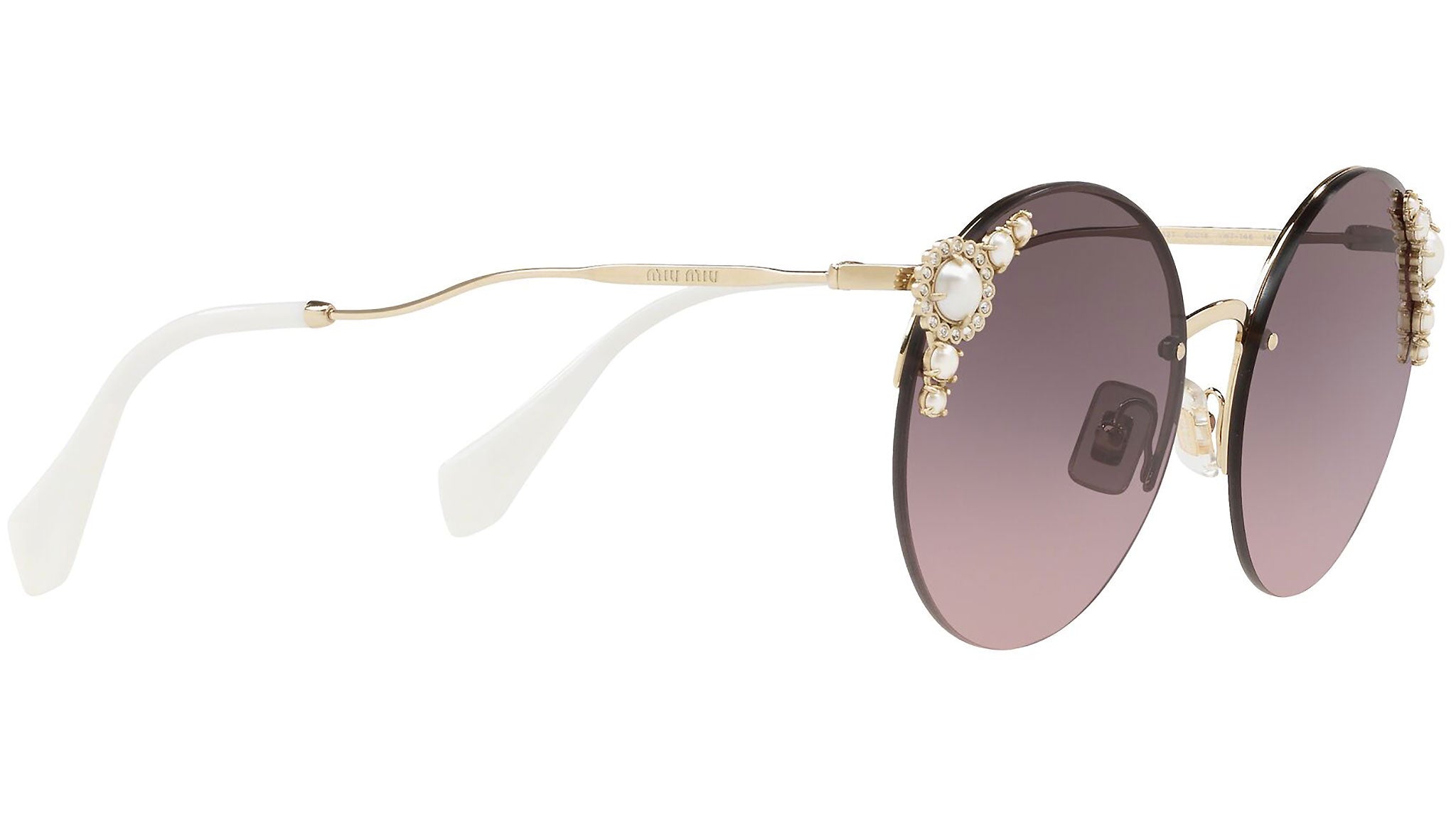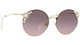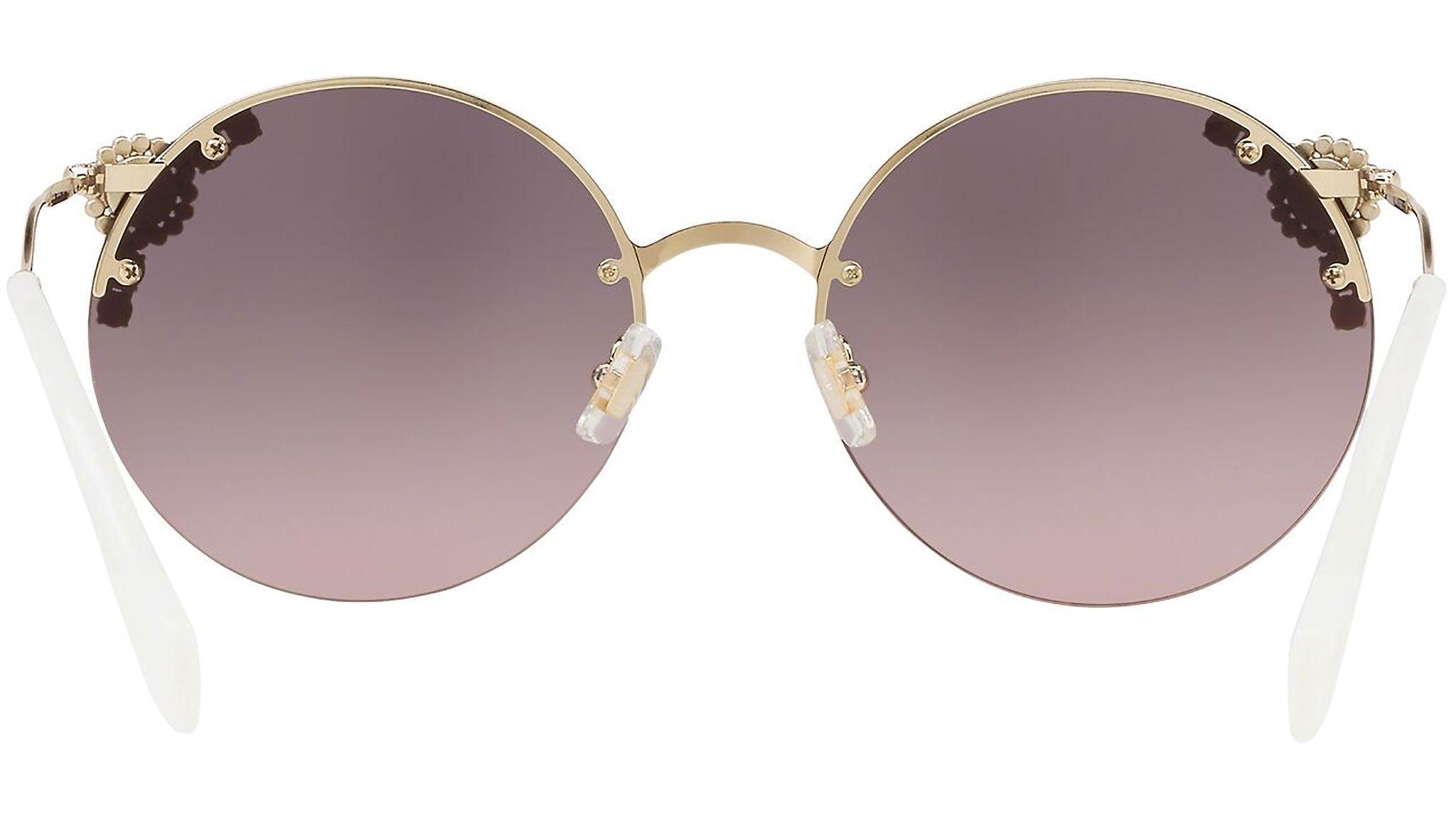 Occhiali da sole Miu Miu modello MU 52TS variante colore VW7146 oro chiaro, con lenti color rosa sfumato grigio. Miu Miu offre creazioni uniche, in cui la costante ricerca stilistica si combina perfettamente con la maestria artigianale della lavorazione. Le silhouette femminili e sinuose delle montature sono espressione di una ricchezza dei dettagli che rispecchia pienamente i codici stilistici e l’indiscusso talento del brand nell’unire il design non convenzionale ad un romanticismo dai rimandi retrò.