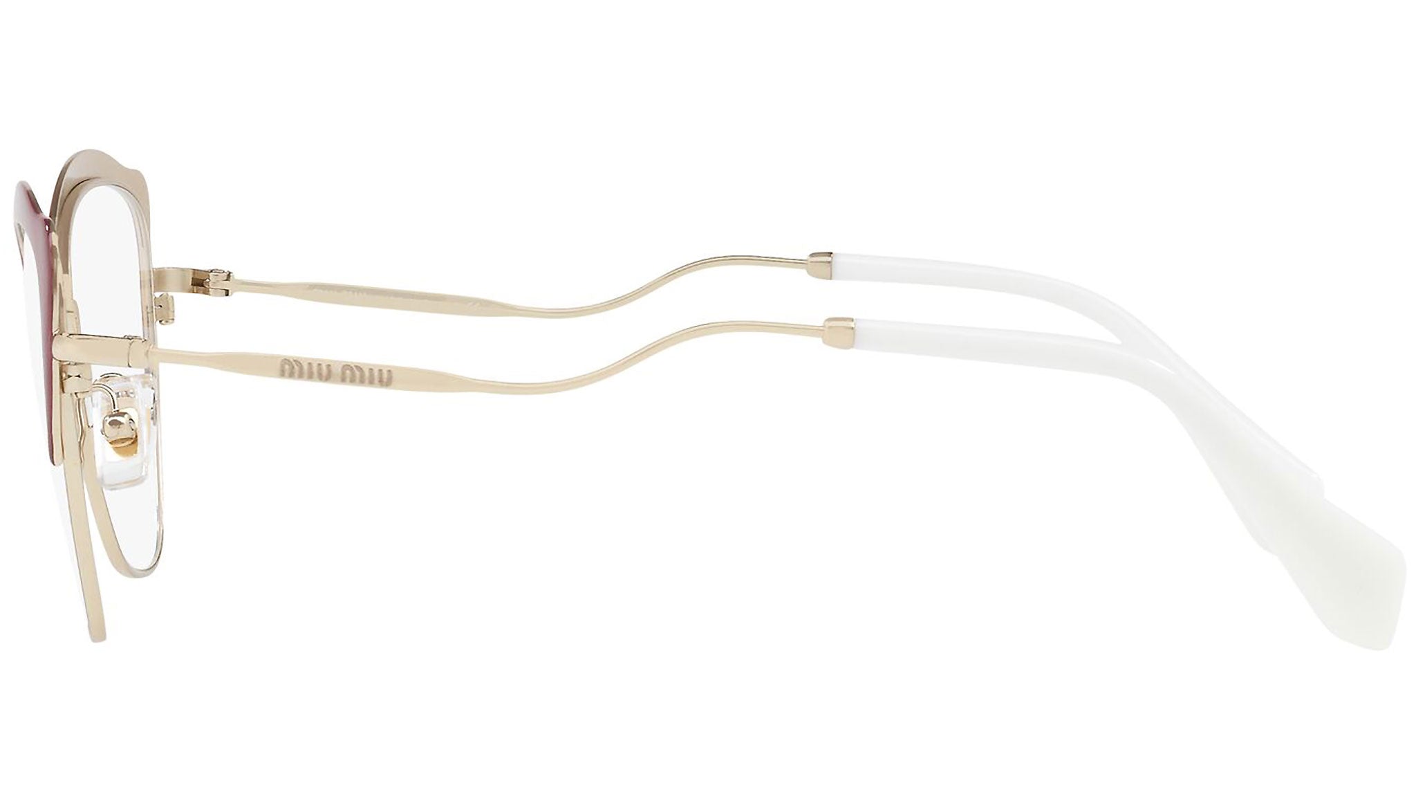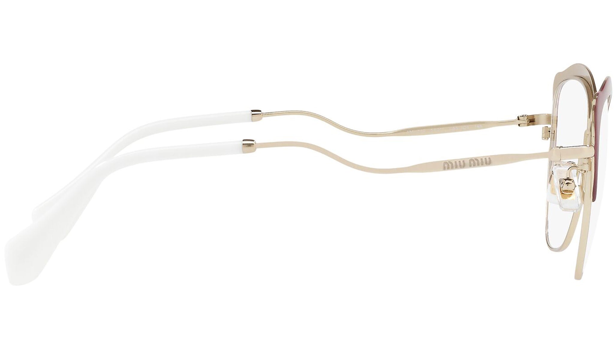 Occhiali da vista Miu Miu modello MU 54PV variante colore UA51O1 bordeaux e oro chiaro. Miu Miu offre creazioni uniche, in cui la costante ricerca stilistica si combina perfettamente con la maestria artigianale della lavorazione. Le silhouette femminili e sinuose delle montature sono espressione di una ricchezza dei dettagli che rispecchia pienamente i codici stilistici e l’indiscusso talento del brand nell’unire il design non convenzionale ad un romanticismo dai rimandi retrò.