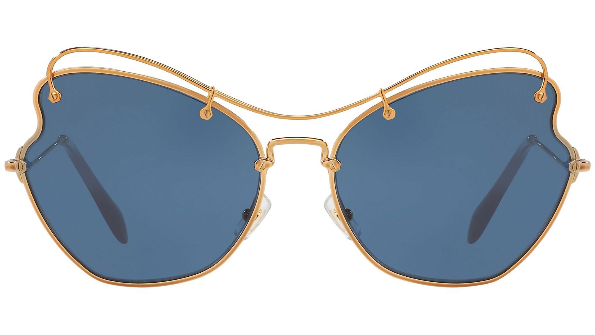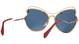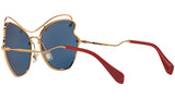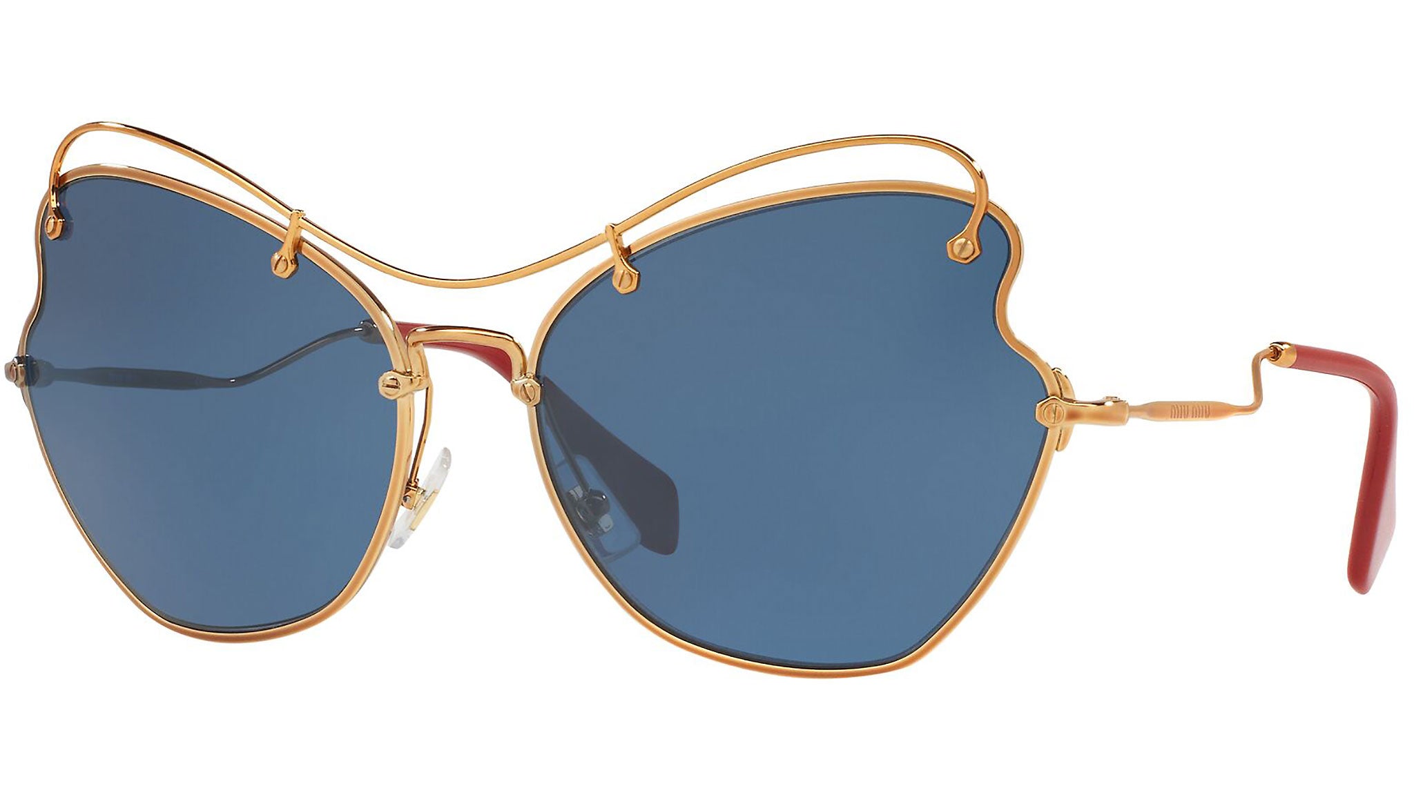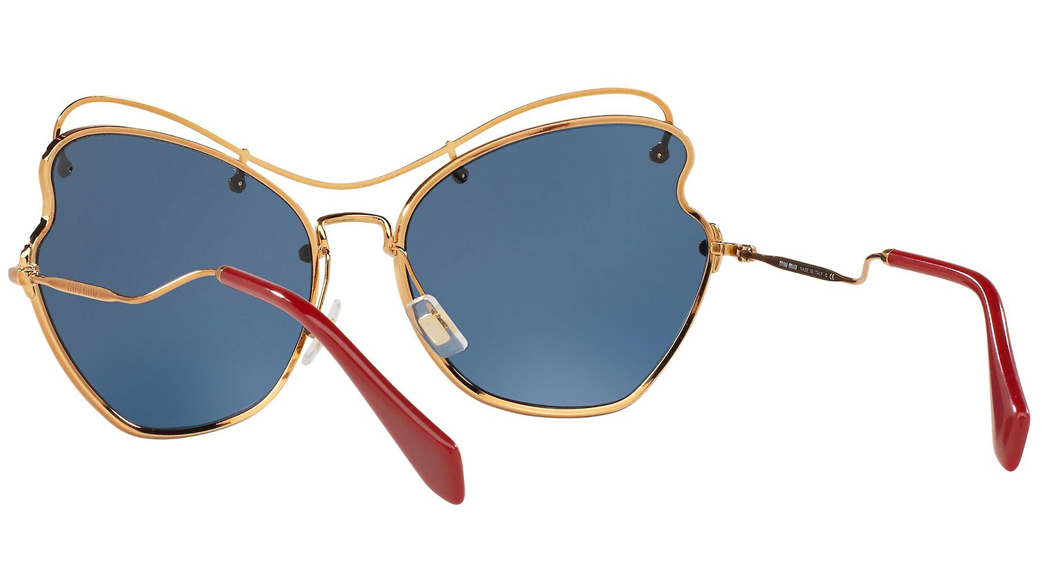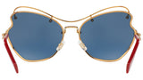 Occhiali da sole Miu Miu modello MU 56RS variante colore 7OE1V1 oro anticato, con lenti color blu. Miu Miu offre creazioni uniche, in cui la costante ricerca stilistica si combina perfettamente con la maestria artigianale della lavorazione. Le silhouette femminili e sinuose delle montature sono espressione di una ricchezza dei dettagli che rispecchia pienamente i codici stilistici e l’indiscusso talento del brand nell’unire il design non convenzionale ad un romanticismo dai rimandi retrò.