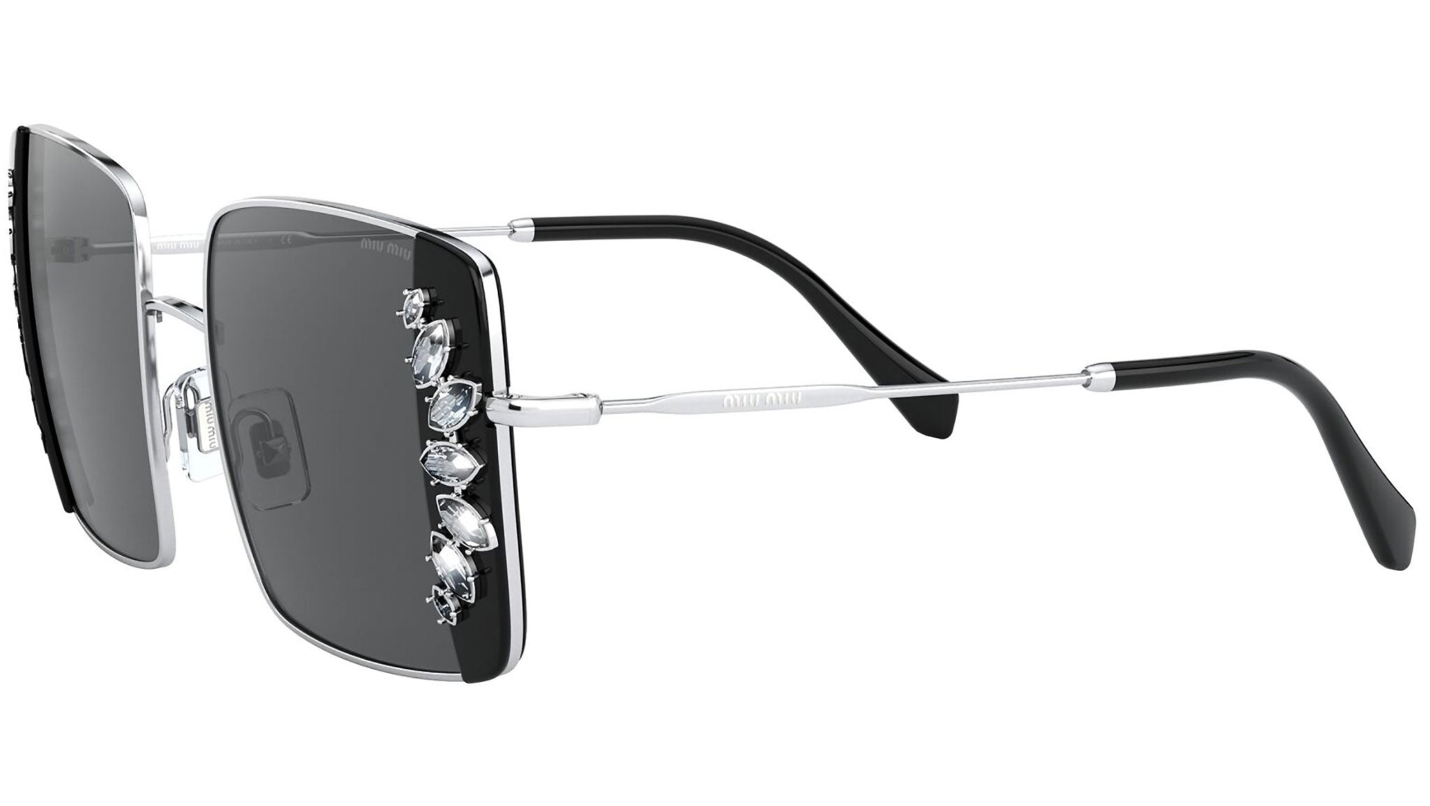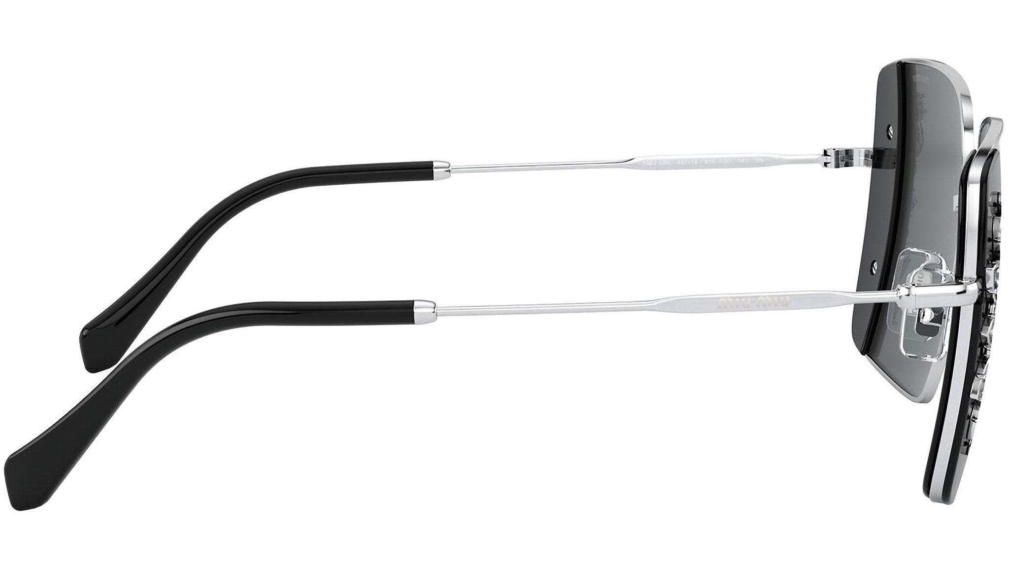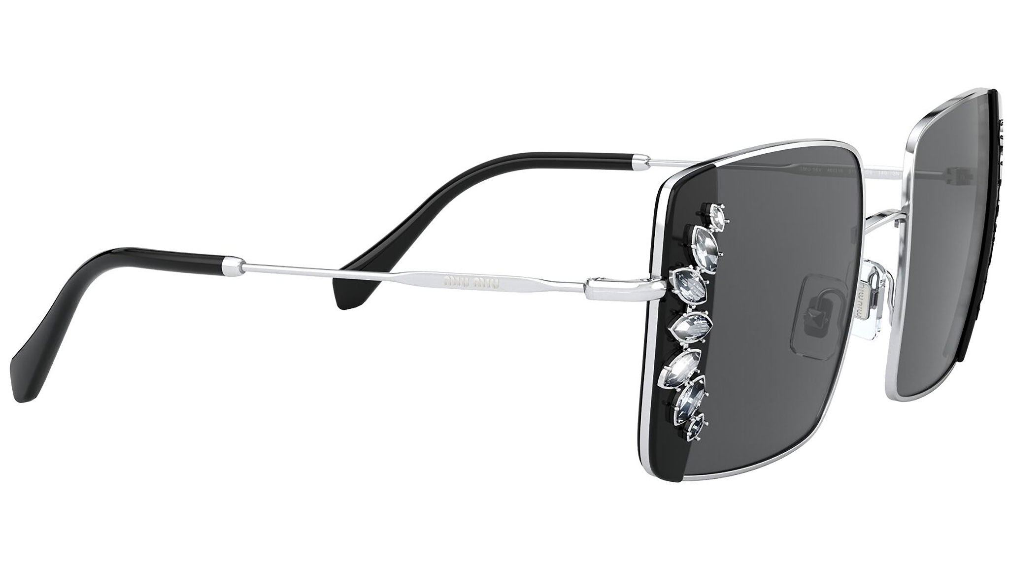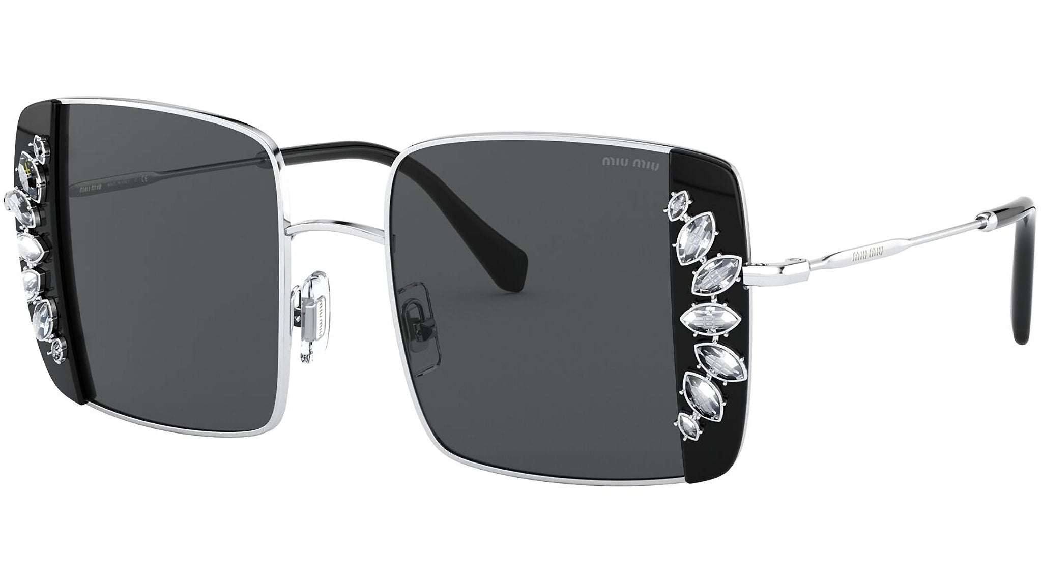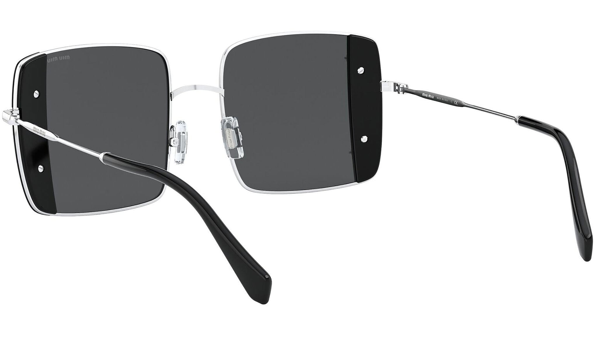 Occhiali da sole Miu Miu modello MU 56VS variante colore 01E5S0 argento e nero, con lenti color grigio scuro. Miu Miu offre creazioni uniche, in cui la costante ricerca stilistica si combina perfettamente con la maestria artigianale della lavorazione. Le silhouette femminili e sinuose delle montature sono espressione di una ricchezza dei dettagli che rispecchia pienamente i codici stilistici e l’indiscusso talento del brand nell’unire il design non convenzionale ad un romanticismo dai rimandi retrò.