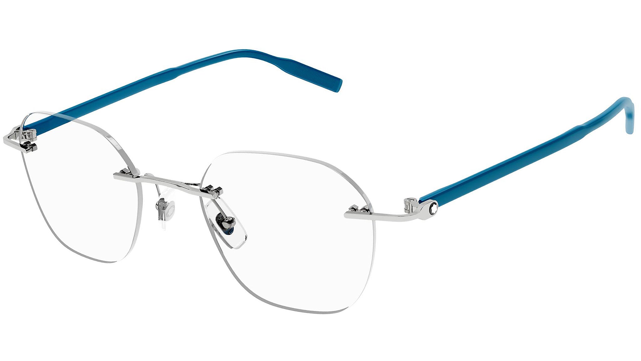Occhiali da vista Montblanc linea Established modello 0223O, variante colore 005 argento lucido con astine color blu. Nella sua storia, Montblanc ha rivoluzionato la cultura della scrittura, con innovazioni straordinarie. Oggi, la Maison continua a spingersi oltre i confini, progredendo nell'espressione di un artigianato raffinato, in ciascuna delle sue categorie di prodotti: ai vertici negli strumenti di scrittura di lusso, nell'orologeria, nella pelletteria, nei profumi e negli occhiali.