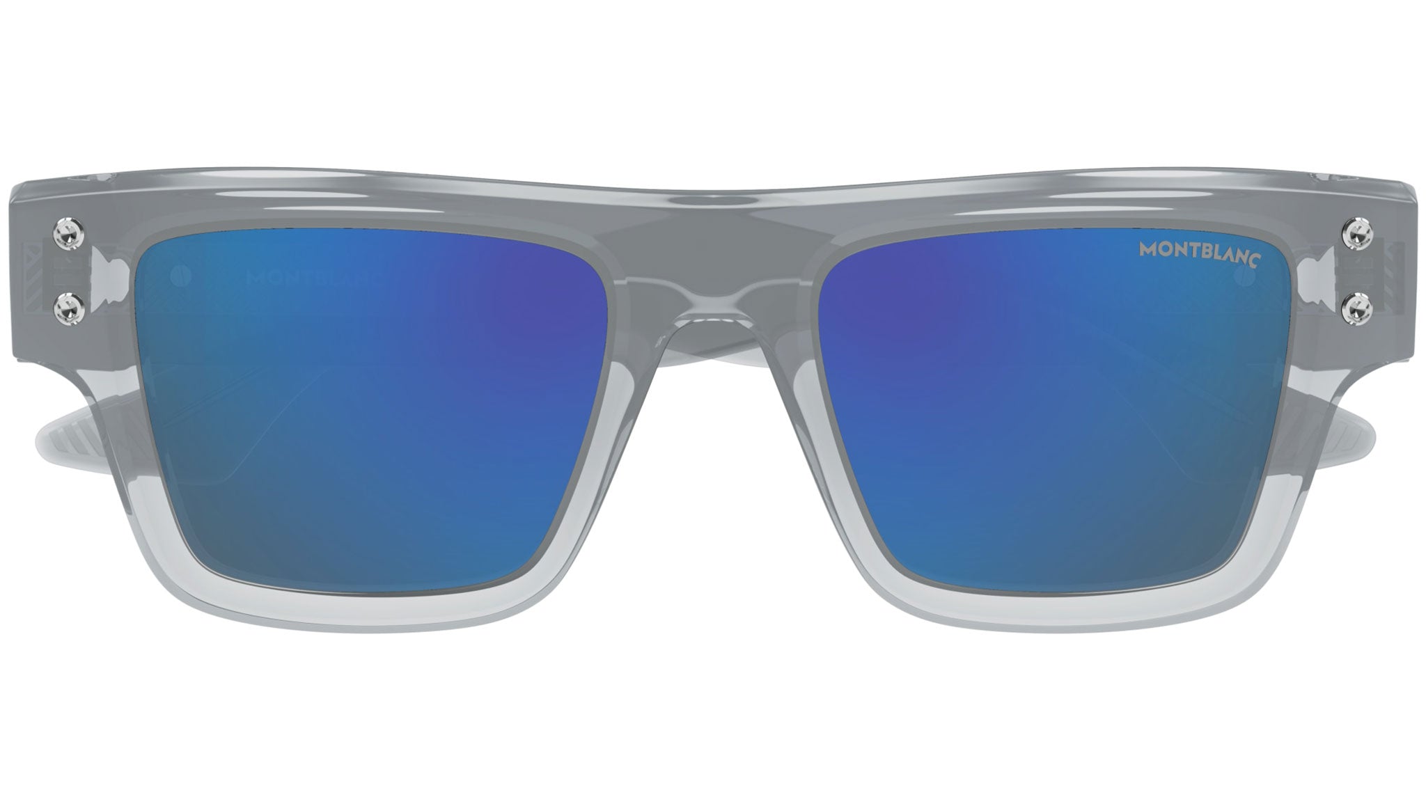 Occhiali da sole Montblanc linea Millennials modello MB0253S variante colore 004 grigio chiaro trasparente lucido con lenti color grigio tinta unita con specchiatura blu.