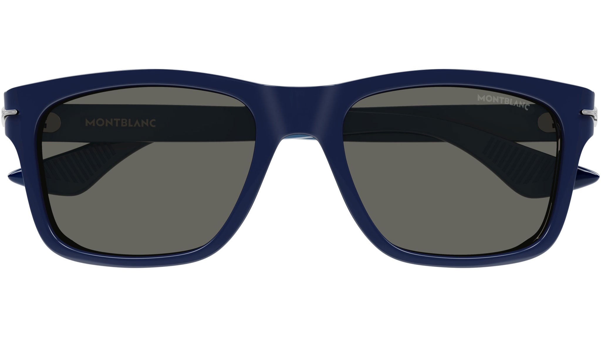 Occhiali da sole Montblanc linea Established modello MB0263S variante colore 004 blu lucido tinta unita con lenti color grigio tinta unita.