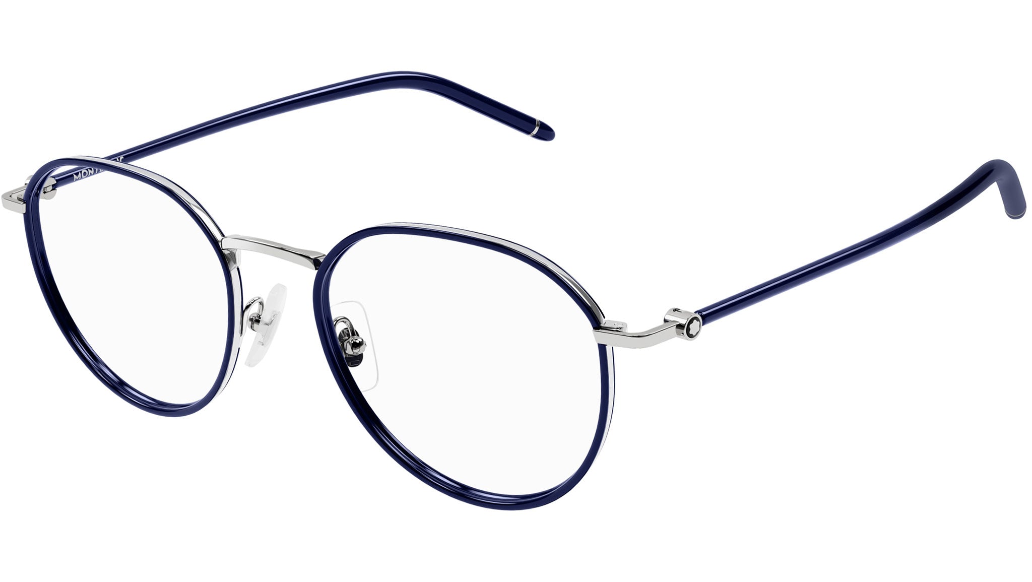 Occhiali da vista Montblanc modello MB0342OA linea Meisterstück forma panto in metallo, codice colore 004 argento lucido / rim verde acqua scuro con aste color blu e lenti demo.
