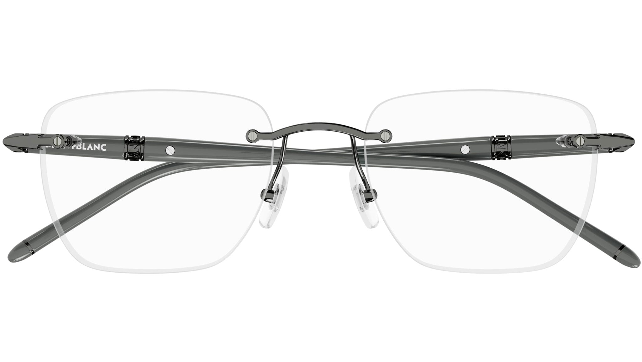 Occhiali da vista Montblanc modello MB0346O linea Meisterstück forma rettangolare in metallo, codice colore 003 rutenio scuro lucido con aste color grigio e lenti demo.
