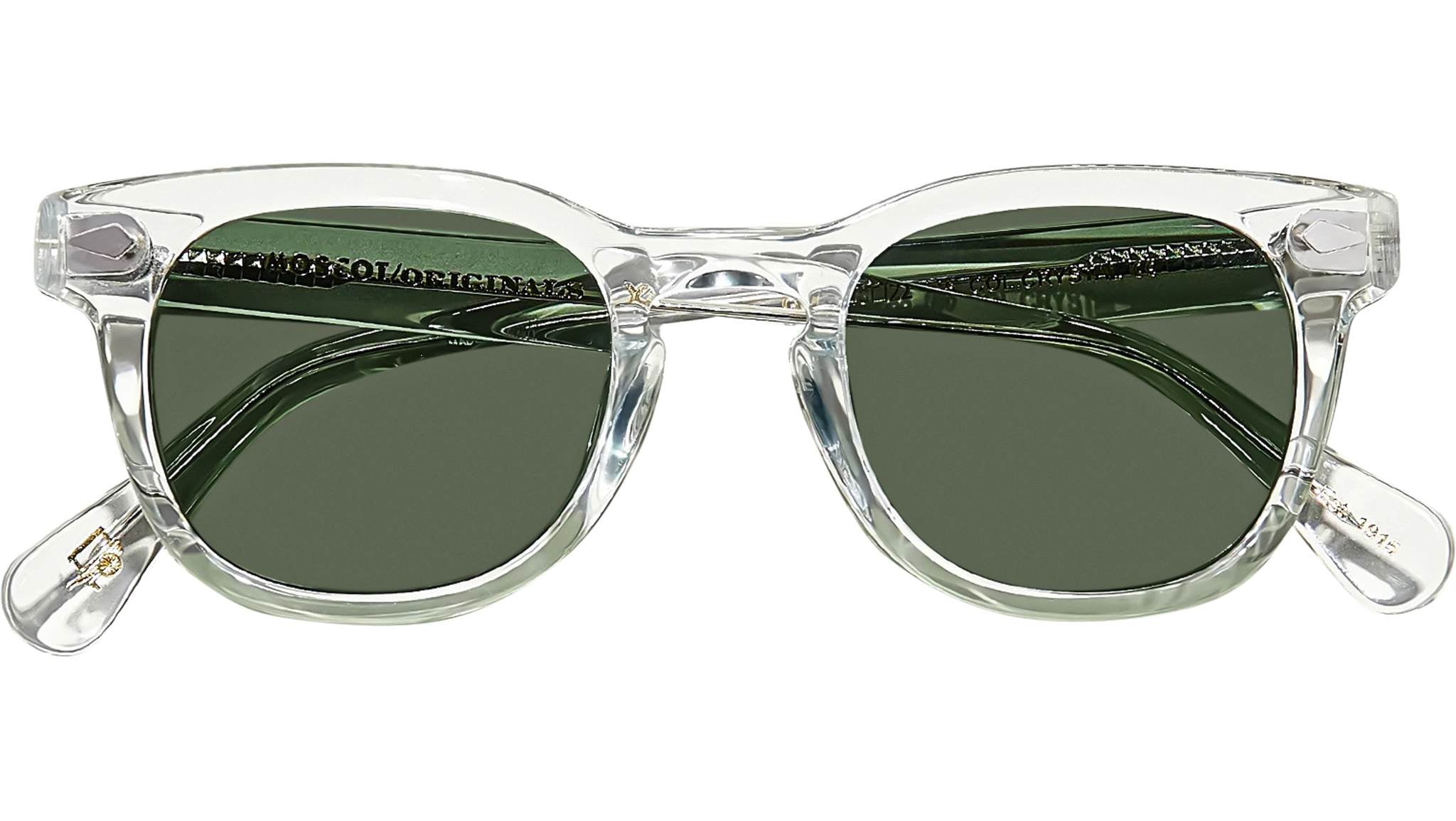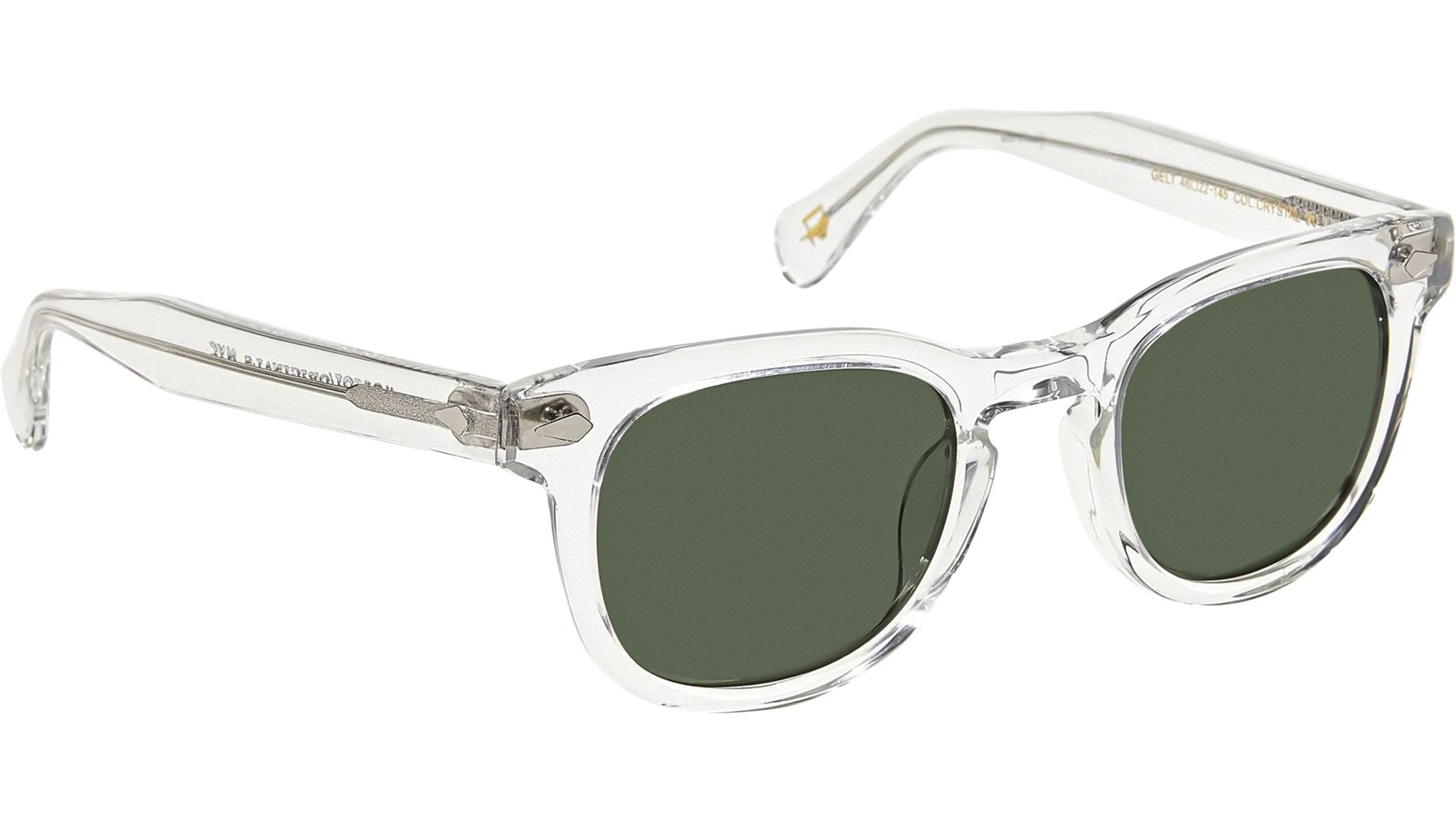 Occhiali da sole Moscot Gelt Sun unisex con montatura squadrata in acetato cristallo e lenti verde G-15. Linea: Originals. Codice modello: Gelt Sun. Codice colore: 0306. Rivenditore autorizzato Moscot online. Gli occhiali vengono consegnati con custodia e accessori originali e sono coperti dalla garanzia ufficiale di 12 mesi del produttore.