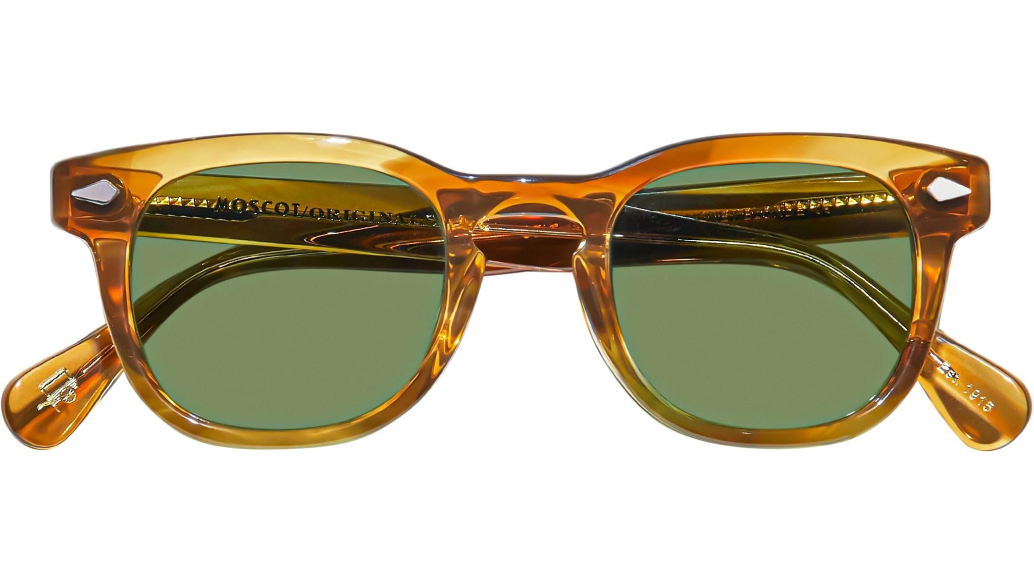 Occhiali da sole Moscot Gelt Sun unisex con montatura squadrata in acetato biondo miele e lenti verde calibar. Linea: Originals. Codice modello: Gelt Sun. Codice colore: 0804. Rivenditore autorizzato Moscot online. Gli occhiali vengono consegnati con custodia e accessori originali e sono coperti dalla garanzia ufficiale di 12 mesi del produttore.