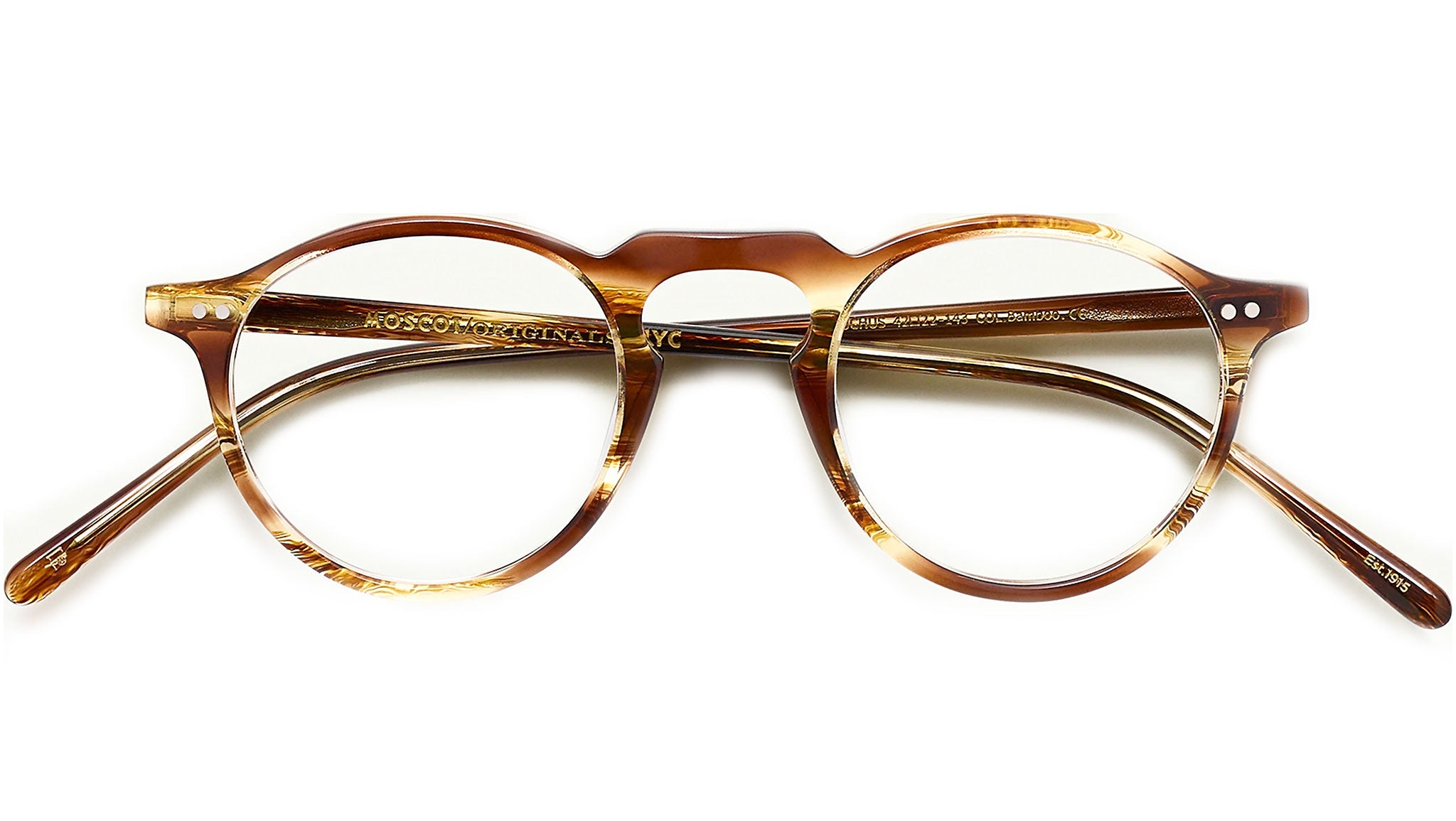 Handcrafted using Italian acetate featuring unique patterns distinctive to each frame. Features two dot rivets. Comfortable key hole nose bridge. Includes acetate nose pads. 3-Barrel hinge. Moscot temple engravings.