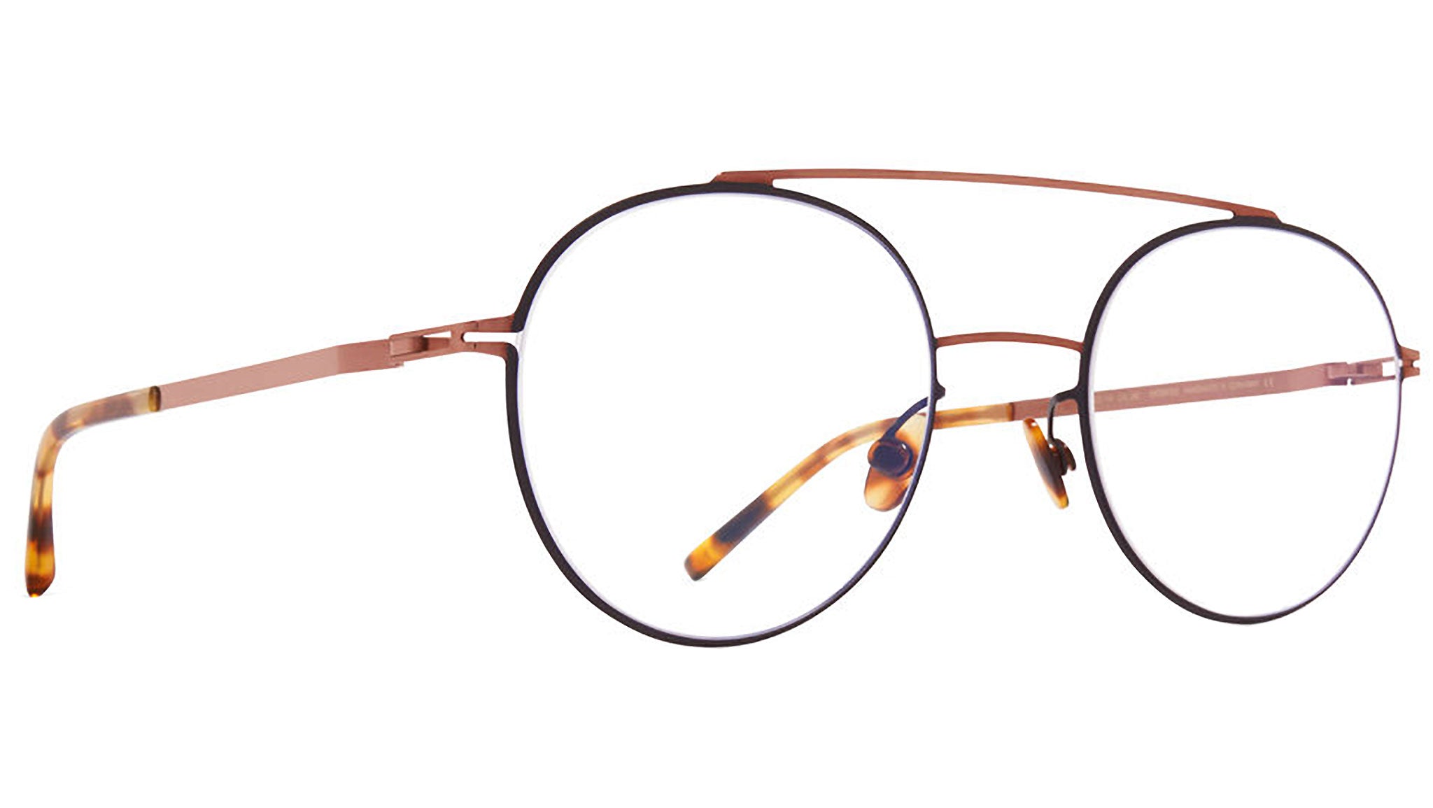 Made of lightweight stainless steel and slender acetate, ALMETA in Shiny Copper/Black with Clear lenses is a Panto shaped optical frame from the MYKITA LITE ACETATE collection. Handcrafted in Berlin.