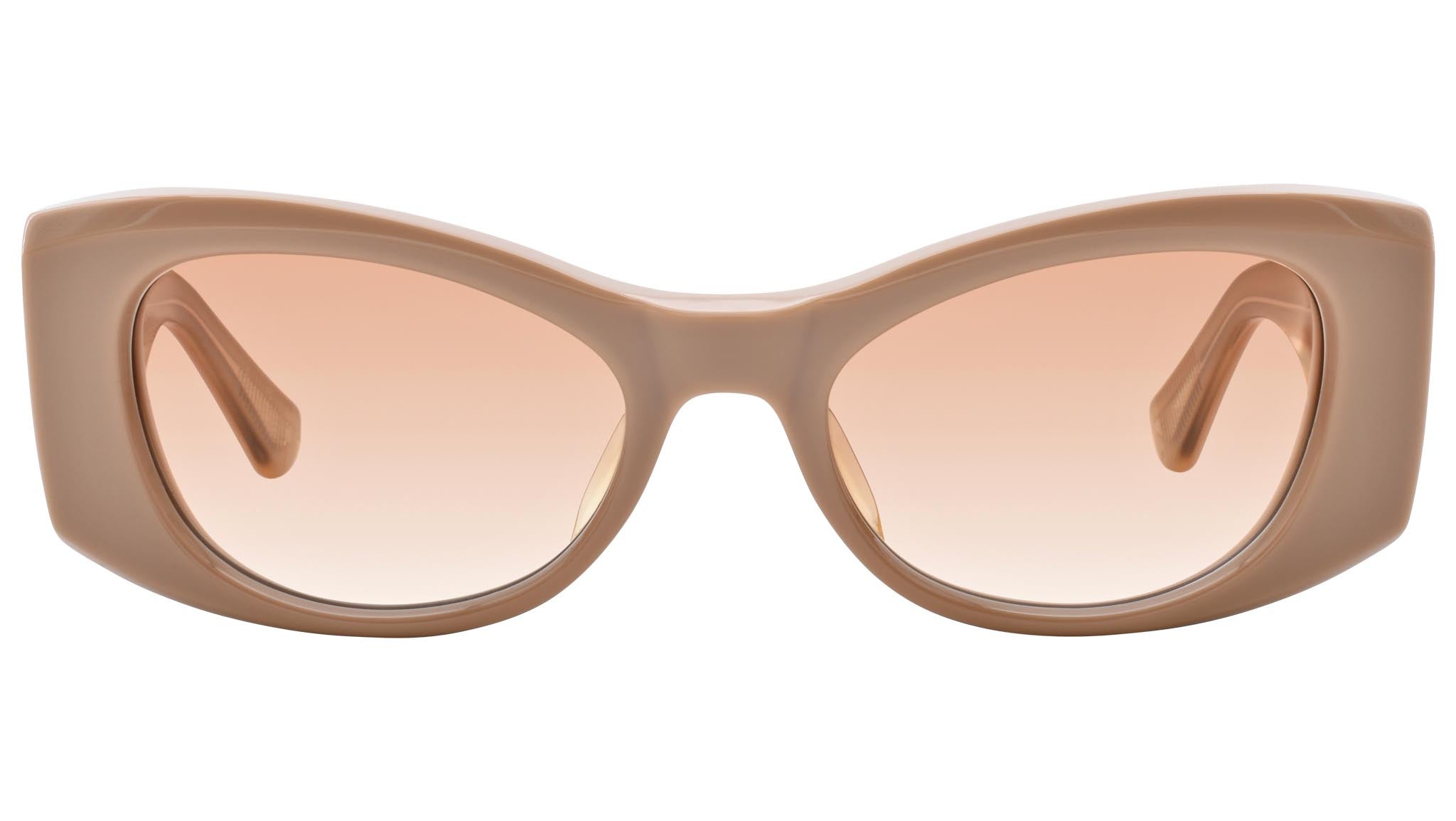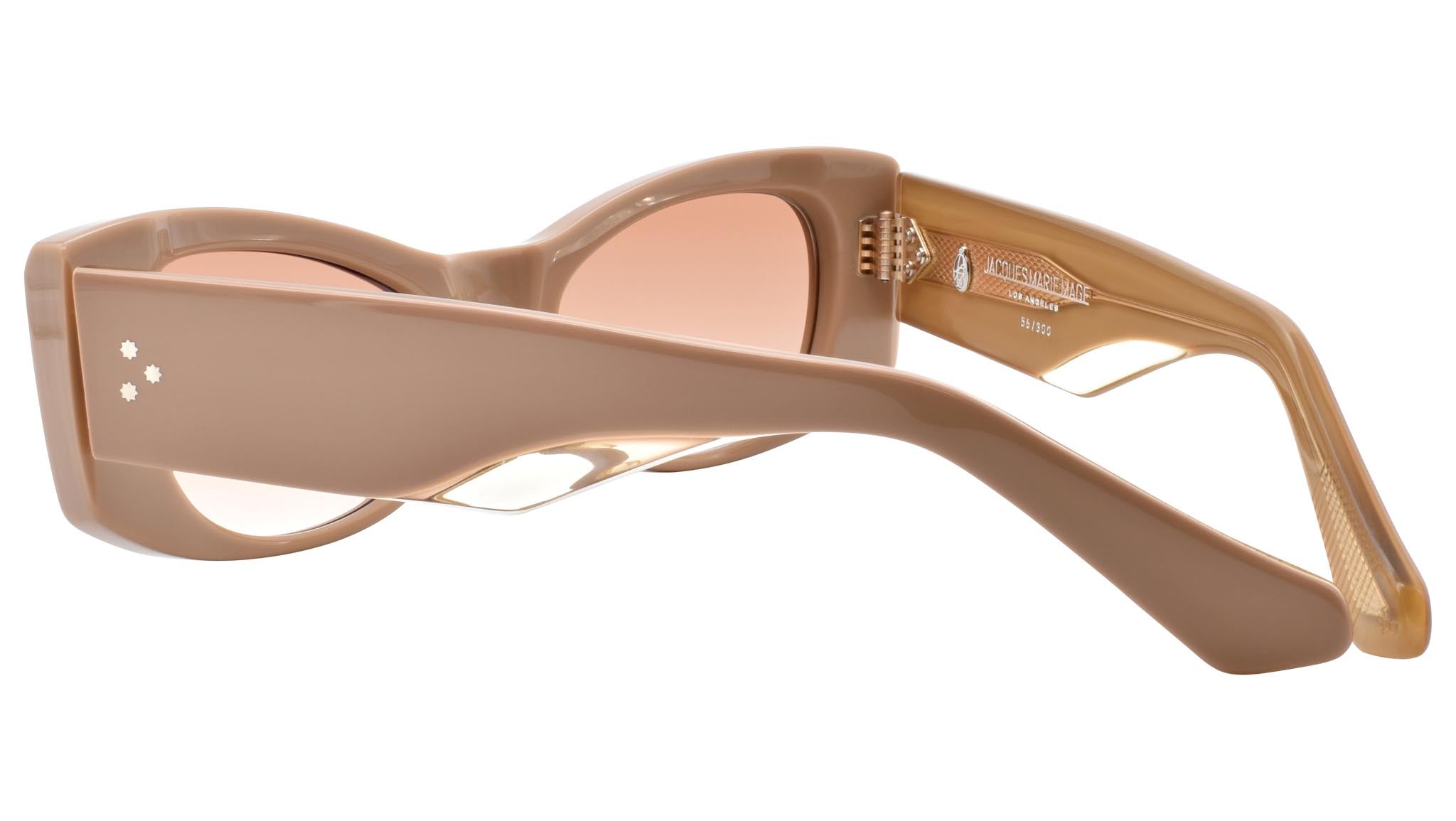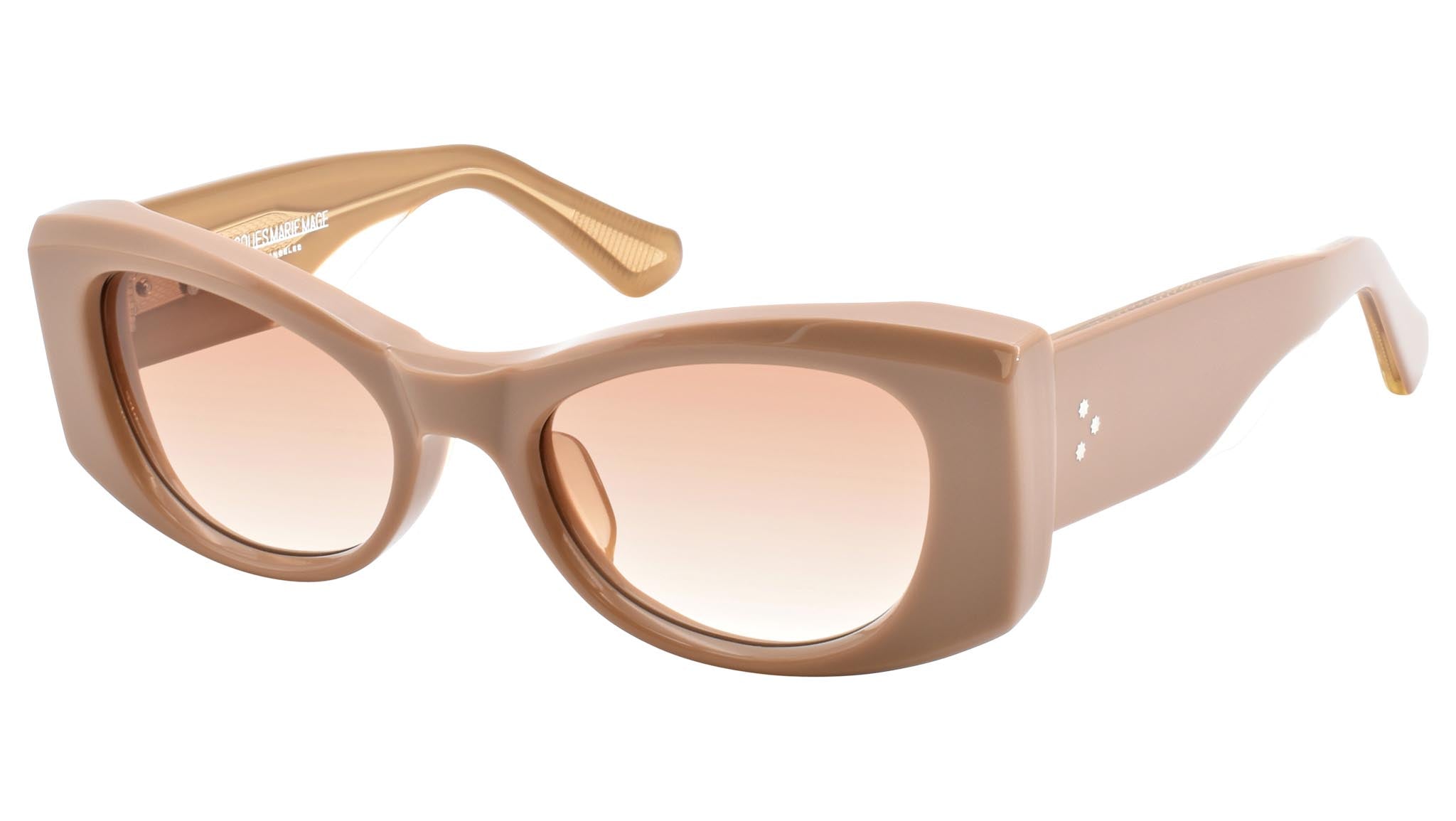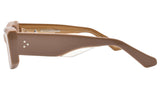 Beige 10 mm cured cellulose acetate frame. Custom double laminated acetate temples, featuring precious metal hardware and brown lenses. Exposed outer temple, dark gold custom hairline engraved wirecore. Tension-secured custom 9 barrel hinge. Sand CR-39 4 base lens with backside anti-reflective treatment. 100% UV protection.