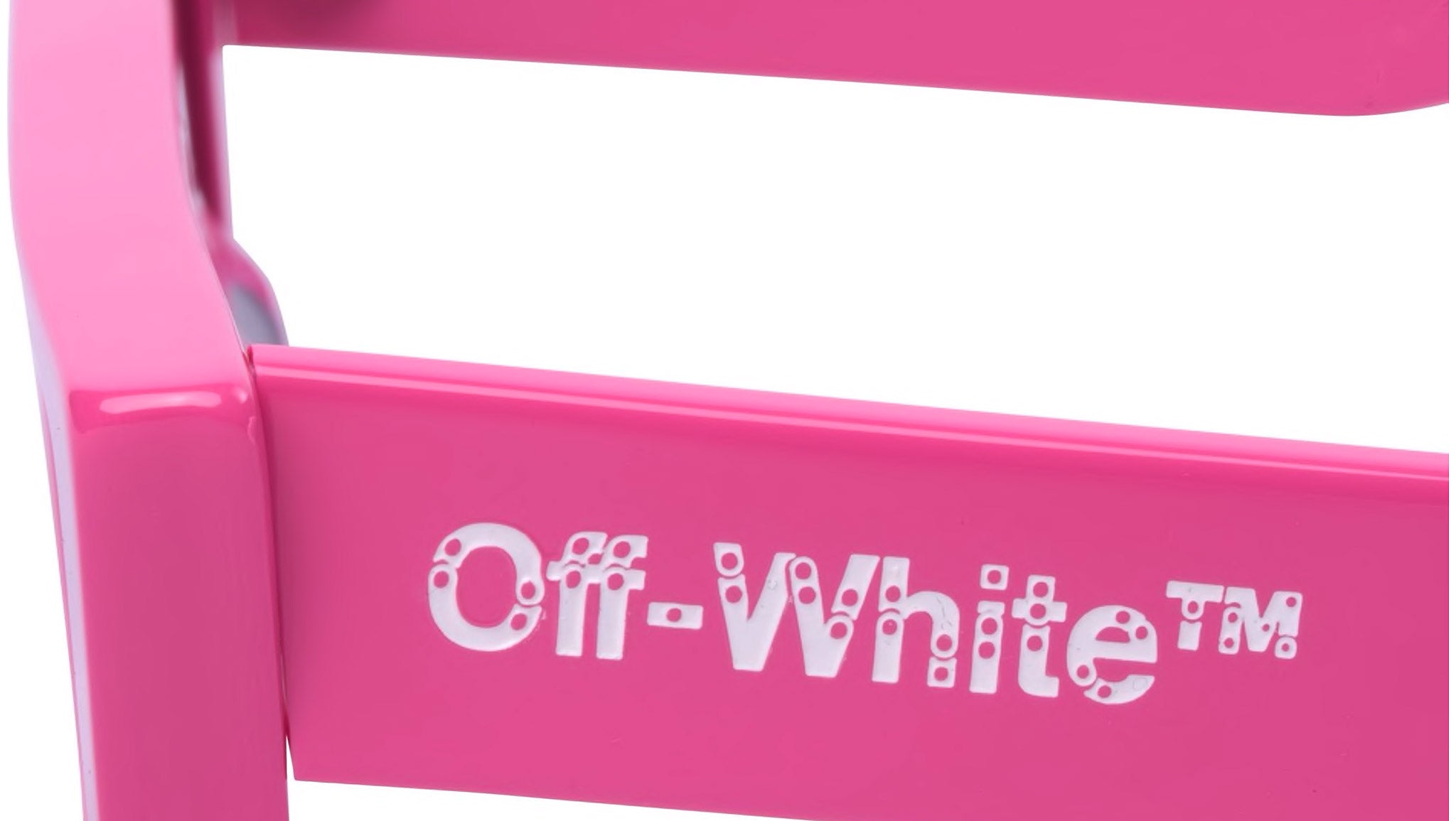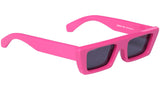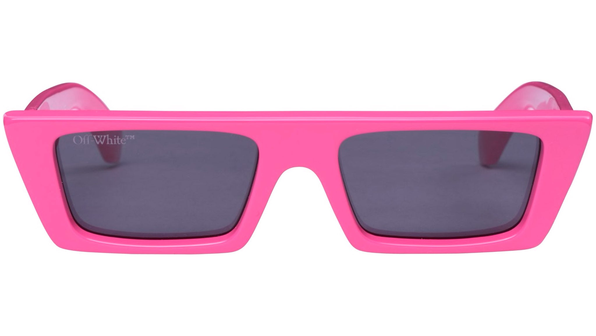 Rectangular frame sunglasses in black with Off-White™ logo in white at hinges. Dark grey lenses. Off-White™ logo etched on lens. Integrated nose pads.