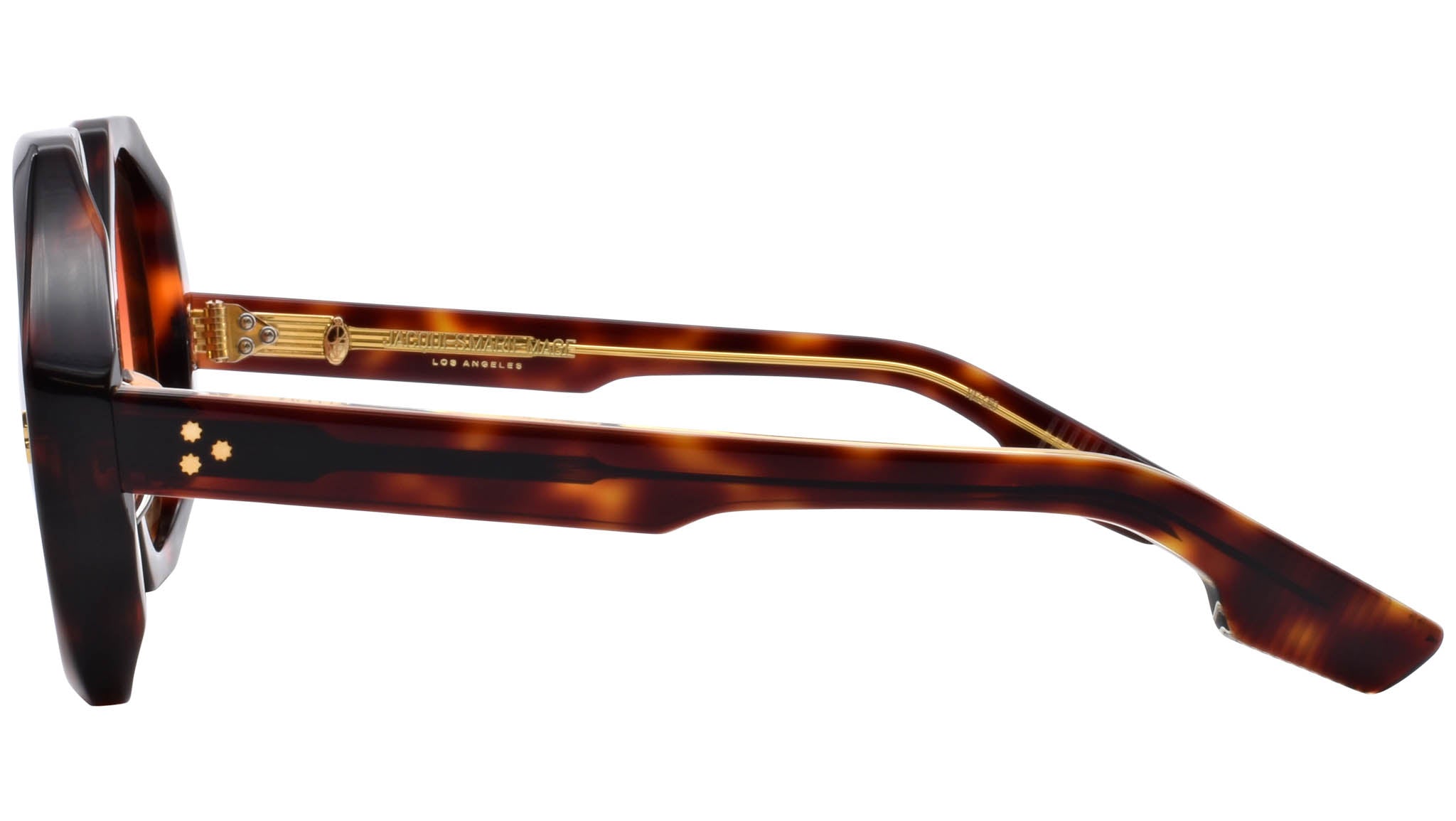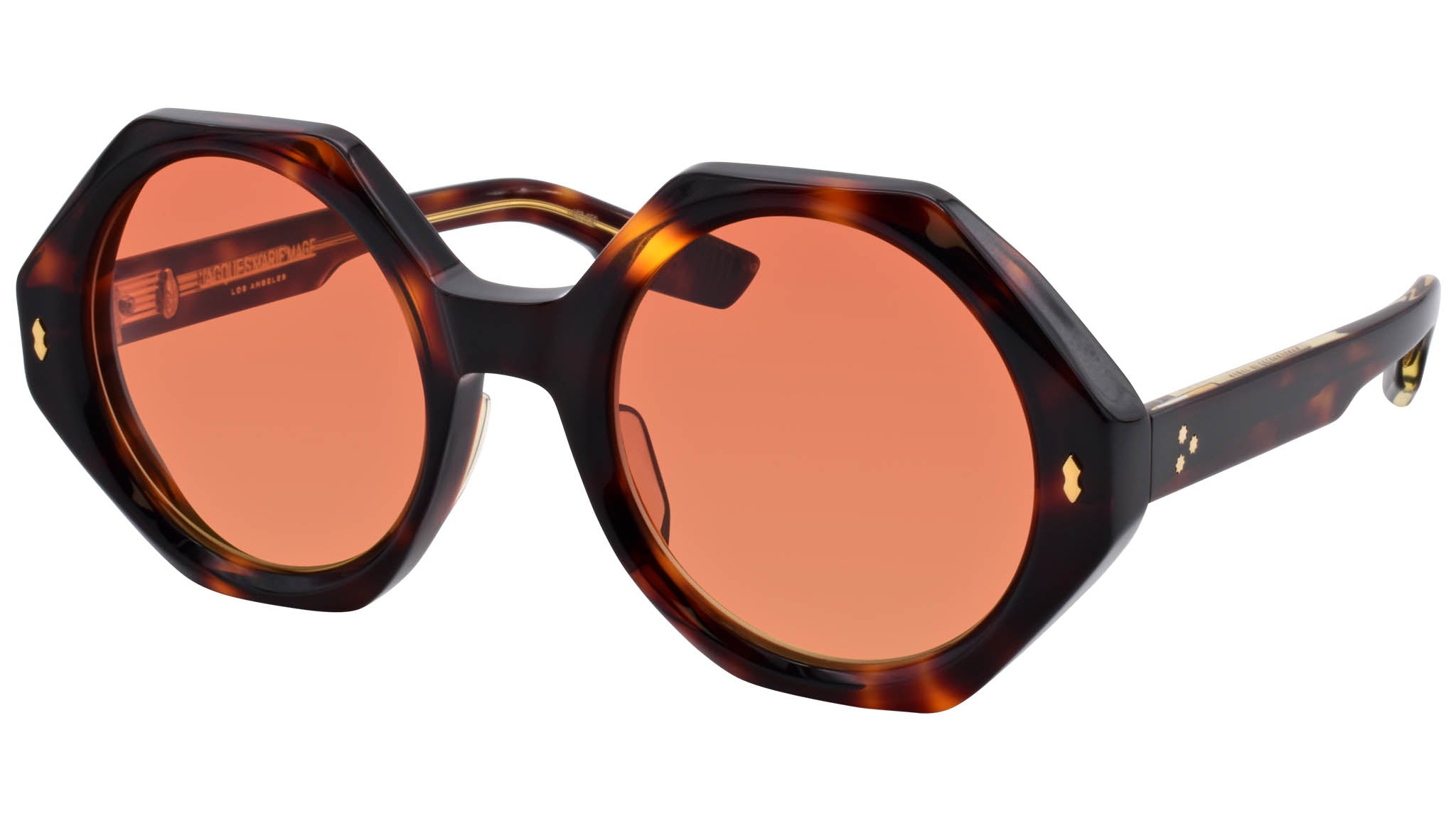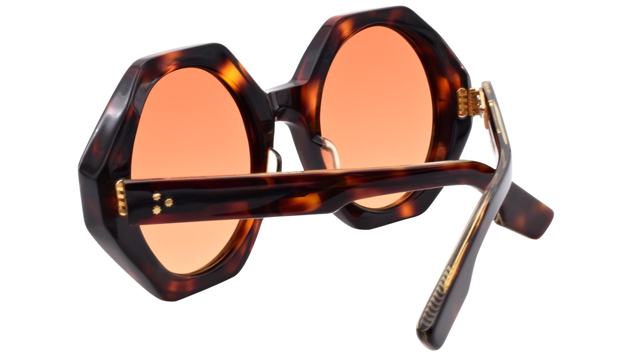 Oversized, feminine, '60s-inspired glasses; a new addition to the Women’s Series. Tortoise 10mm cured cellulose acetate frame. Custom double laminated acetate temples featuring precious metal hardware and red gradient lenses. Dark gold double arrowhead front pin. Dark gold exposed wirecore. Dark gold tension-secured custom 7 barrel hinge. Dark gold domed 3D metal logo. Tropic tri-gradient 8 base CR-39 lens with backside anti-reflective treatment. 100% UV protection.